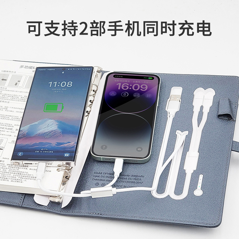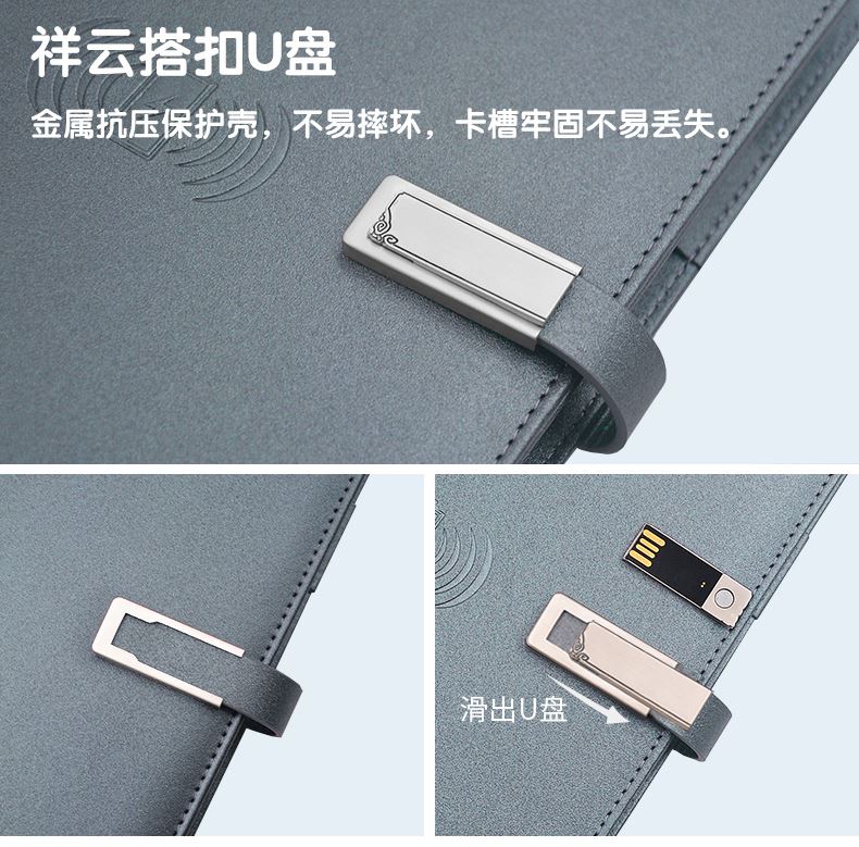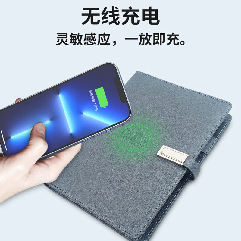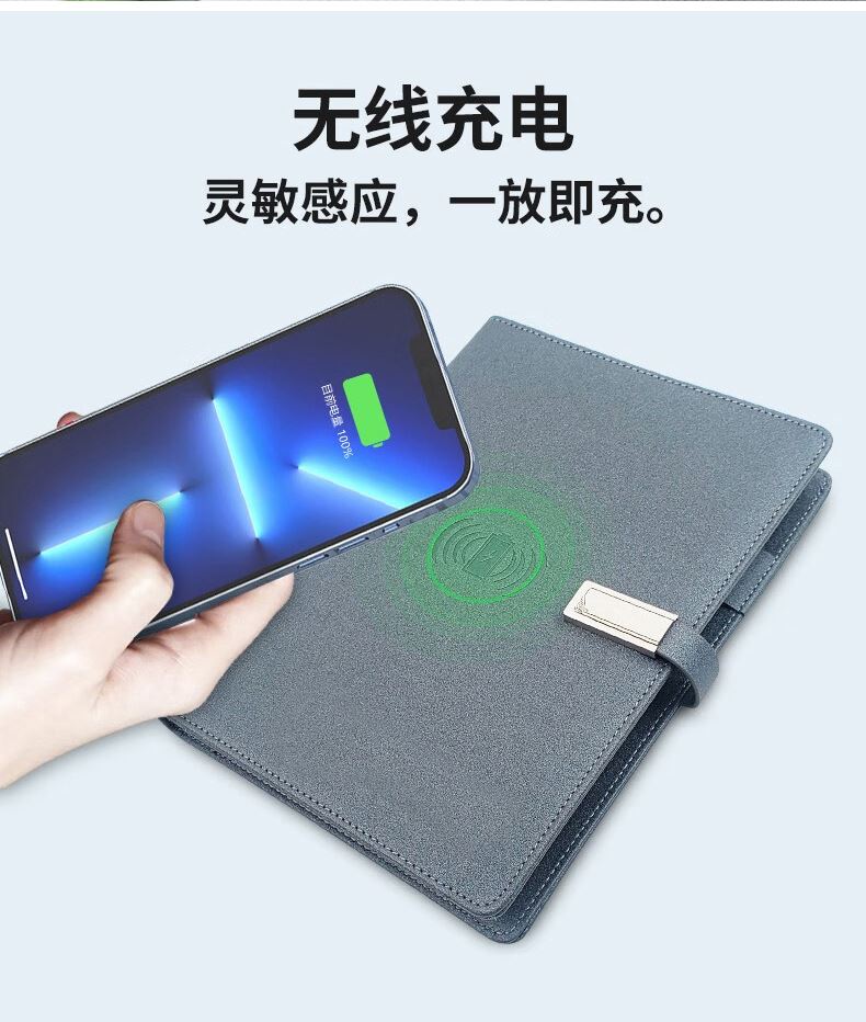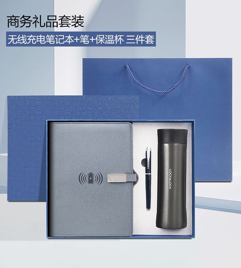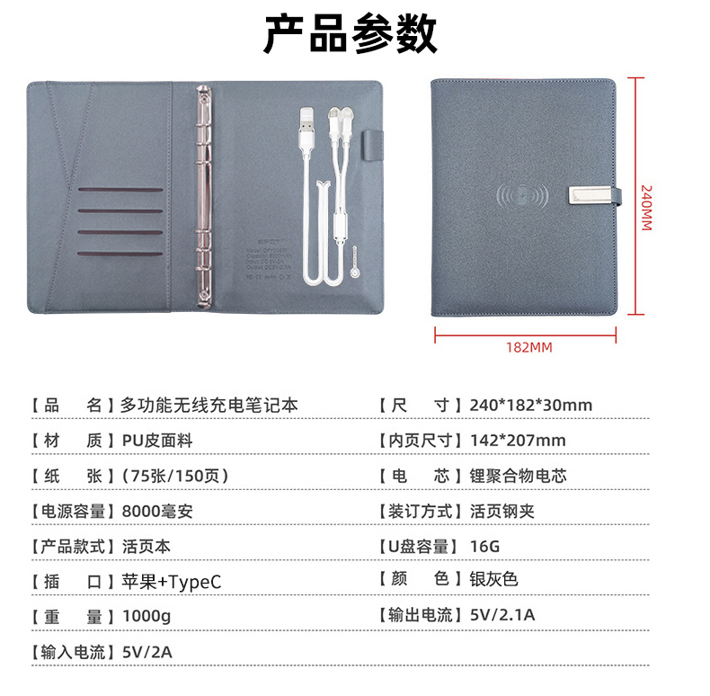银光灰多功能无线充电源笔记本 1、(电源笔记本配置:8000毫安电源+无线充功能+16G搭扣U盘+A5活页本+1拖2充电线) 材质工艺:PU皮 象牙白纸 聚合物电芯 接口:苹果 Type-C 产品尺寸:240*185*30(mm) 2、型号:LHC4028 400ML LOCK&LOCK 保温杯 3、金属烤漆签字笔 4、配精装包装盒+手提袋 5、包装盒尺寸:328x263x75mm 6、手提袋尺寸:335x293x85mm 7、重量:约30KG/套 配置祥云搭扣16GU盘、足容量原装高速芯片 A5活页笔记本、多功能卡位、无线充电 内置8000毫安电源电源,自带Type-C/苹果两种输出线。 可同时给两部手机充电,使用更便捷。