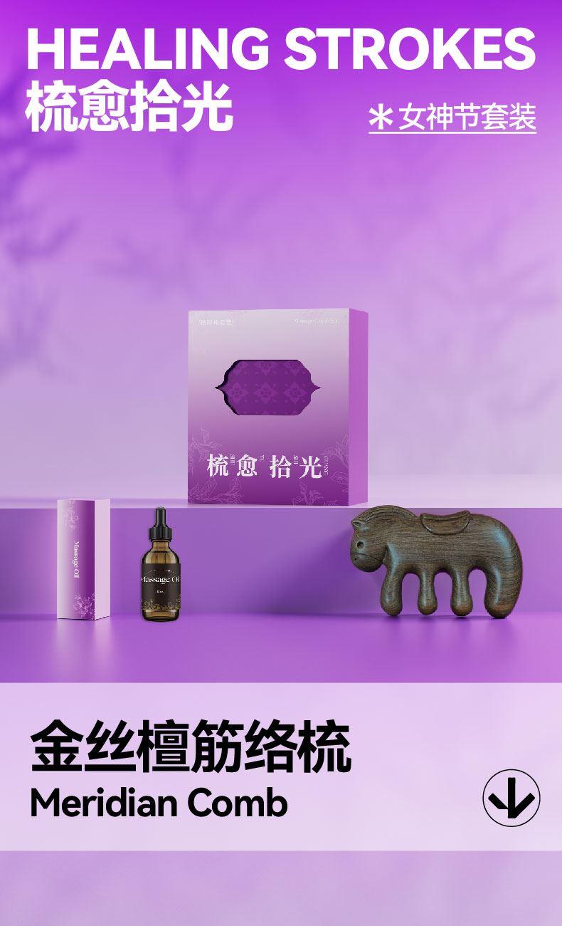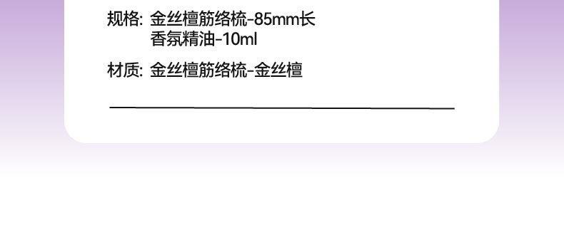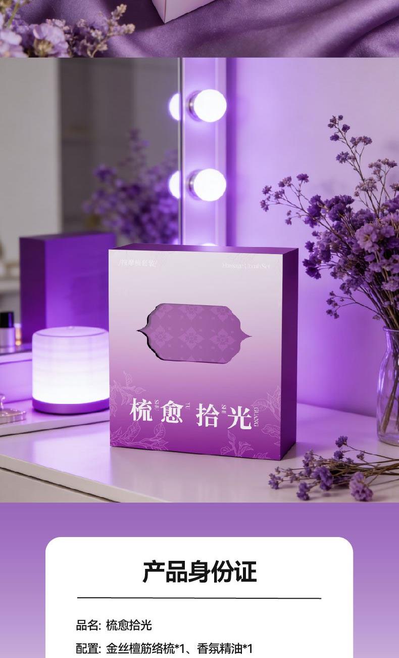 时间在发间行走,心事在脉络里栖居。 每一次梳落,不只是理顺青丝,更是抚平岁月的毛躁 木纹承载自然的呼吸,精油滴落间,光阴被揉成柔和的雾气 原来疗愈,是让身体学会与时光温柔相处 时光易逝,而你值得在每一刻,被温柔托住 规格:梳子-85mm长 精油-10ml 材质:梳子-金丝檀 包装尺寸:130*120*40mm 功能:可舒缓眼周、鼻梁、下颌线及肩颈穴位 仿若人手推拿,深浅有度,促进气血循环