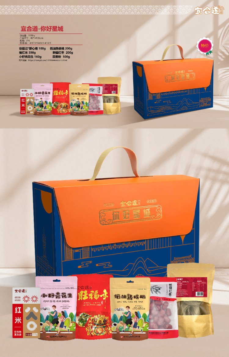 礼盒包装,手提款大气上档次。 内含: 徐福记*酥心糖 100g 奶油熟核桃 200g 福红米 390g 新疆红枣 200g 小籽壳花生 160g 圆圈/银芋粉 500g