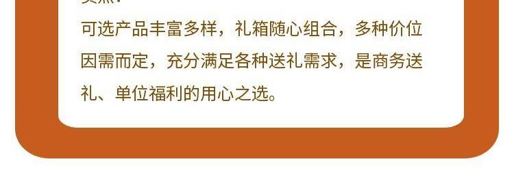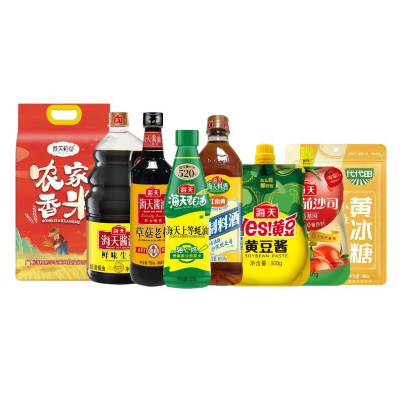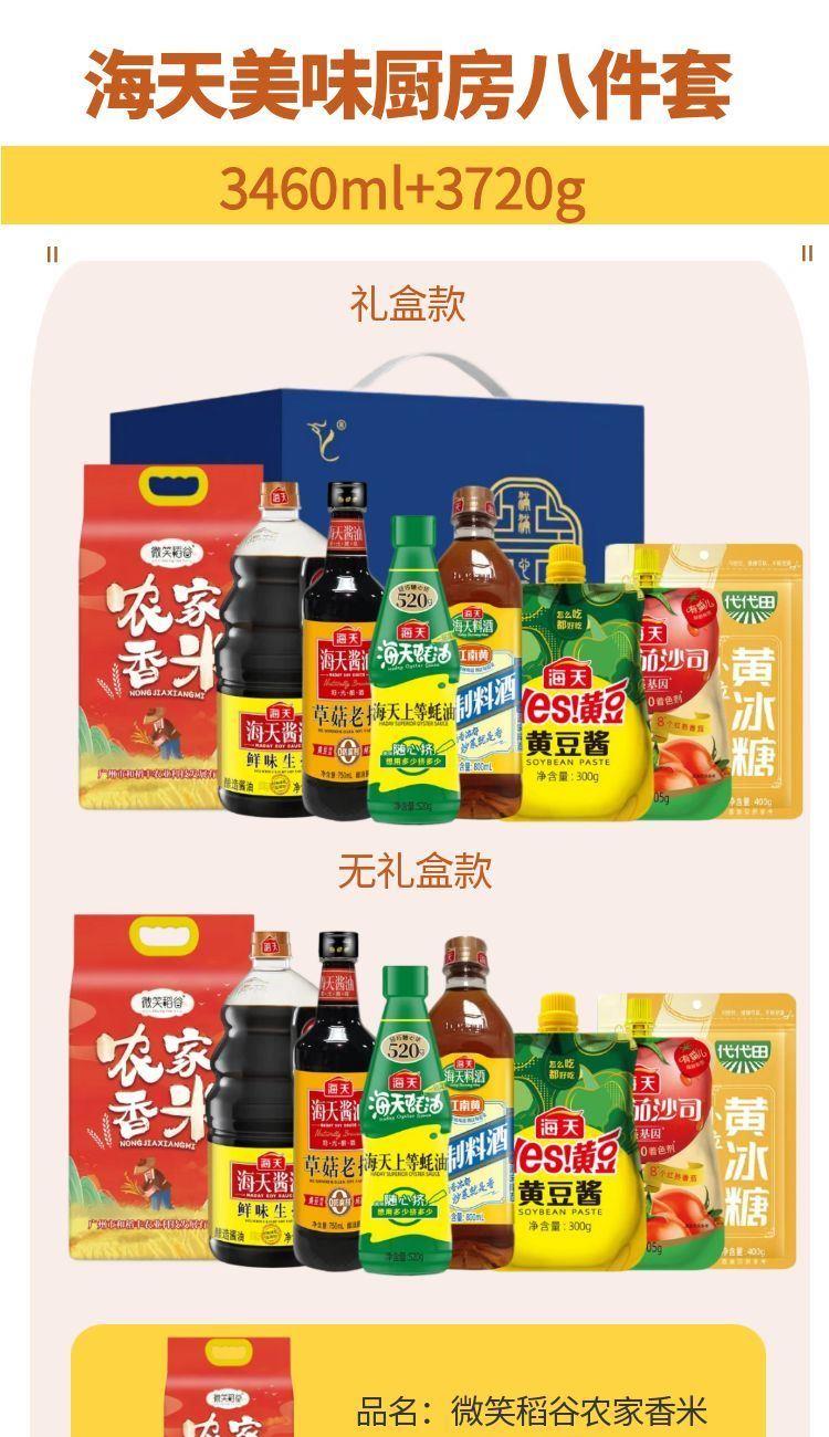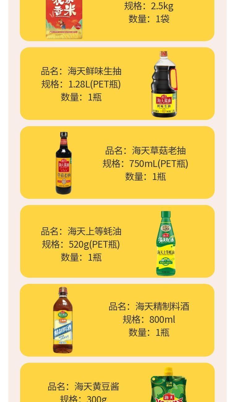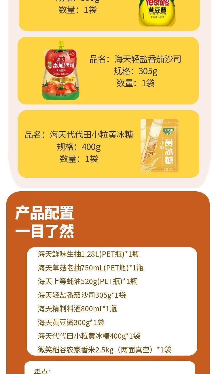 产品配置: 海天鲜味生抽1.28L(PET瓶)*1瓶 海天草菇老抽750mL(PET瓶)*1瓶 海天上等蚝油520g(PET瓶)*1瓶 海天轻盐番茄沙司305g*1袋 海天精制料酒800mL*1瓶 海天黄豆酱300g*1袋 海天代代田小粒黄冰糖400g*1袋 微笑稻谷农家香米2.5kg(两面真空)*1袋 卖点: 可选产品丰富多样,礼箱随心组合,多种价位因需而定,充分满足各种送礼需求,是商务送礼、单位福利的用心之选。