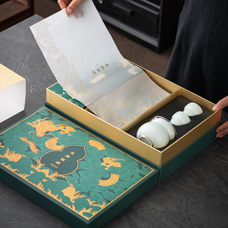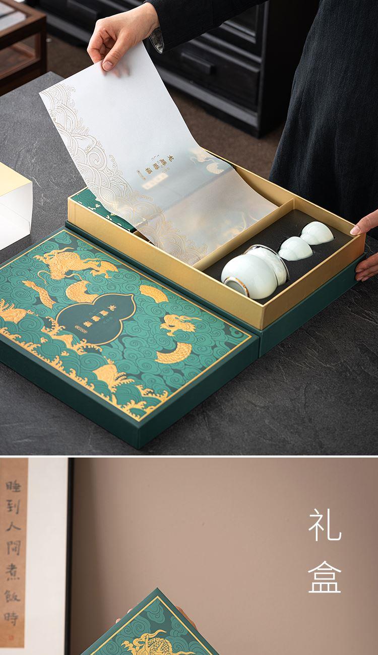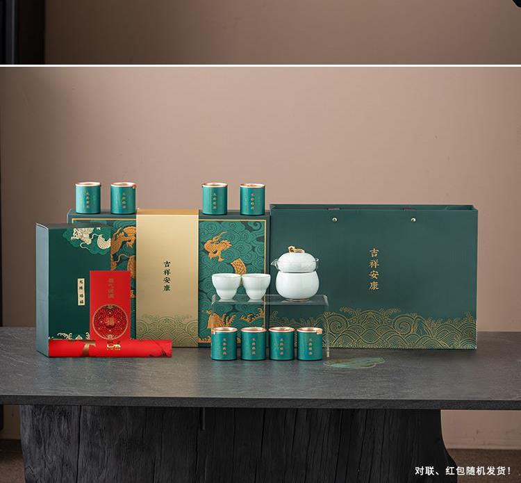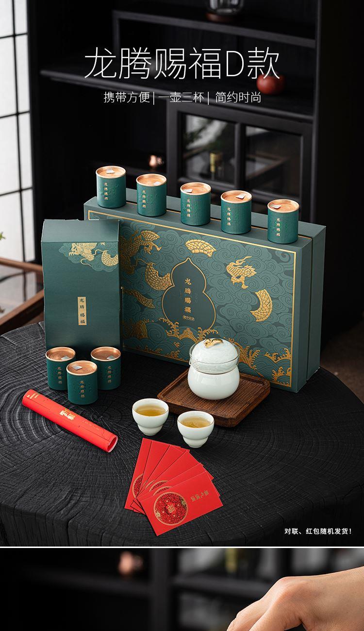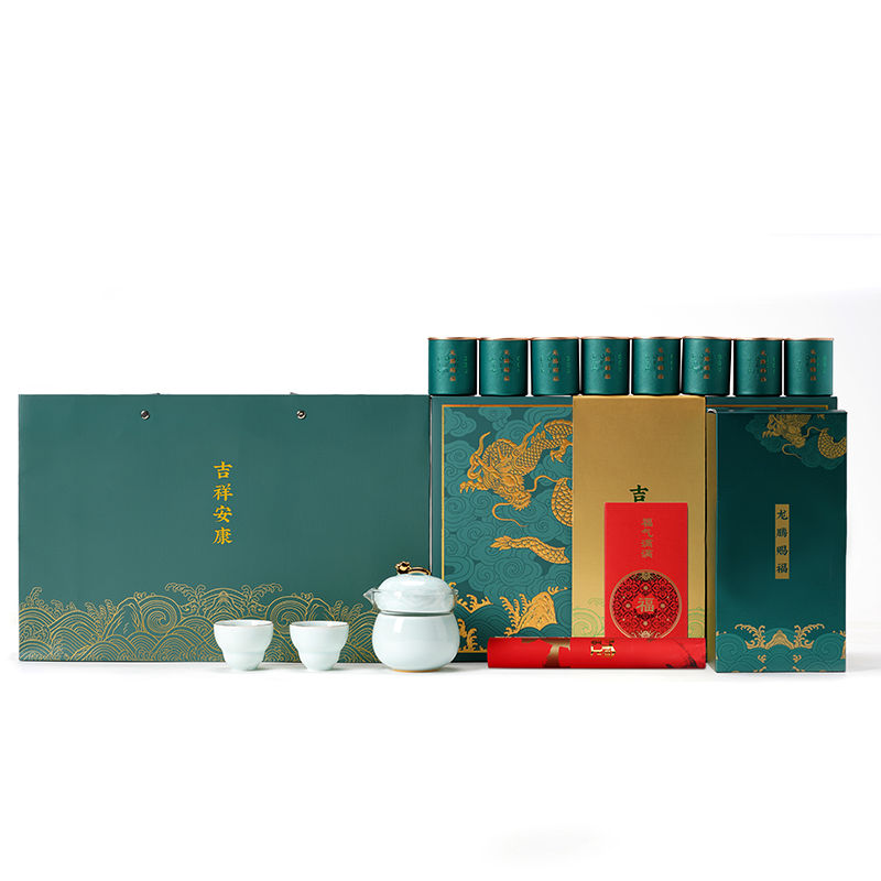 设计理念:《龙腾赐福》以青釉葫芦瓶为主要设计灵感,整体造型上圆润 饱满。壶盖钮提取龙纹玉带钩,仿佛龙吟九霄;品杯,以“倒葫芦”状,有“福到”之意。 以陶瓷器皿为载体,以“葫”谐“福”,寄意福到万家,人人安康幸福。 配置:茶壶*1、青瓷主人杯*1、青瓷葫芦客杯*2、对联*1、红包*6、 正山小种*8罐、设计理念卡片*1、浮雕烫金礼盒、礼袋