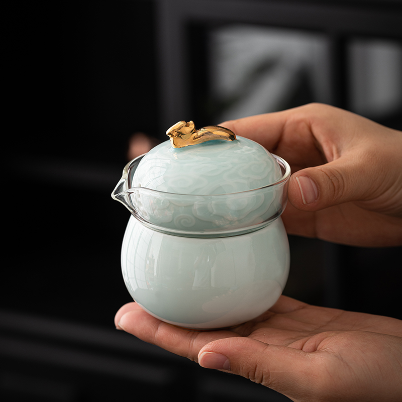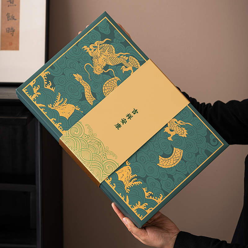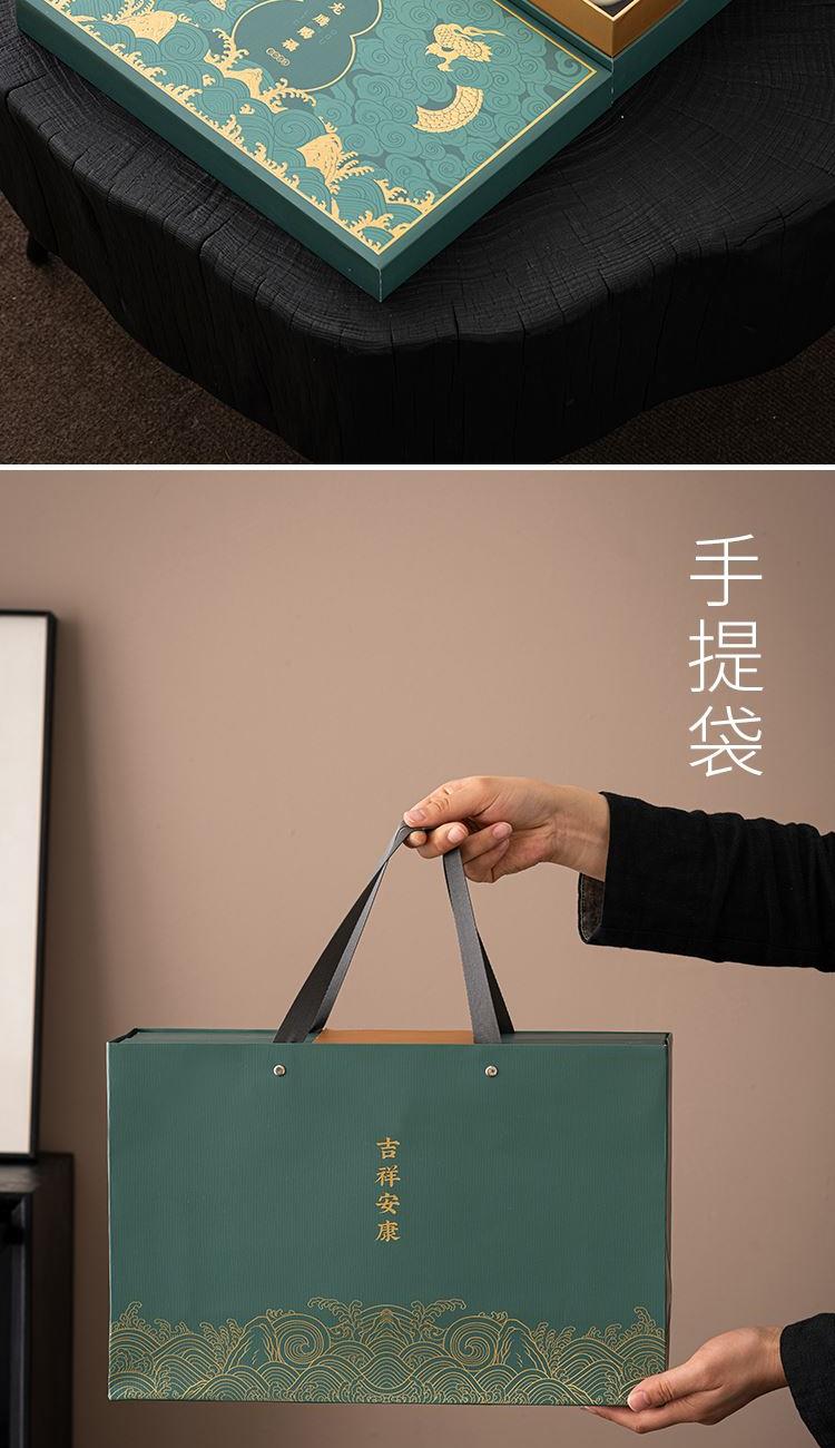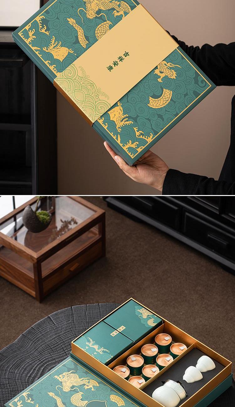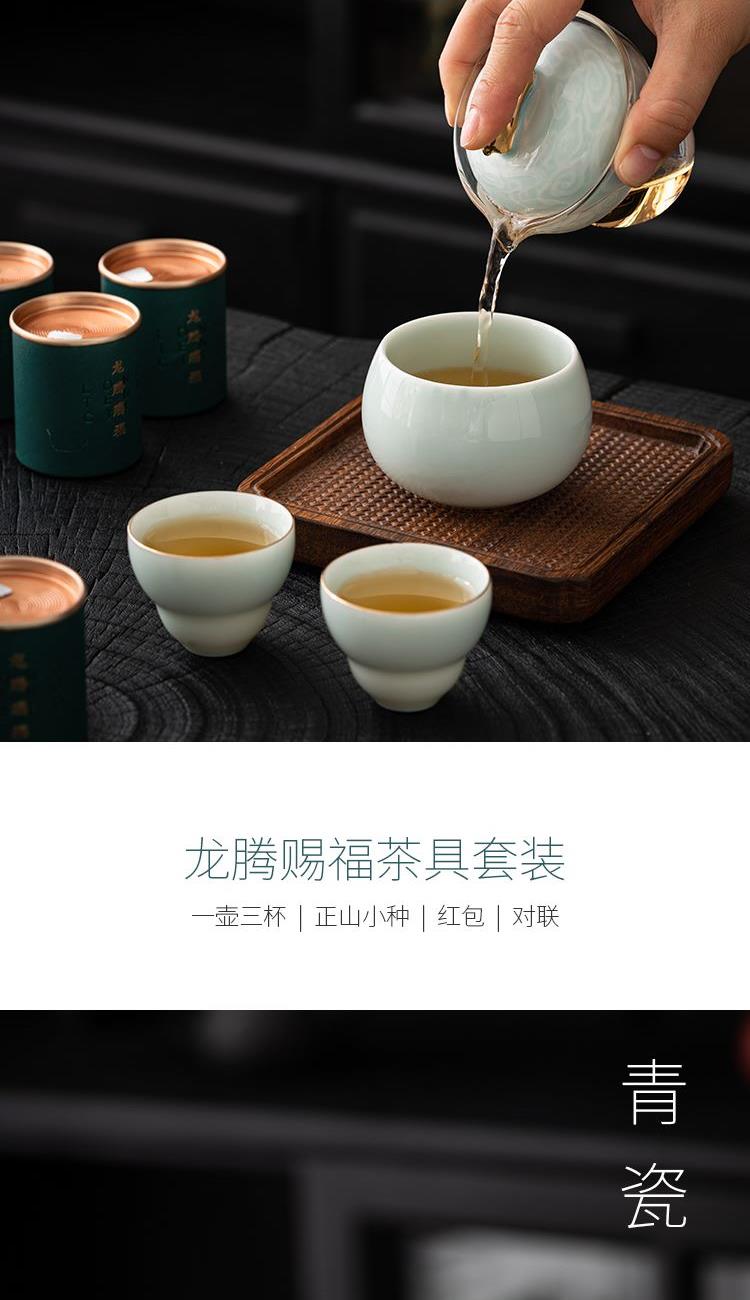 设计理念:《龙腾赐福》以青釉葫芦瓶为主要设计灵感,整体造型上圆润 饱满。壶盖钮提取龙纹玉带钩,仿佛龙吟九霄;品杯,以“倒葫芦”状,有“福到”之意。 以陶瓷器皿为载体,以“葫”谐“福”,寄意福到万家,人人安康幸福。 配置:茶壶*1、青瓷主人杯*1、青瓷葫芦客杯*2、对联*1、红包*6、 正山小种*8罐、设计理念卡片*1、浮雕烫金礼盒、礼袋