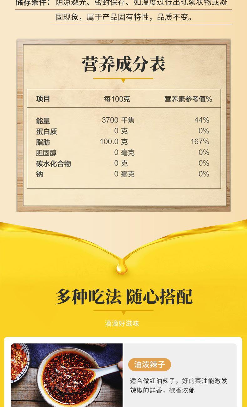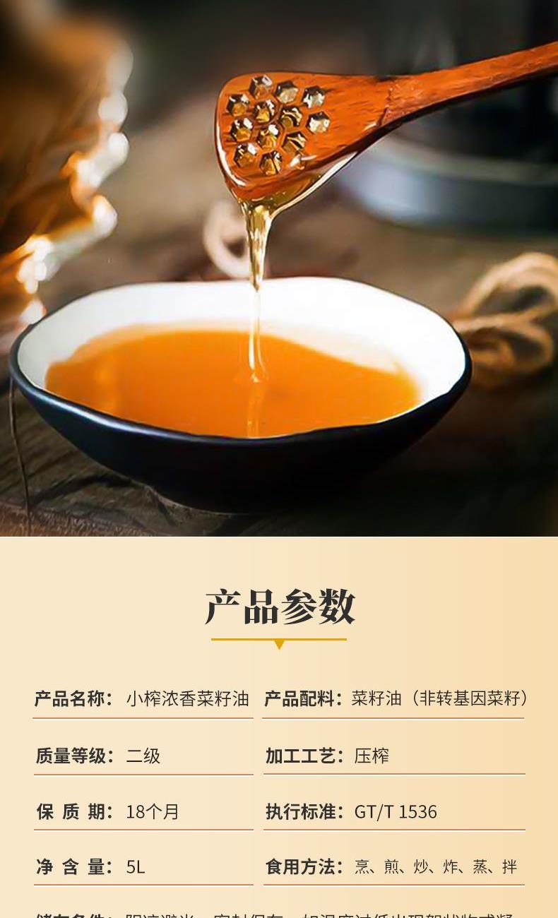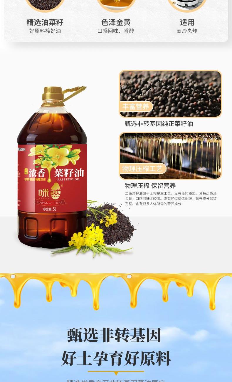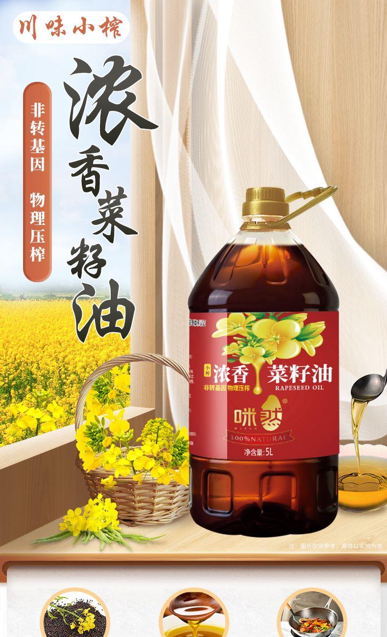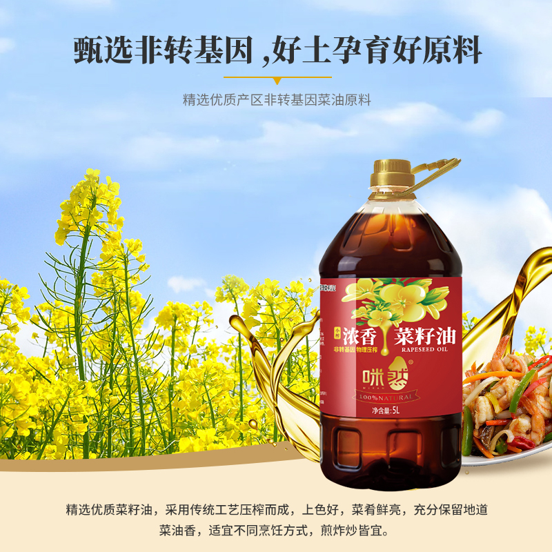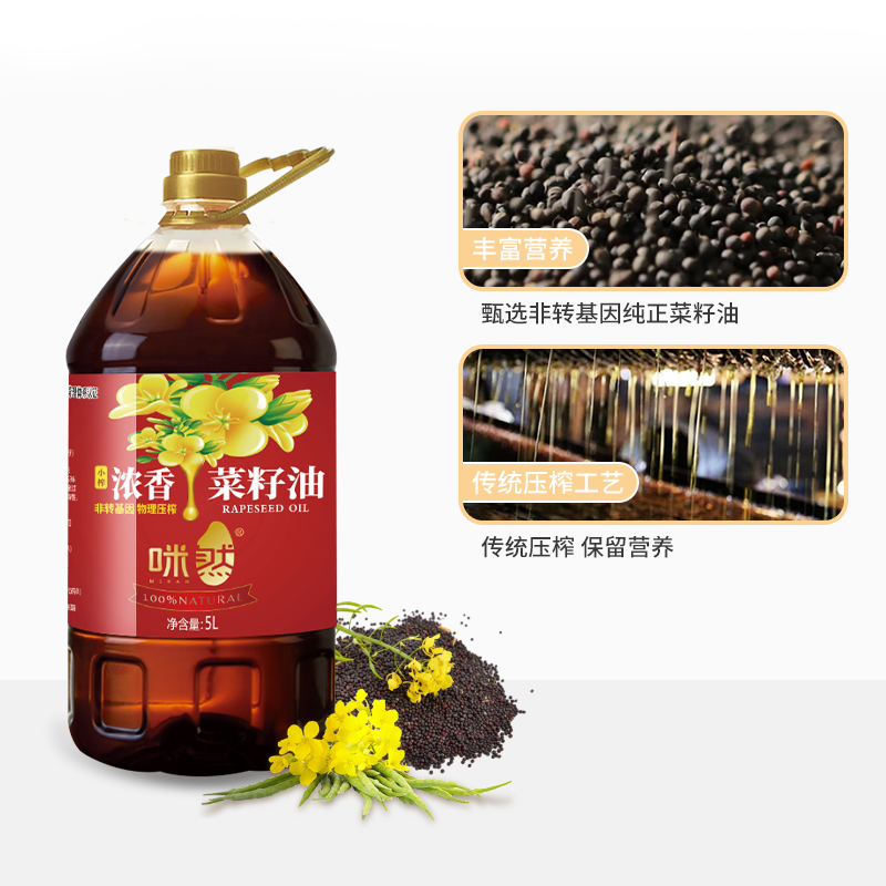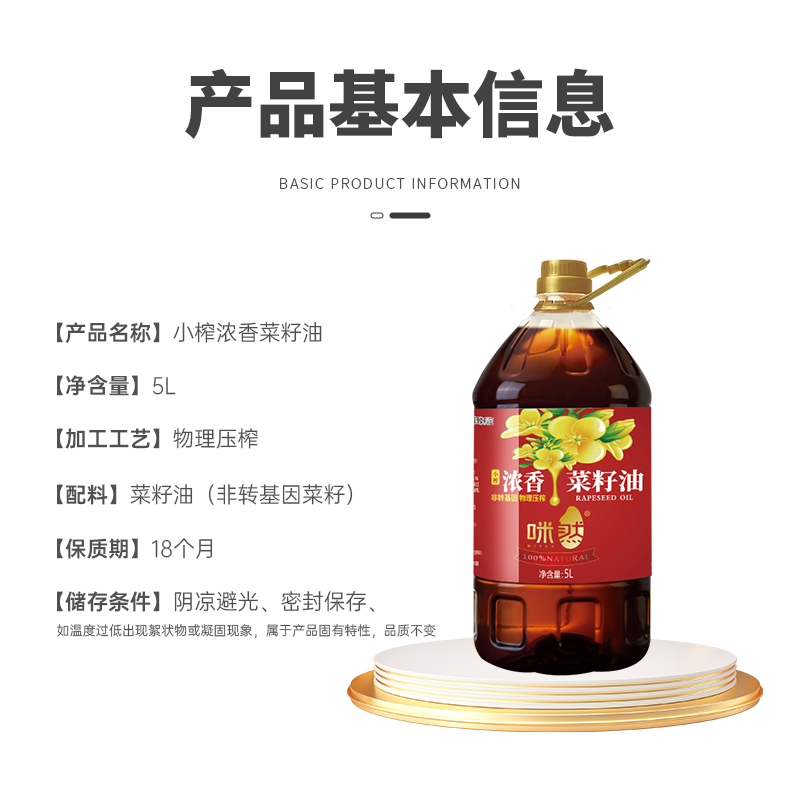 产 品 : 咪然 小榨浓香菜籽油 执行标准 : GB/T 1536 保 质 期 :12个月 产 地 : 中国 箱 规 :4*5L