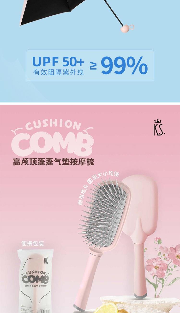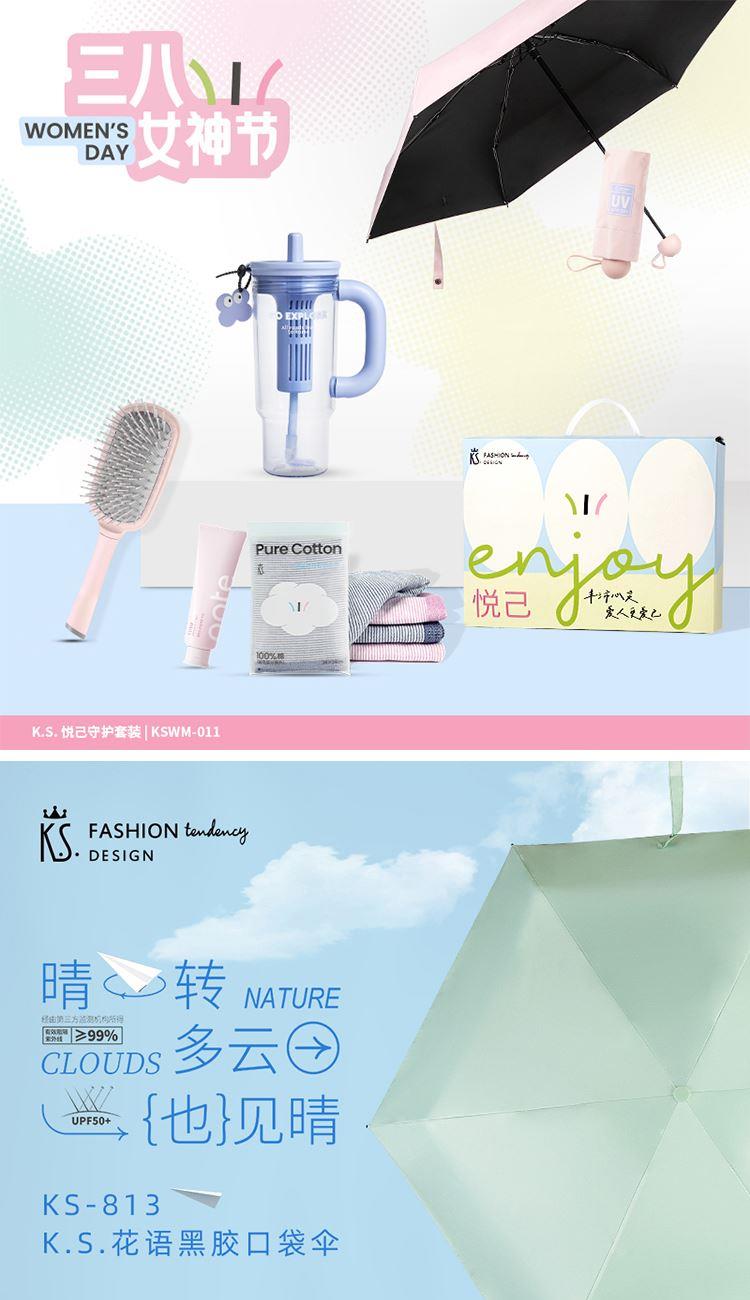 礼盒以悦己为主题,用清新明快的棉花插画造型塑造了温暖的调性。更适合员工福利、活动营销等。 礼盒包含气垫梳、条纹方巾、冰霸杯、黑胶伞、柏缇护手霜。 礼盒、内容物件上均可实现中小批量成品订制,全套订制方案输出,为企业宣传添砖助力。 气垫梳/手柄包胶TPE+梳齿PP 方巾/99.99%棉(断档部分除外) 冰霸杯/杯体/PC、上盖、饮口/聚丙烯PP硅胶圈/甲基乙烯基硅橡胶混炼胶 花语伞/钢制+纤维伞骨、黑胶碰起布