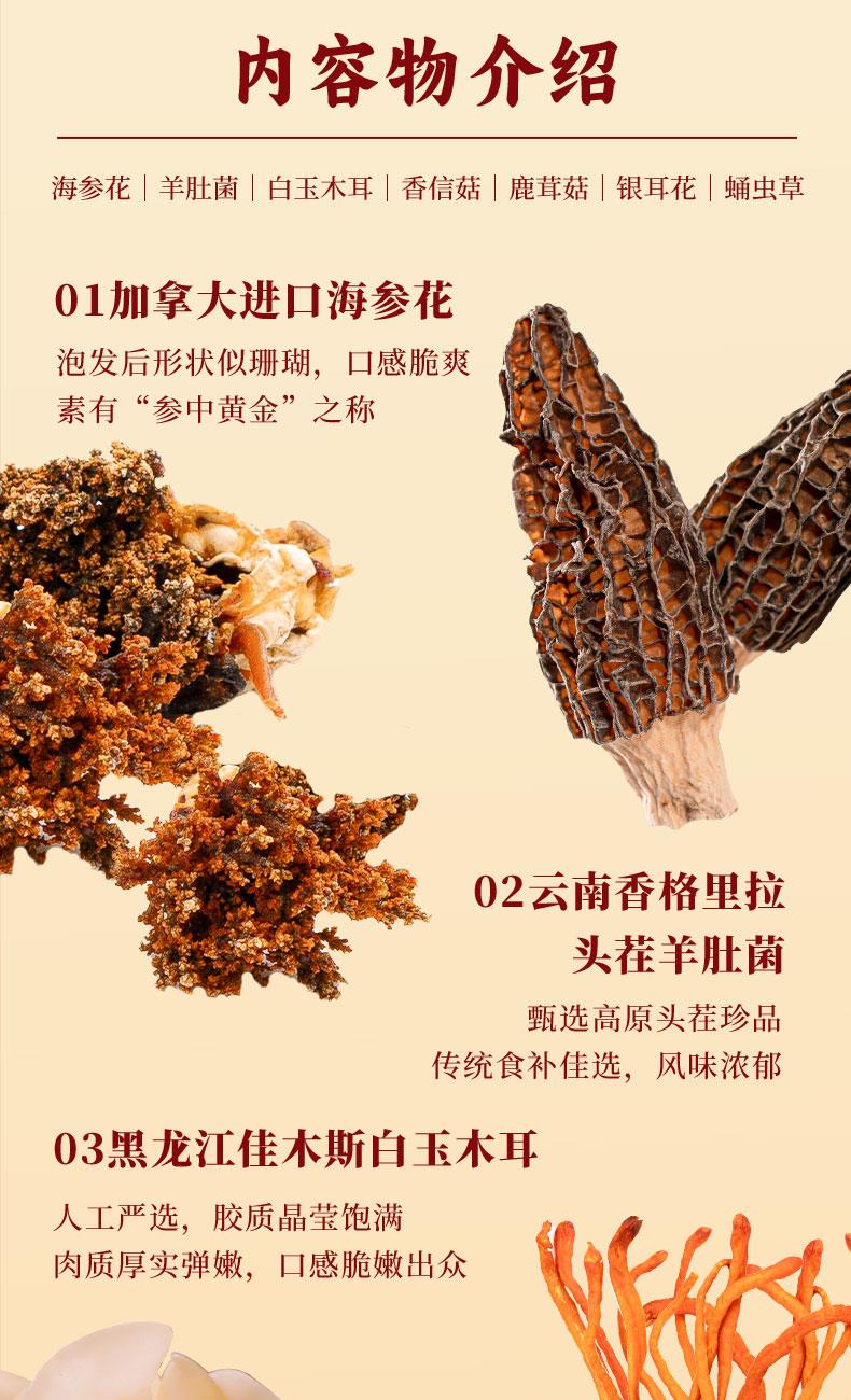 精选羊肚菌25g 云南香格里拉 精选海参花50g 加拿大进口 精选白玉木耳80g 黑龙江佳木斯 精选香信菇35g 浙江庆元 精选鹿茸菇65g 福建南平 精选银耳花60g 福建古田 精选蛹虫草80g 内蒙古突泉