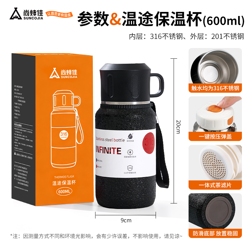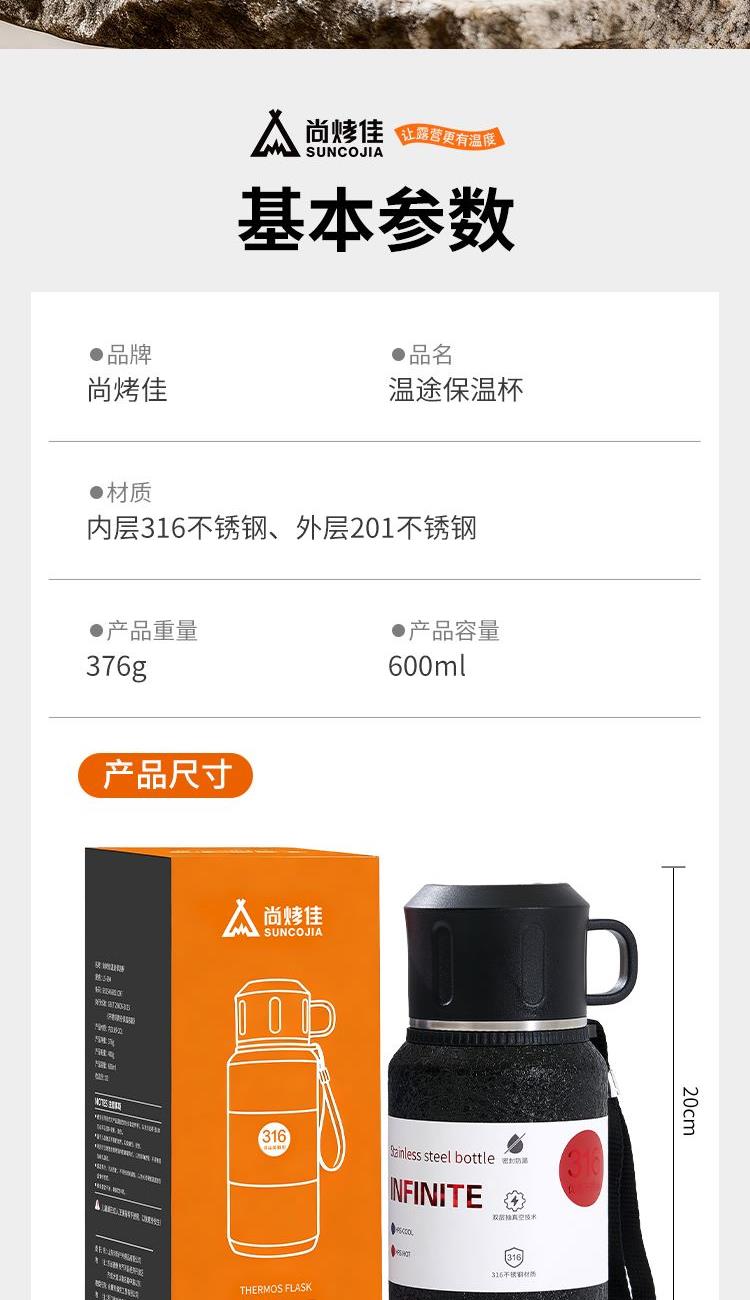 产品材质:内胆是底片316内壁304 外壳201 产品净重:376g 产品毛重:400g 产品容量:600ml 内盒:9*9*21 外箱:76*47.5*23