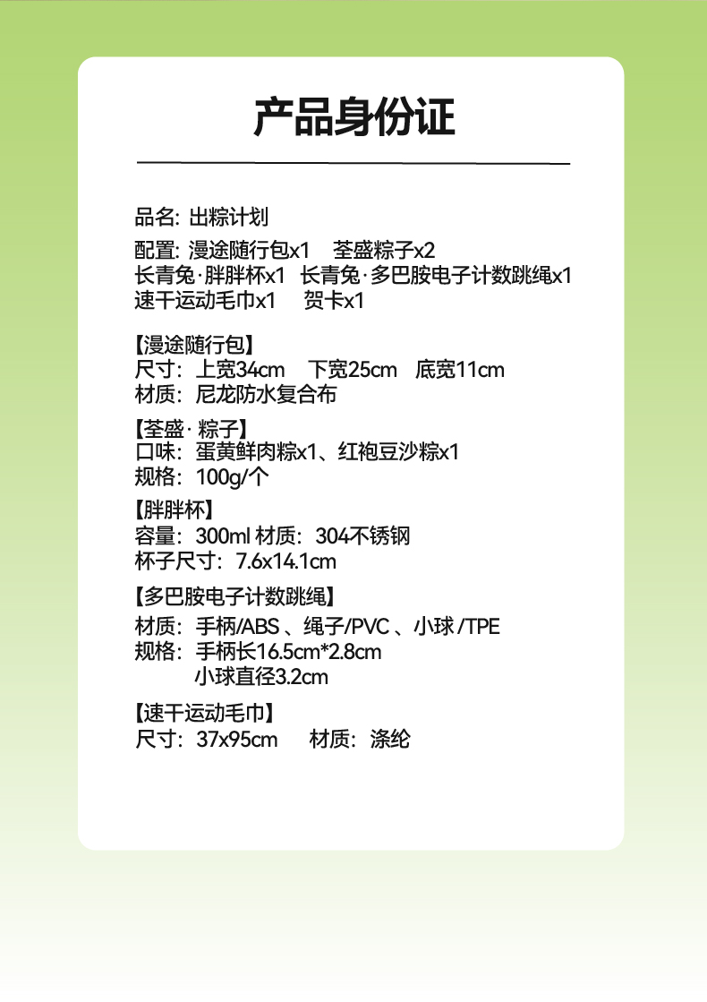 以端午为始,燃运动之新 不囿于传统,敢破浪而出——「出粽」即出众 是挣脱惯常的仪式,更是身心向前的启程 于仲夏焕新之际,驱散倦意,激活潜在能量 在汗水与平衡之间,重塑节奏,抵达更清醒的鲜活 这不仅是一次身体的舒展。 内配: 配置一:漫途随行包x1 配置二:荃盛粽子x2 配置三:长青兔·胖胖杯x1 配置四:长青兔·多巴胺电子计数跳绳x1 配置五:速干运动毛巾x1 配置六:贺卡x1