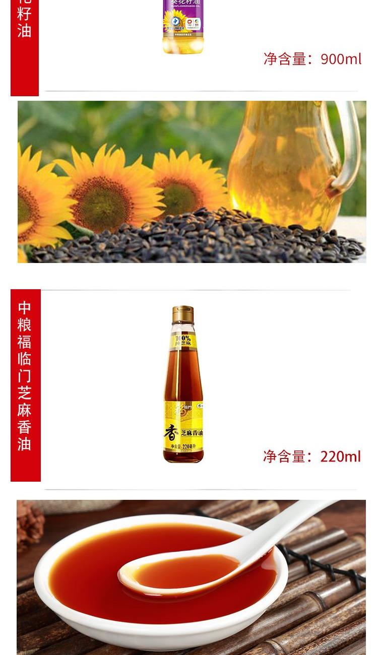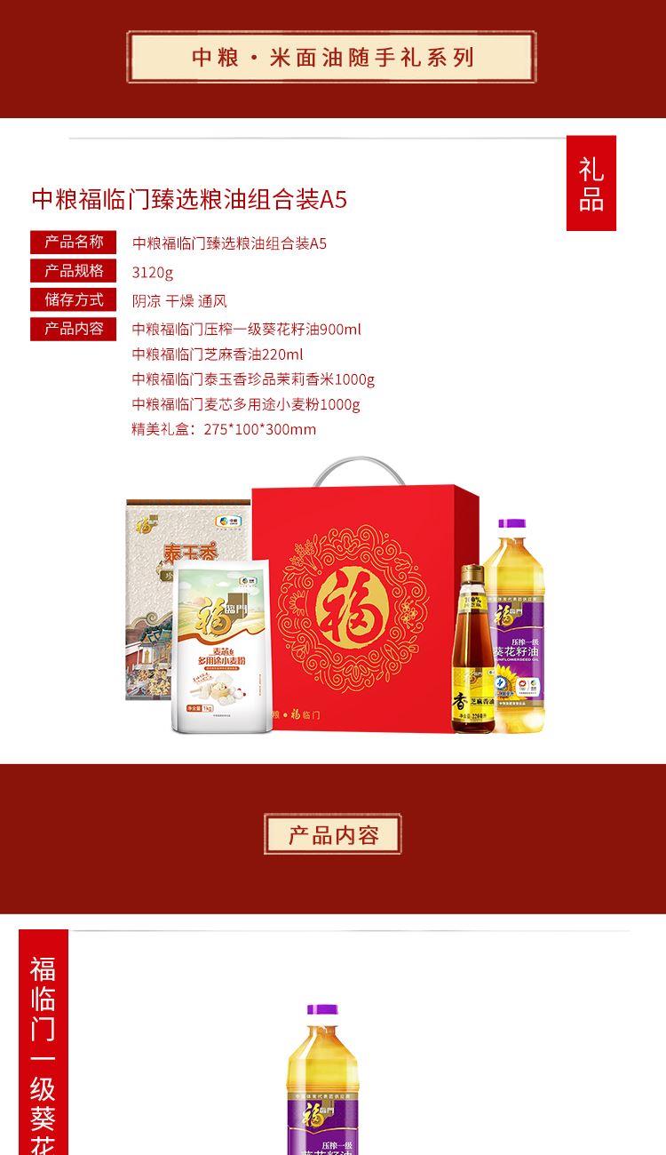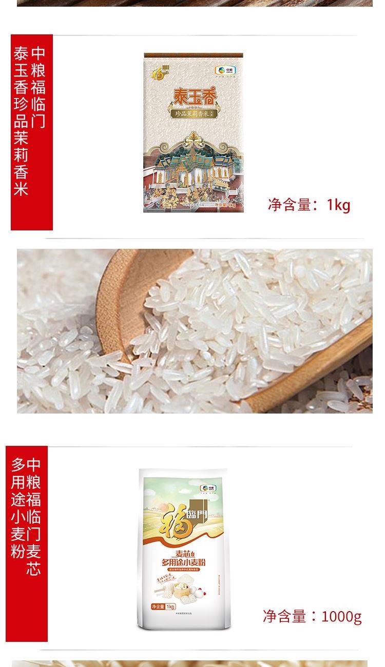 中粮福临门压榨一级葵花籽油900ml 中粮福临门芝麻香油220ml 中粮福临门泰玉香珍品茉莉香米1000g 中粮福临门麦芯多用途小麦粉1000g 精美礼盒:275*100*300mm