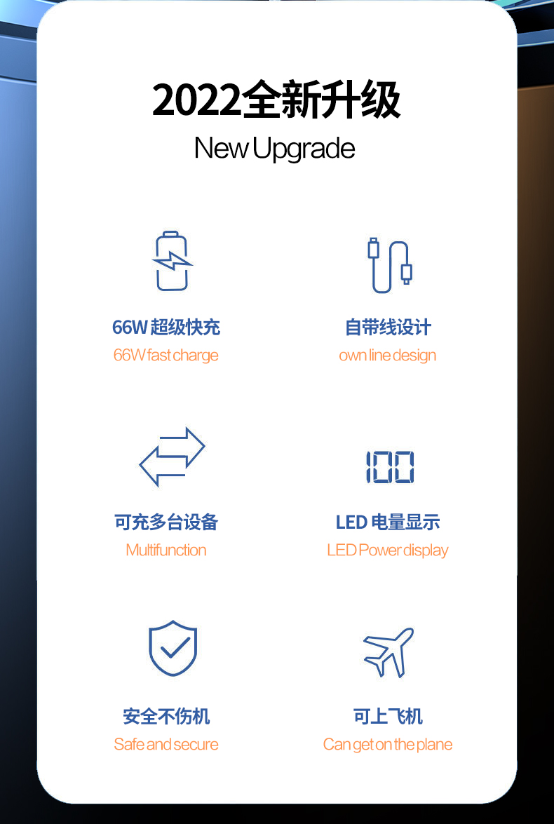 型号:DY233 条码:69742307423324 颜色:白、黑、粉、绿 材质:PC+ABS容量:10000毫安 产品尺寸: 8.1*6.2*2.5cm ◆自带苹果和Type-C线,同时满足3台设备充电需求 ◆66W急速无线快充,充电快人一步 ◆符合民航局规定,可带上飞机 ◆大屏真数显,随 时掌握实时电量 ◆超小尺寸,好携带