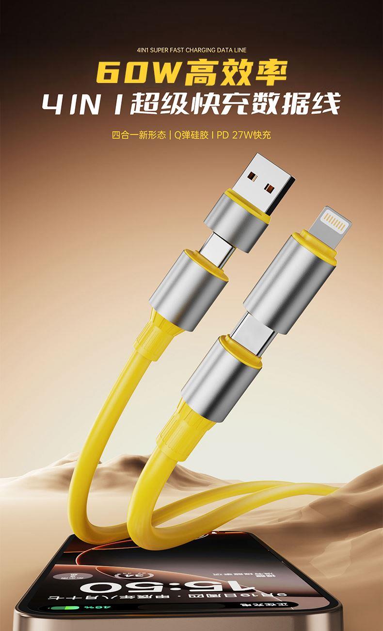 电流:3A 产品型号:LCB-385 产品材质:锌合金+硅胶 产品款式: 四合一 输出功率:60w 产品输入:USB,TYPE-C 产品输出:Lightning,TYPE-C 69码:6972991657430 颜色:灰色、黑色、绿色、黄色 四合一新形态,双Type-C+USB+Lightning接口,满足不同设备需求,Q弹硅胶线体,亲肤柔软手感好,耐折弯,一线多用用,轻松出行。