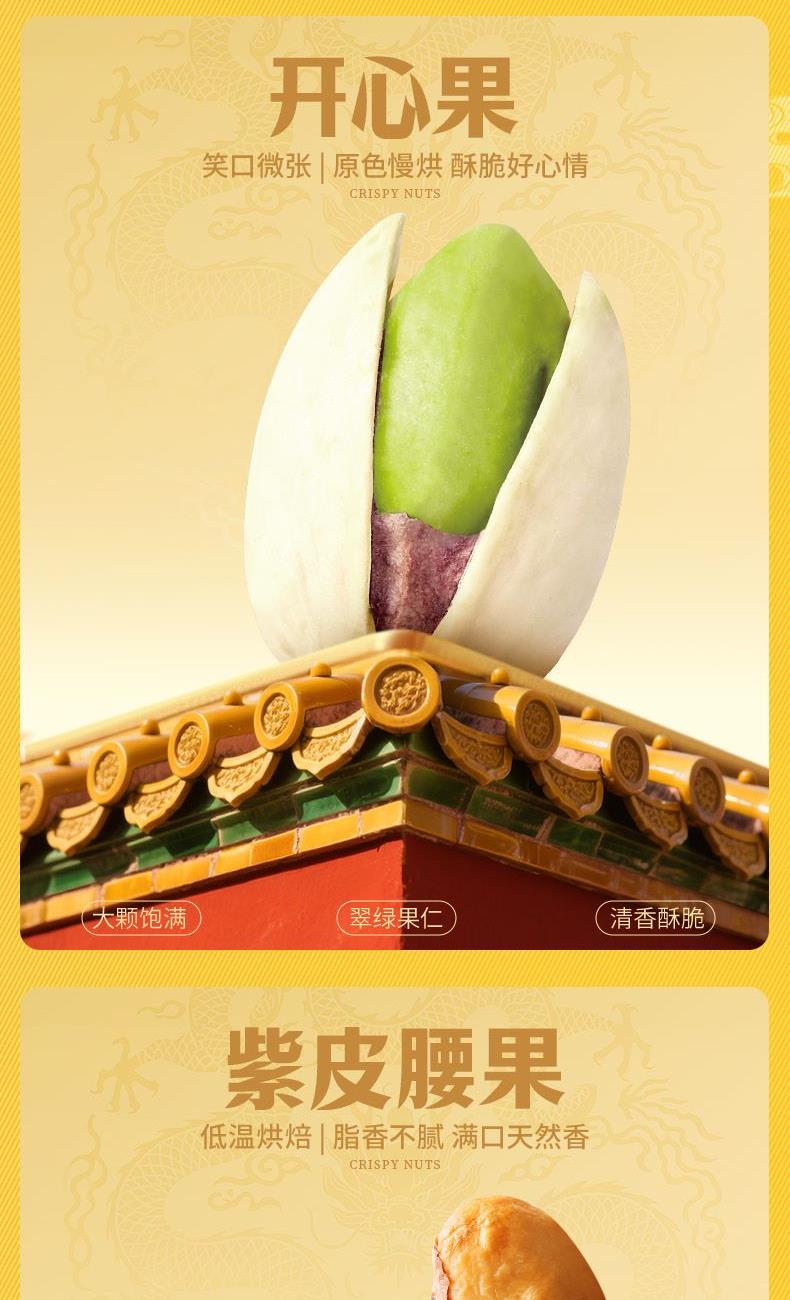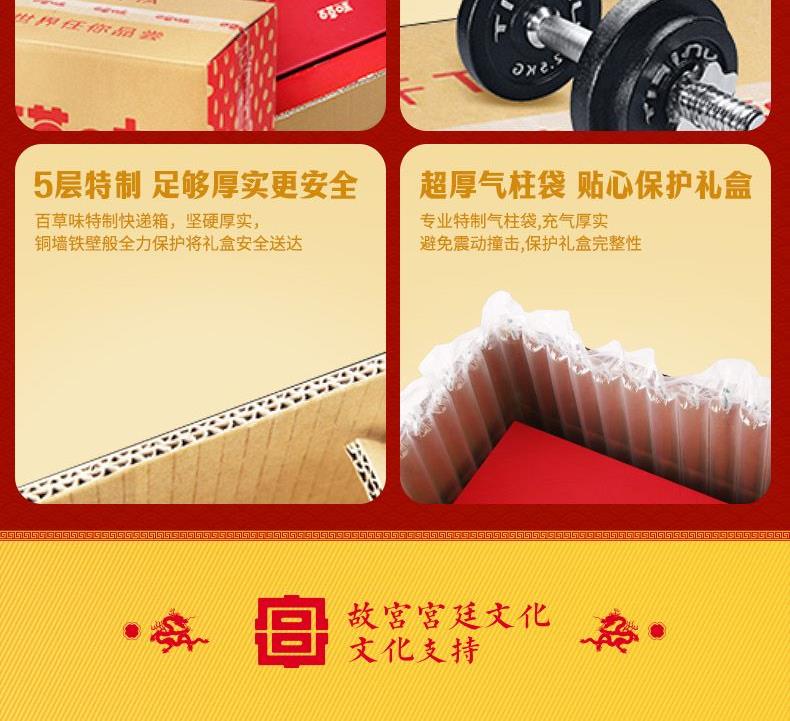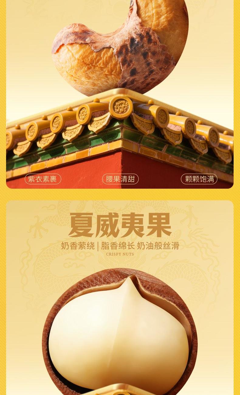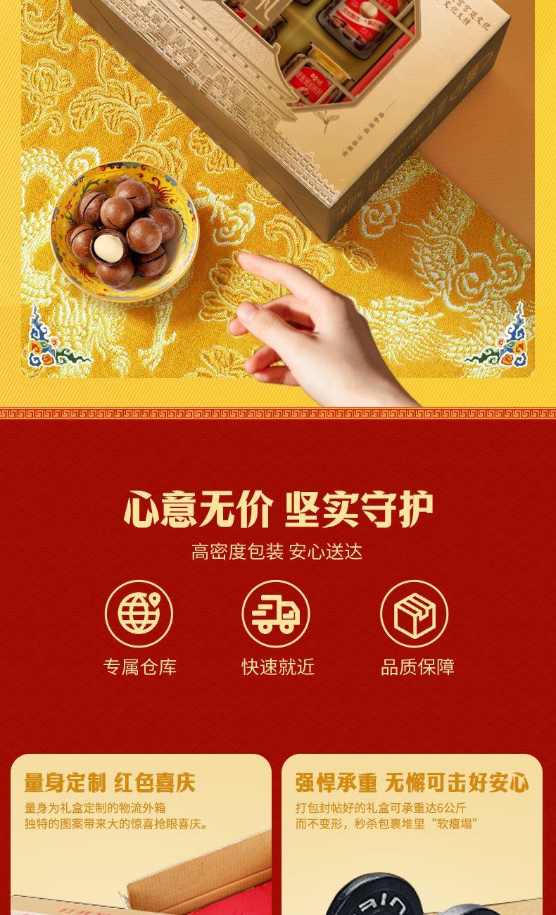礼盒尺寸mm(长*宽*高):450*115*300 开心果 150g(椭圆罐) 紫皮腰果 170g(椭圆罐) 夏威夷果(奶油味)180g(椭圆罐) 巴旦木(奶油味)140g(椭圆罐) 小白杏核(奶香味) 190g(椭圆罐) 蜂蜜琥珀核桃仁 170g(椭圆罐) 每日坚果乳 310g