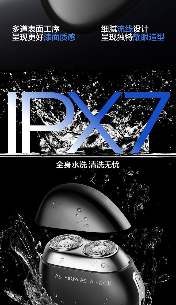 电机转速:7200转/min 刀头材质:精钢 刀头数量:2个 产品尺寸:长74mm;宽74mm;高30mm 产品净重:0.09kg 电压:5V 防水等级:IPX7,可全身水洗 充电时间:1小时快充 续航:60天 1、设计精致小巧,超高颜值,精美礼盒,轻松随行; 2、双环弧面刀网,3D浮动刀头; 3、7200转高速静噪电机,够性能才够快; 4、顺滑贴肤,干湿两剃; 5、IPX7级防水等级,可全身水洗;