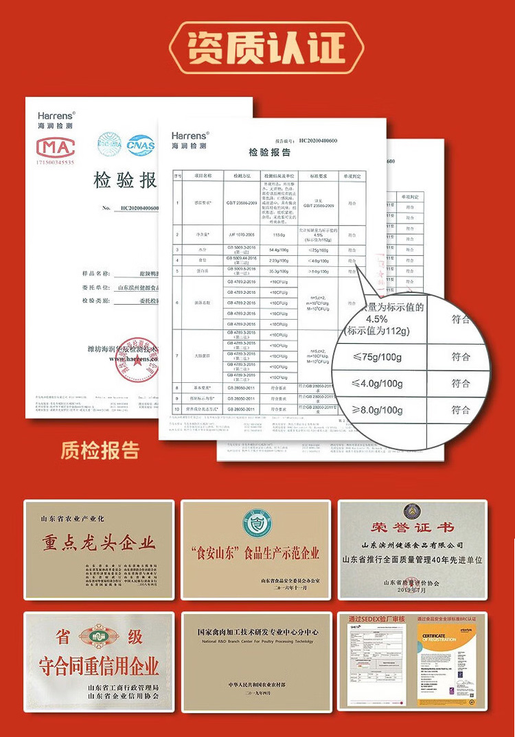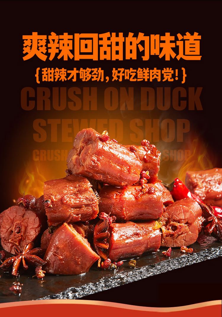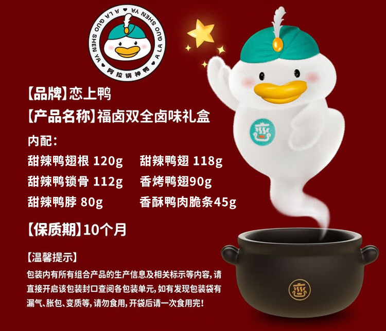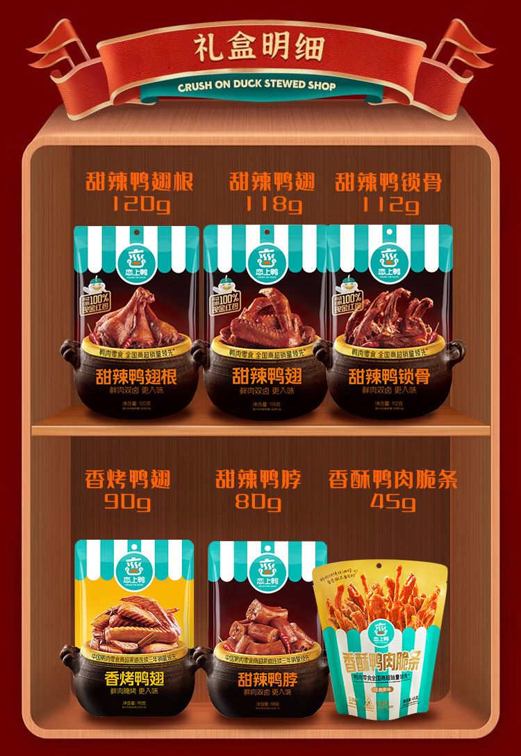内配明细: 1.恋上鸭甜辣鸭翅根120g 2.恋上鸭甜辣鸭翅118g 3.恋上鸭甜辣鸭锁骨112g 4.恋上鸭香烤鸭翅90g 5.恋上鸭甜辣鸭脖80g 6.恋上鸭香酥鸭肉脆条45g