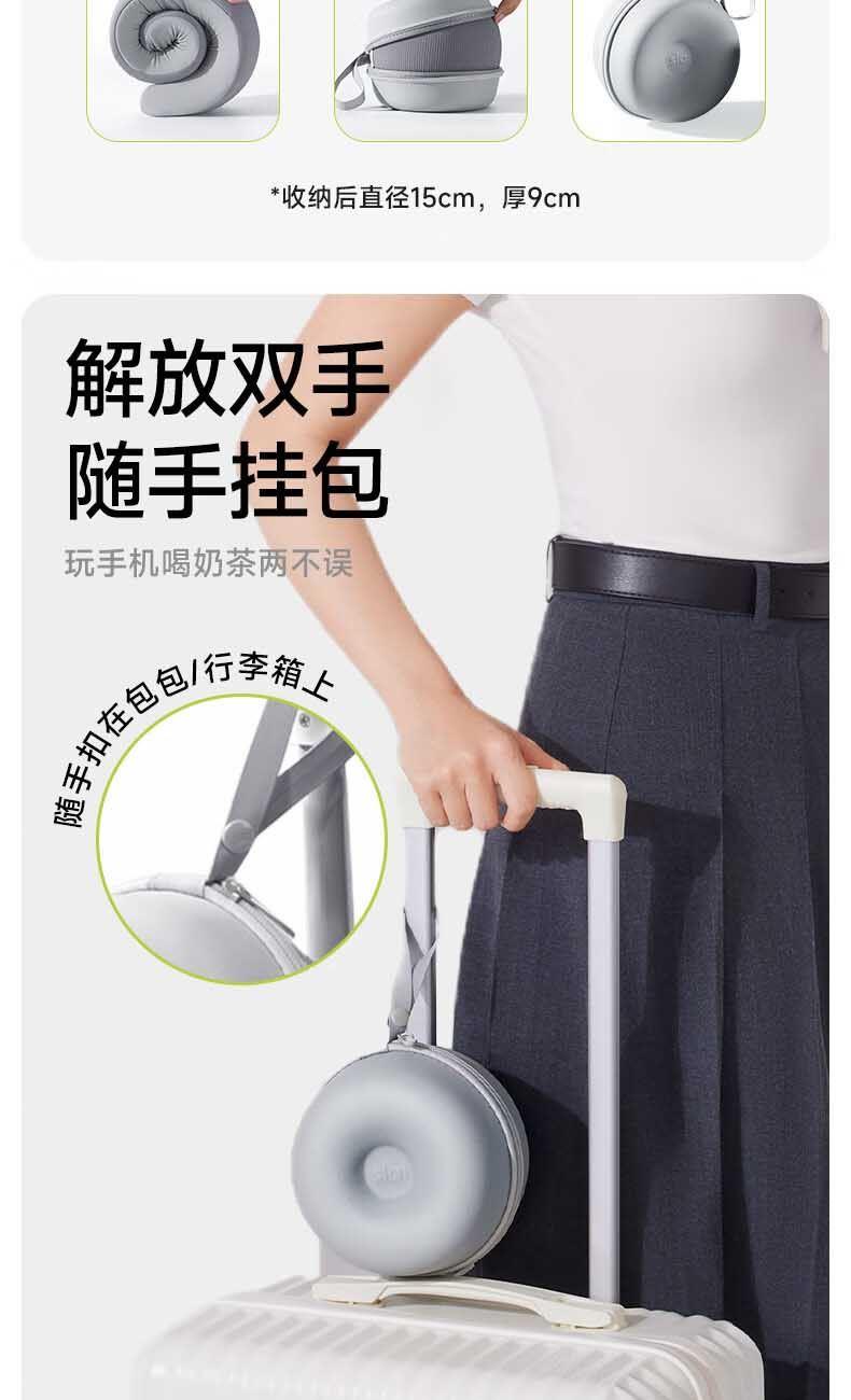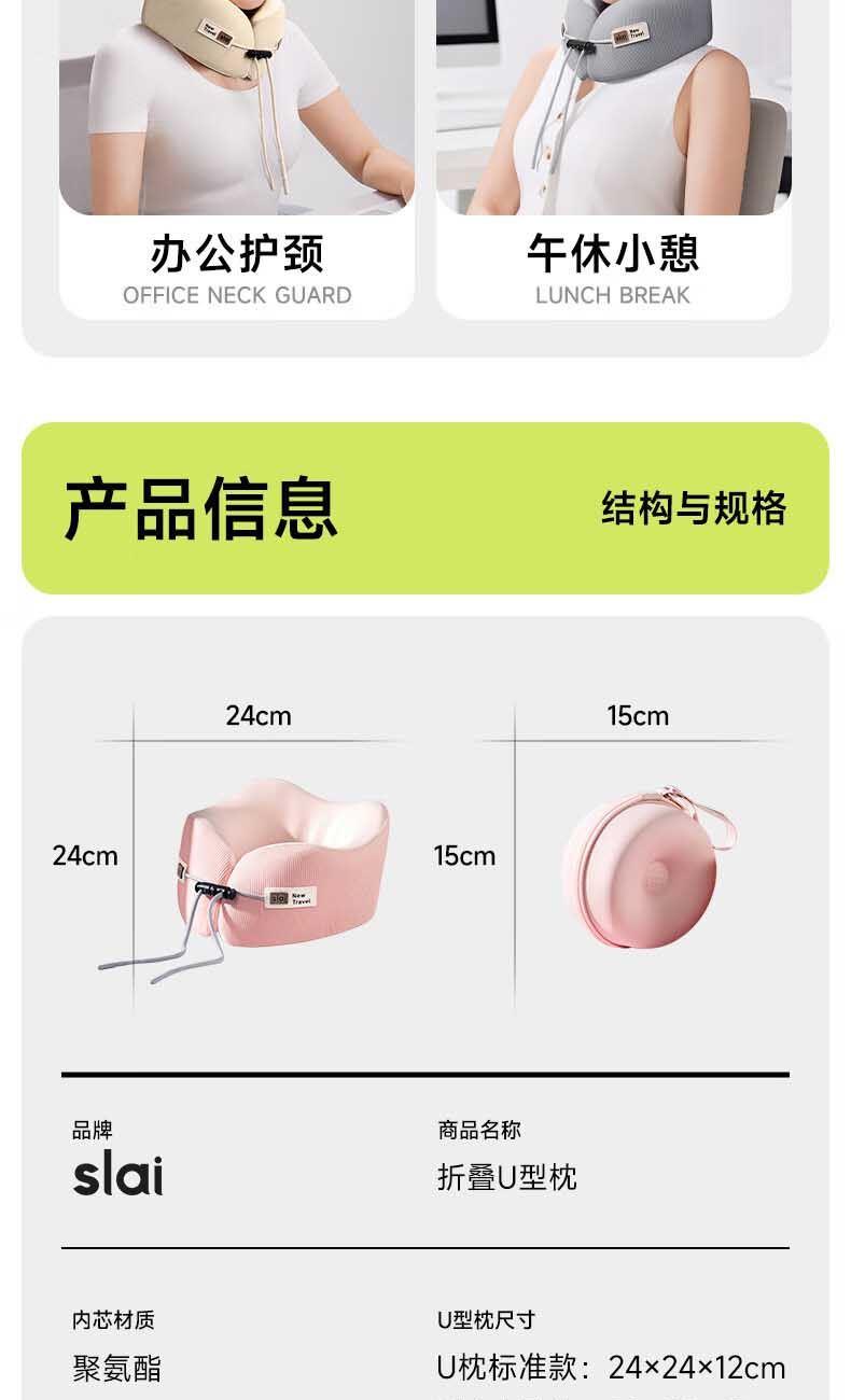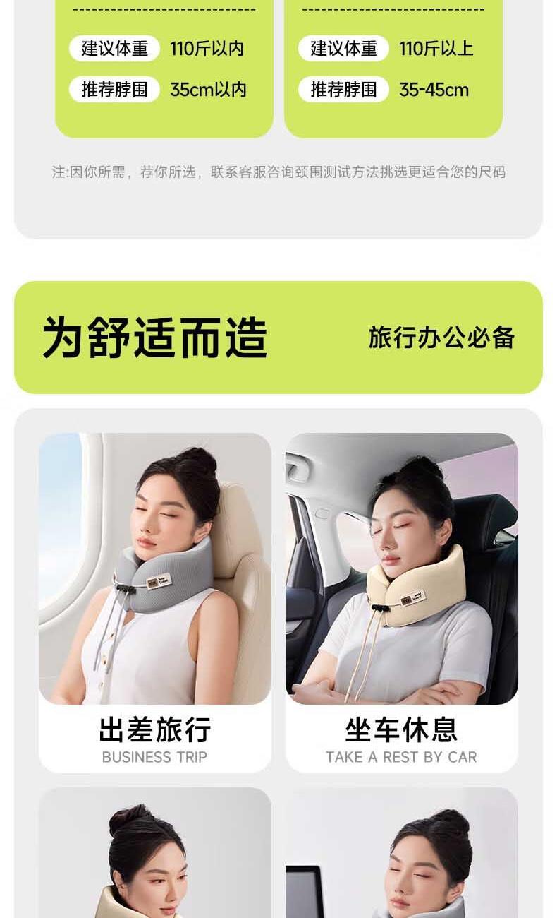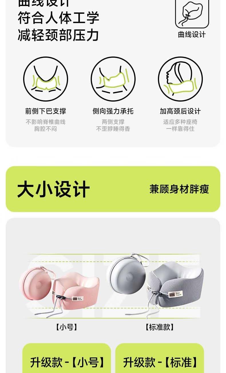 【人体工学设计】能有效的减轻颈部压力; 【可调节抽绳】可随意调节合适大小; 【方便携带】折叠后手机般大小,赠送收纳盒,更易携带