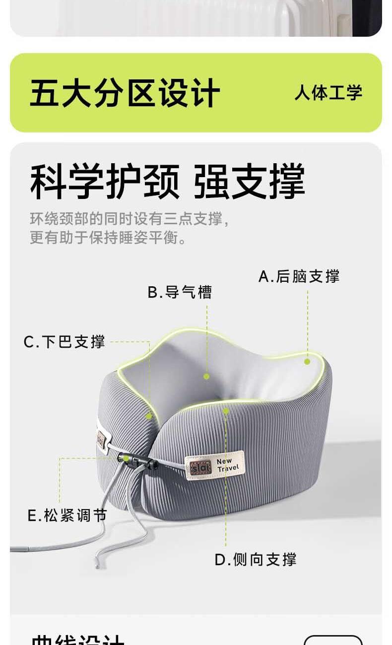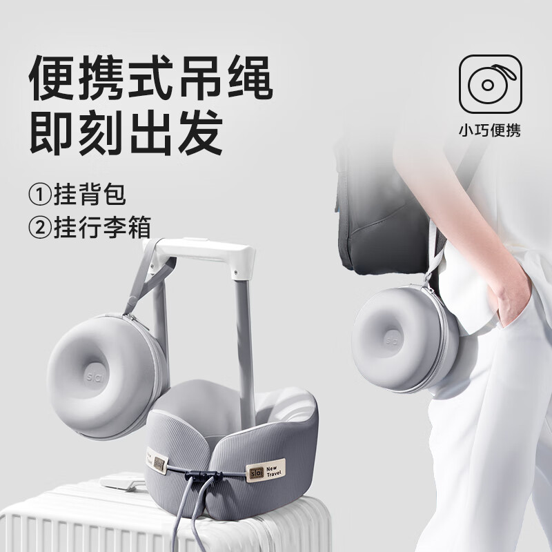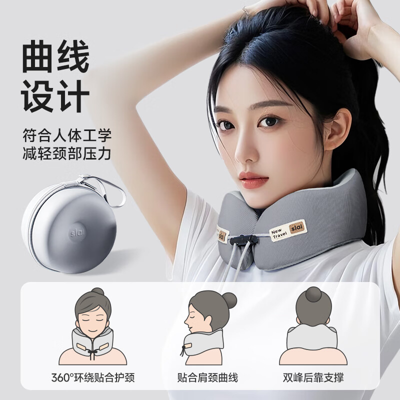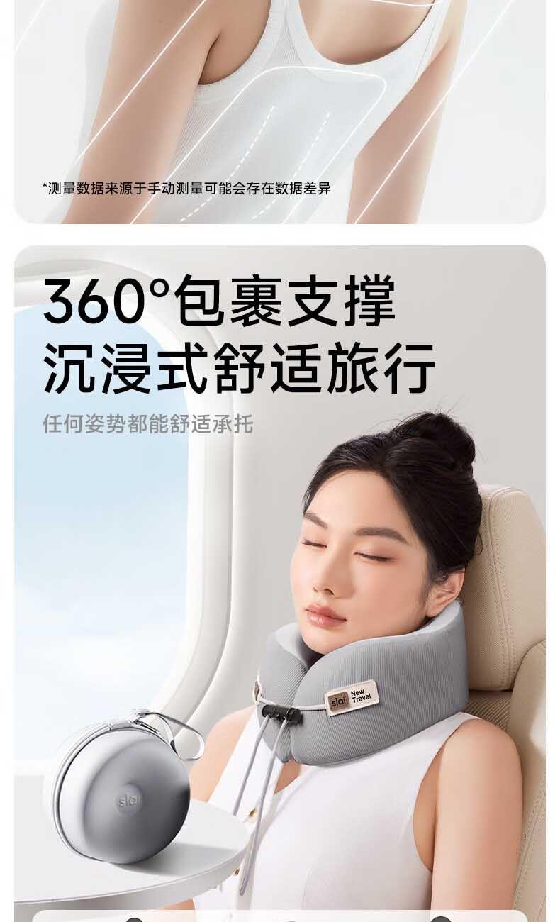 【人体工学设计】能有效的减轻颈部压力; 【可调节抽绳】可随意调节合适大小; 【方便携带】折叠后手机般大小,赠送收纳盒,更易携带