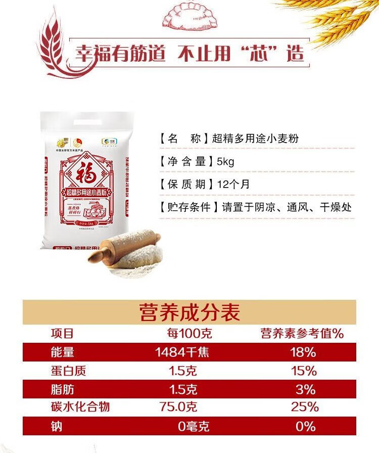 净含量:5kg 条形码:6944910370621 开票税率:9% 产品卖点: 央企全链管控,安全品质有保障;精选核心产区麦源,多道精研麦香浓多系列适配全场景,面食筋道易操作。