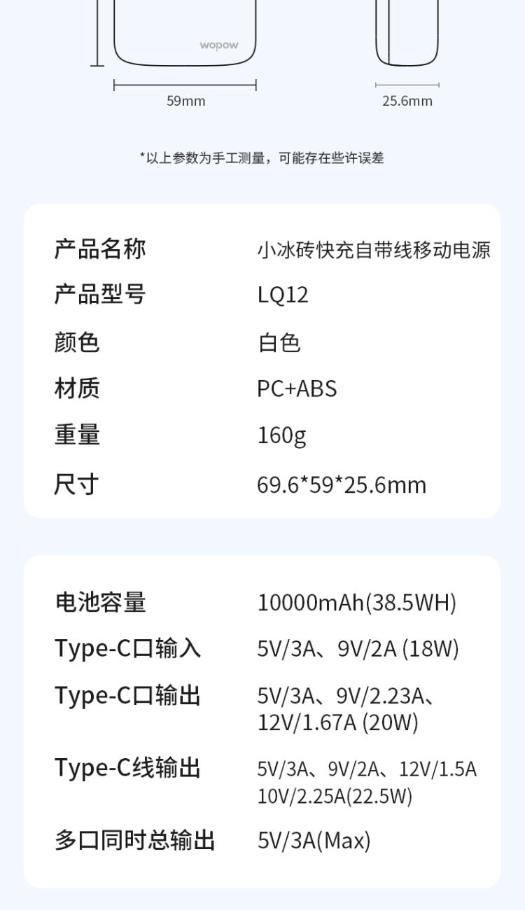小冰砖快充自带线移动电源LQ12Pro