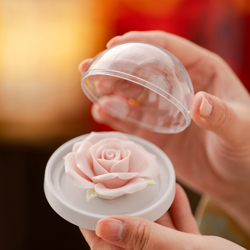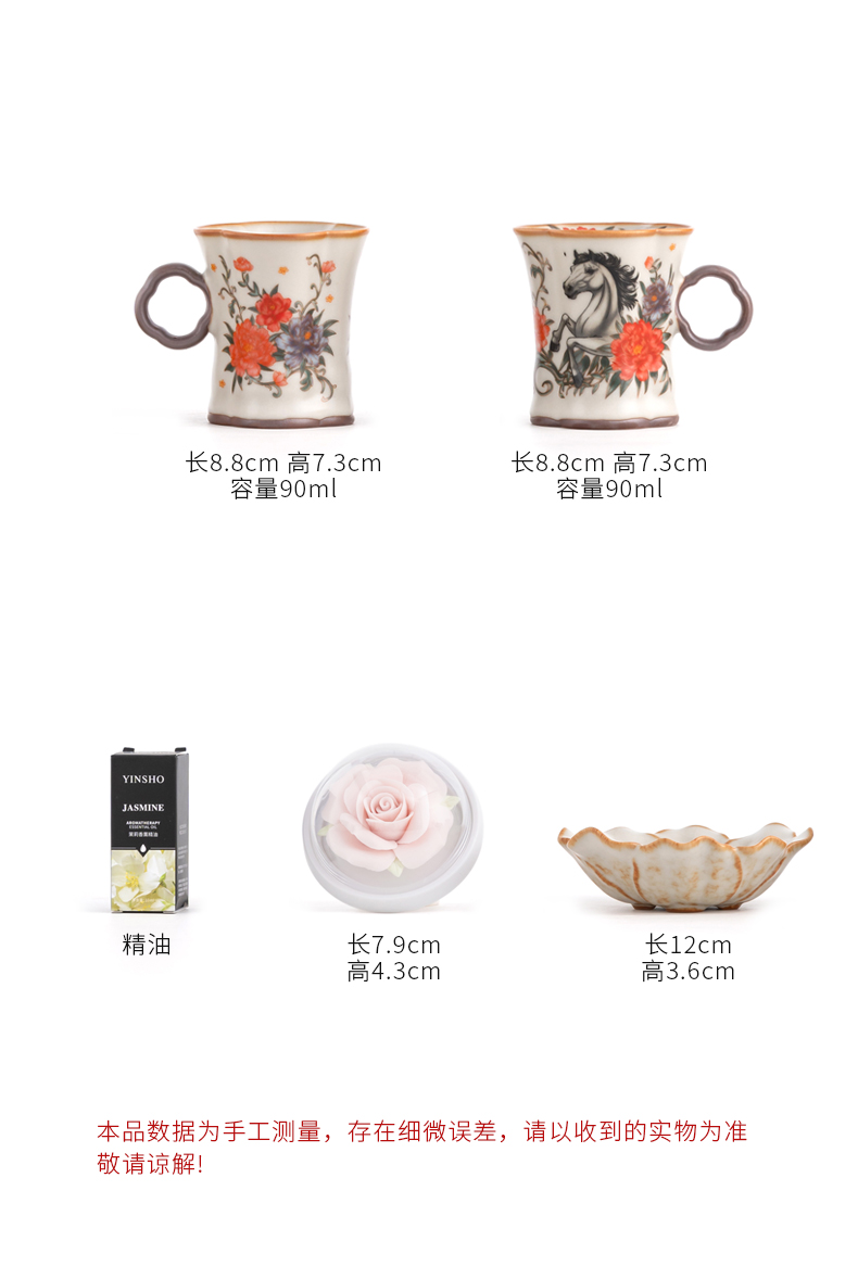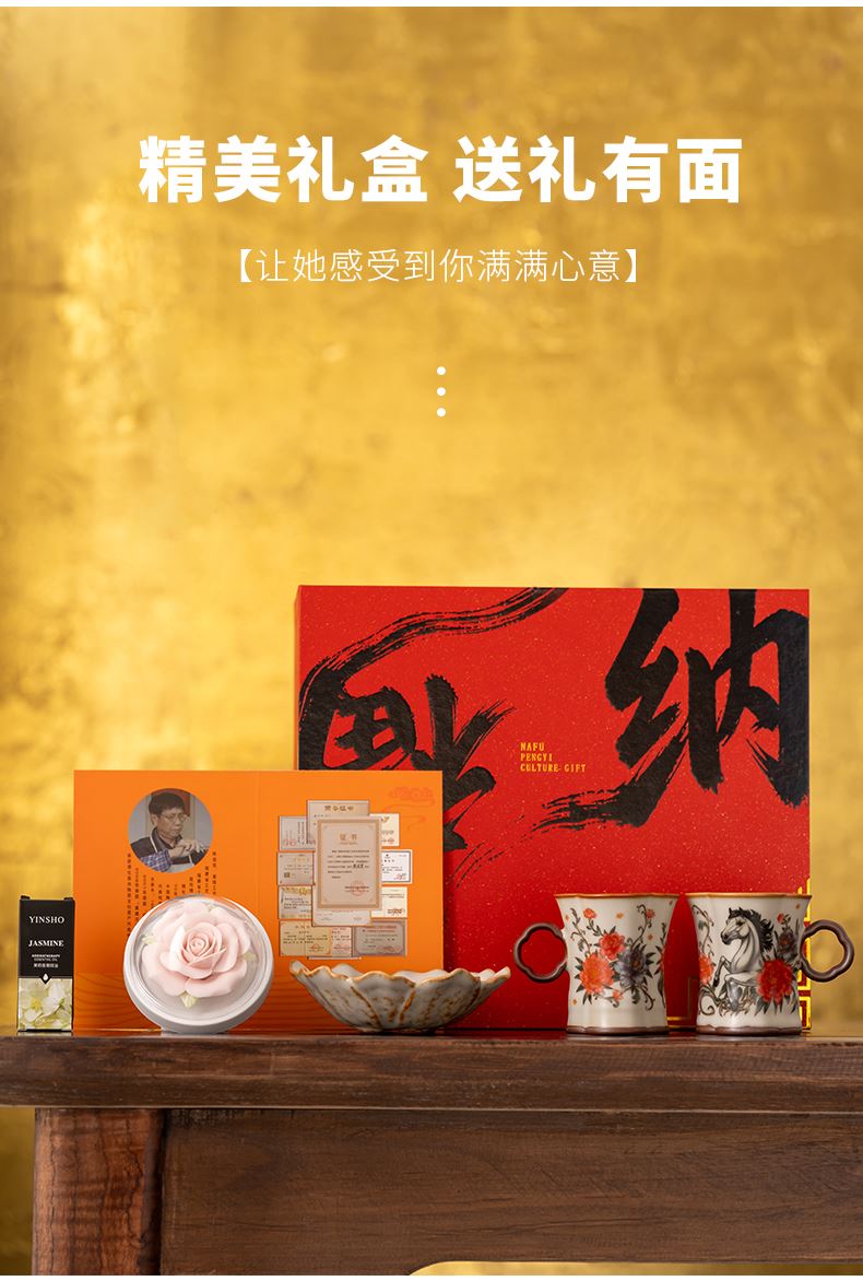 配 制:2杯 1香盘 1玫瑰瓷雕扩香器 1精油 1收藏证书 1礼盒 手提袋 材质:汝黄瓷 规格:手柄杯 6*9cm 碟子直径9.3cm高1.8cm 玫瑰扩香器7.9*4.3cm 容量:手柄杯70ml 推荐说明:香薰套装,非遗文化手工瓷雕玫瑰,扩香器,配精油一瓶。亚黄汝瓷,玛瑙入釉,蝉翼开片,内外皆有花面,家有千财万贯,不如汝窑一片。技术新品。画面堆料技术,富有立体浮雕质感,真实感强。杯身开片,可养瓷。