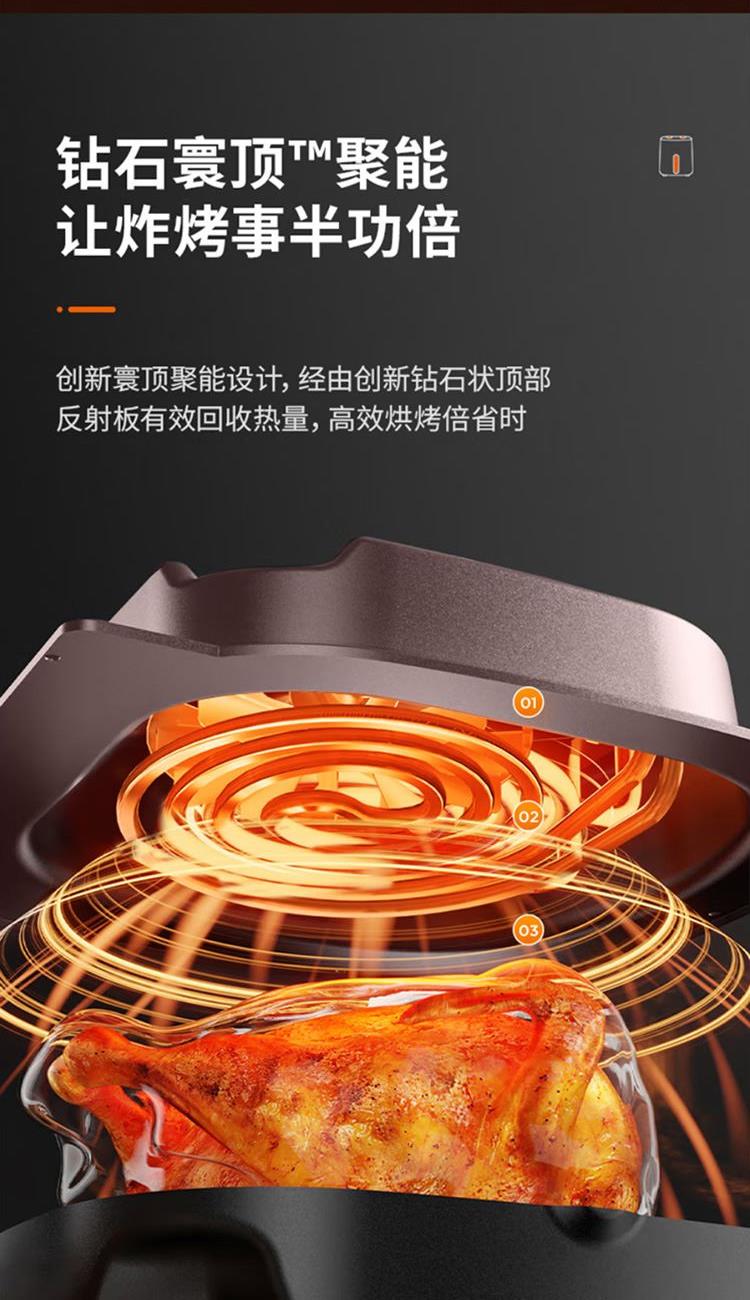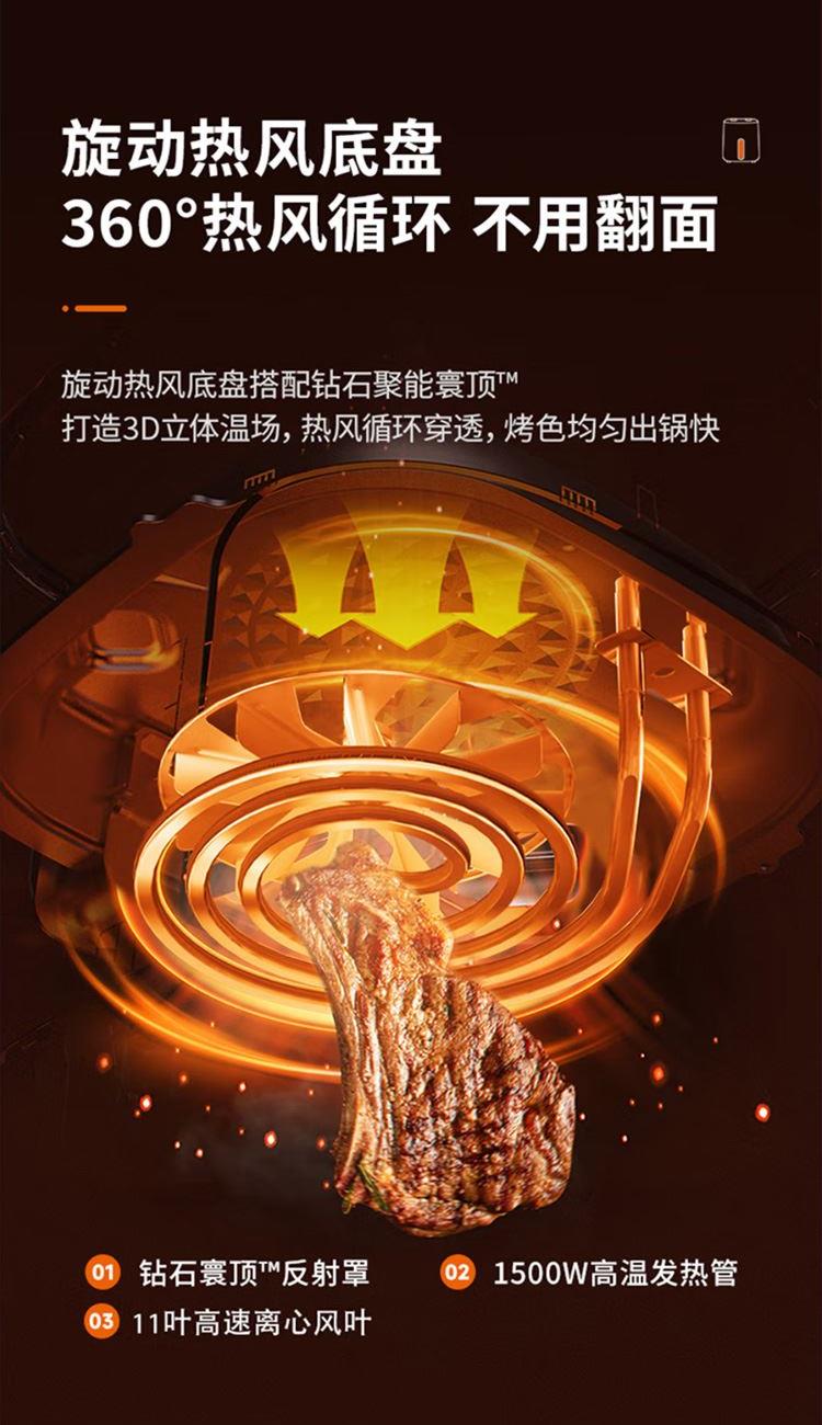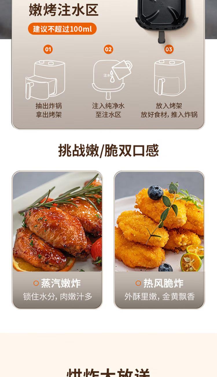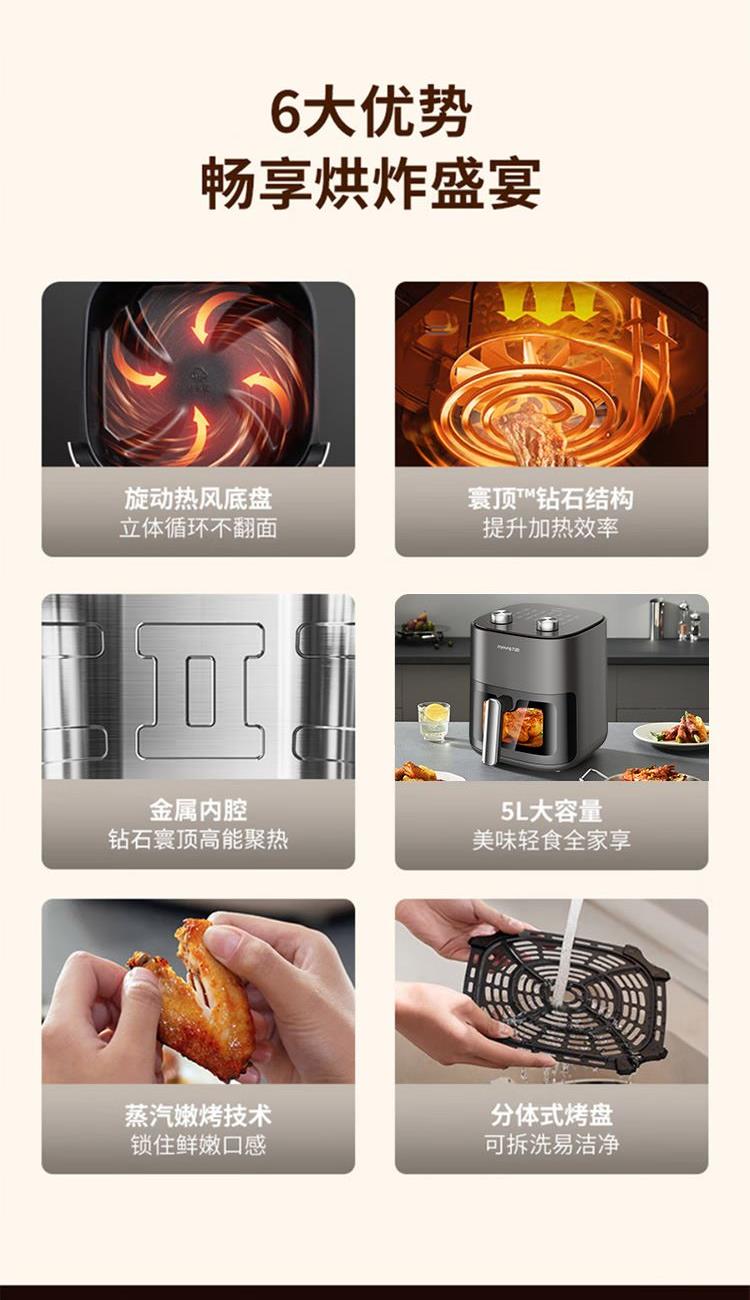 旋动热风烤盘,立体匀热不翻面 双旋钮易操作,注水嫩烤 1500W 调温调时 0-60min 80℃-200℃ 5L大容量,适合3-5口之家 抽锅断电设计,烹饪更安心 可视化窗口