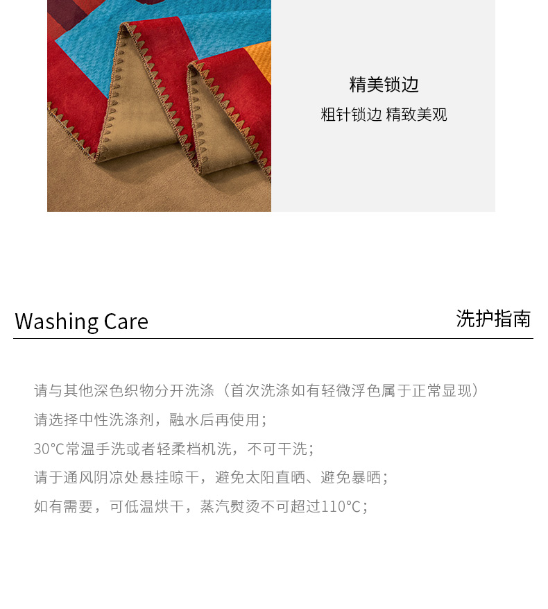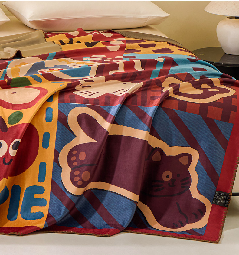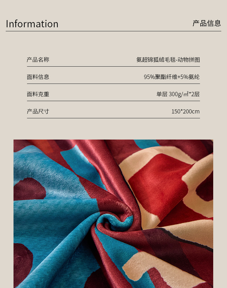 尺寸:150*200cm 面料:95%聚酯纤维+5%氨纶 执行标准:GB/T22796-2021 安全类别:GB18401-2010 B类 1.柔软亲肤,绒毛舒适。蓄热保暖如春天般的温暖。面料经过无静电处理,健康舒适环保。同时采用绿色环保印染工艺,持久鲜艳 2.简约设计,使得毯子更显档次,更显时尚。精致的包边工艺,做工精细,针脚细密,不易脱线,牢固耐用。