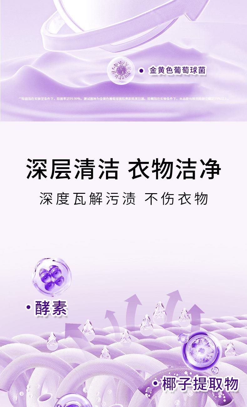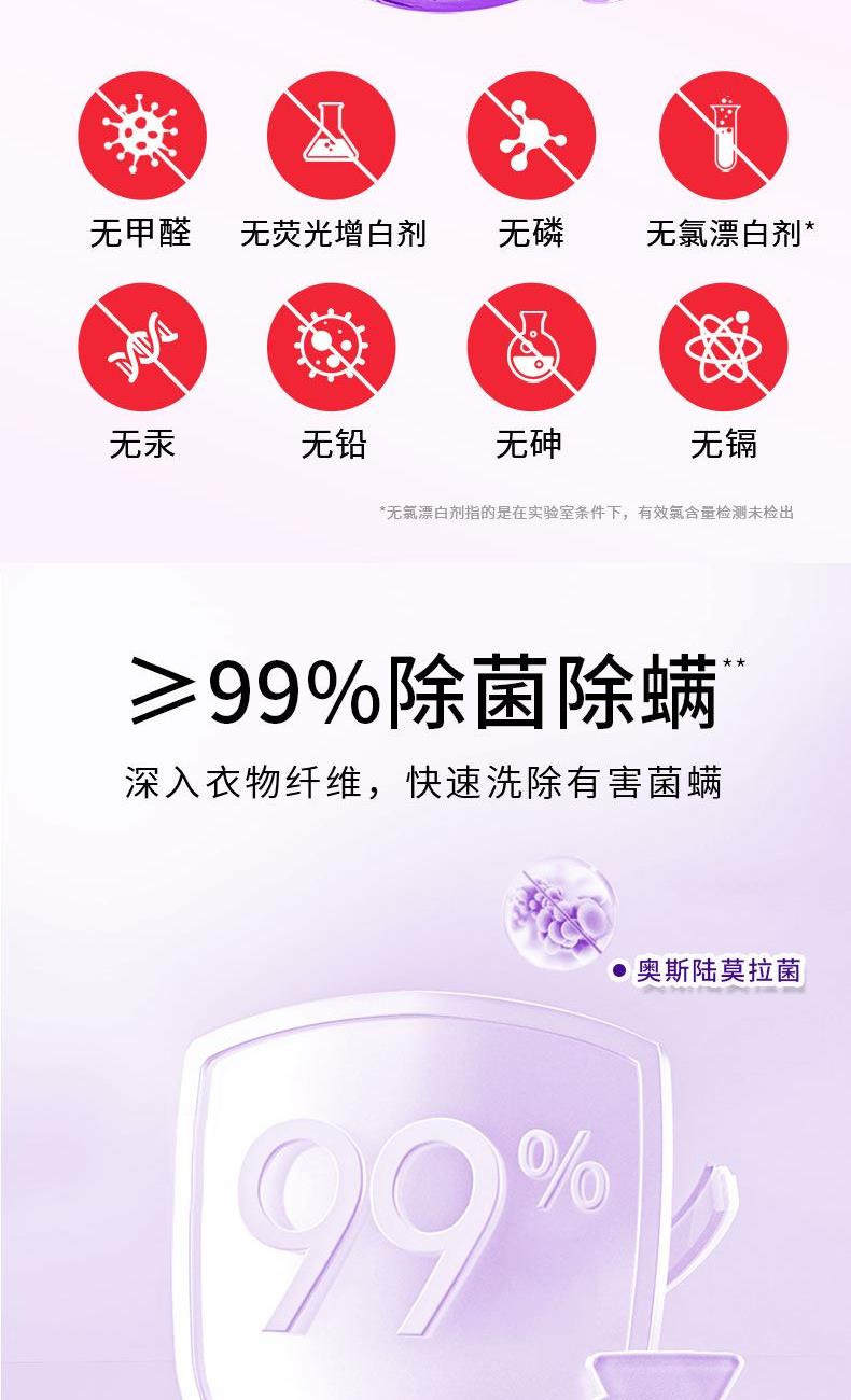 特点:除螨,深层去渍,72小时持久留香 ※,99.98%高效除螨率,使用更安心, ※欧洲国际进口大师高定香氛普罗旺斯薰衣草,72小时持久留香,不伤衣物柔软护衣,洗后不褪色不发硬,晒后柔软蓬松。※低泡易漂更省心,有效去黄去渍,清除衣物各种污渍难题。 ※无甲醛、无漂白剂、无荧光剂,无磷,中性PH值,超强去污力