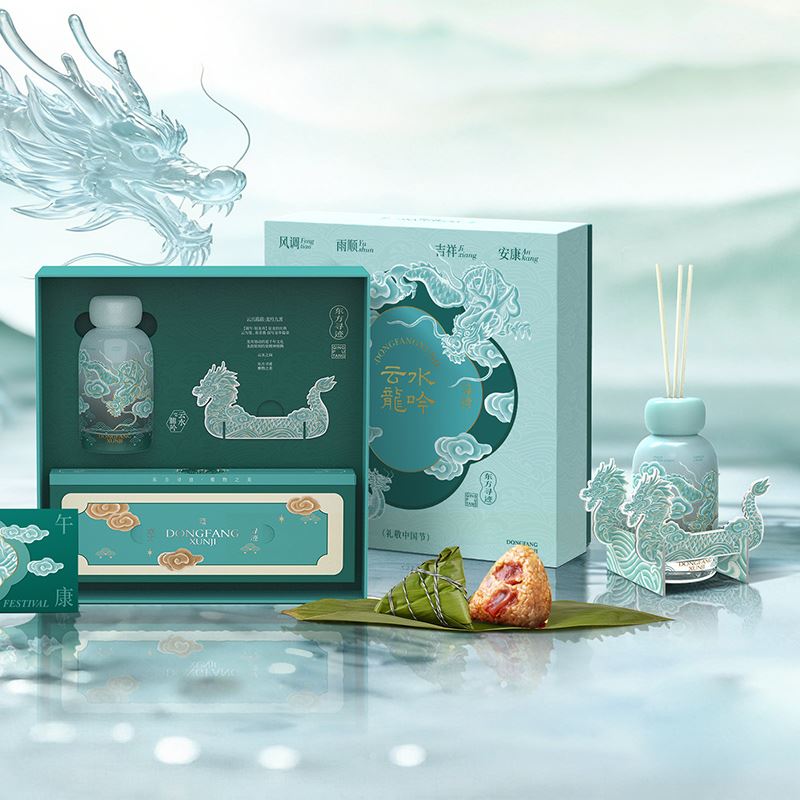 配置 · ① 无火香氛液×1瓶 (200ml-乌木沉香) ② 龙舟纸框景×4片 ③ 香液扩香棒×1套 ④ 发芽糙米粽×2只(100g/只) ⑤ 端午礼卡×1份 ⑥ 云水龙吟礼盒×1套(含袋) 尺寸 · 290×290×95mm