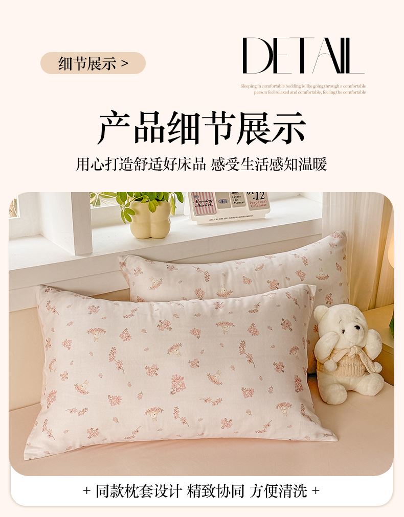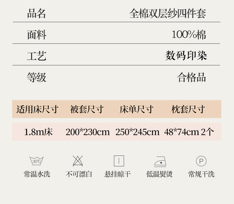 被套:200×230cm 床单:245×245cm 枕套:48×74cm 适用:1.5M-1.8M床 面料:双层纱(全棉) 全棉双层纱面料 邂逅高密全棉双层纱面料制作亲肤舒适兼具触觉与视觉享受,有良好的透气性、吸湿性时刻拥有春风徐徐般的柔软体验。
