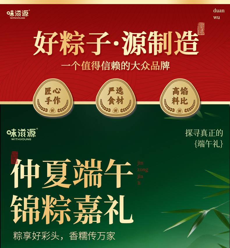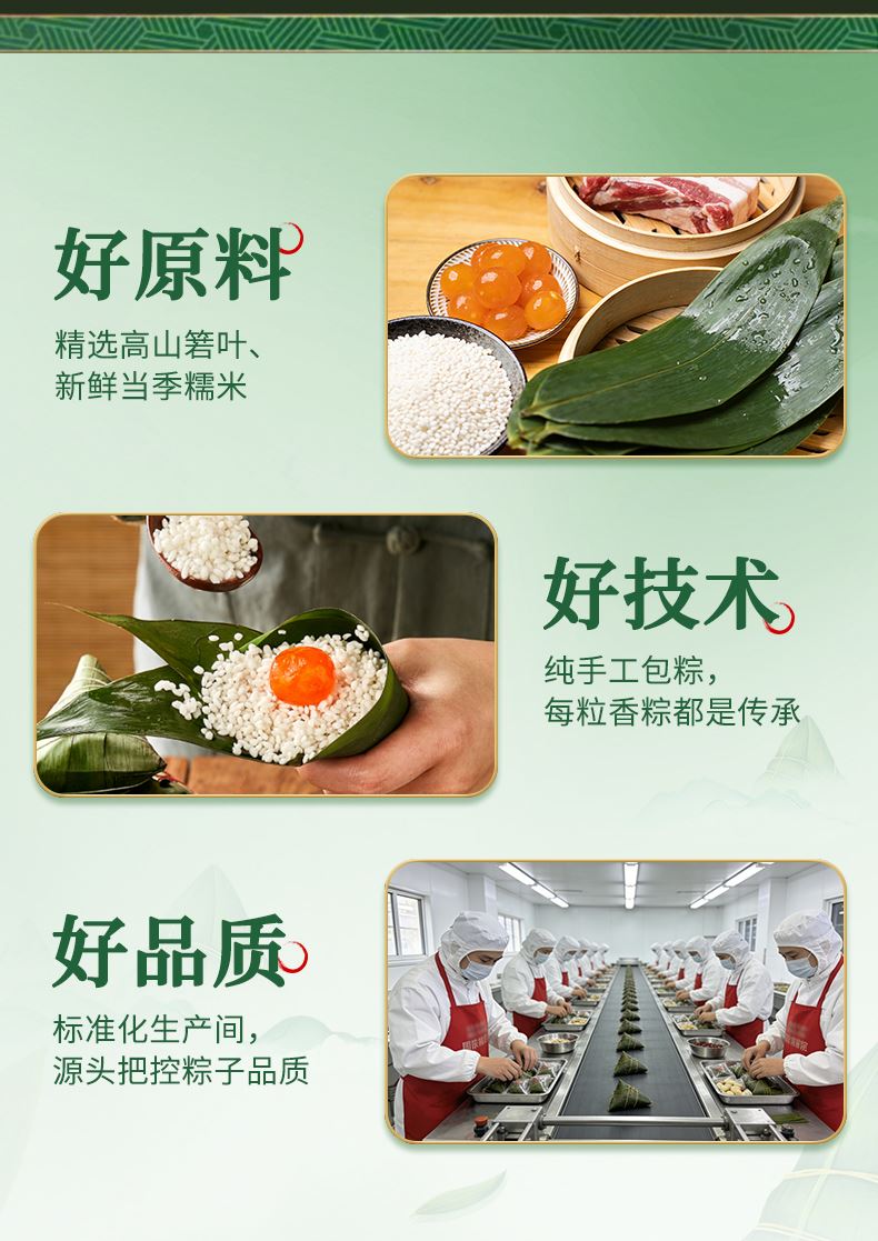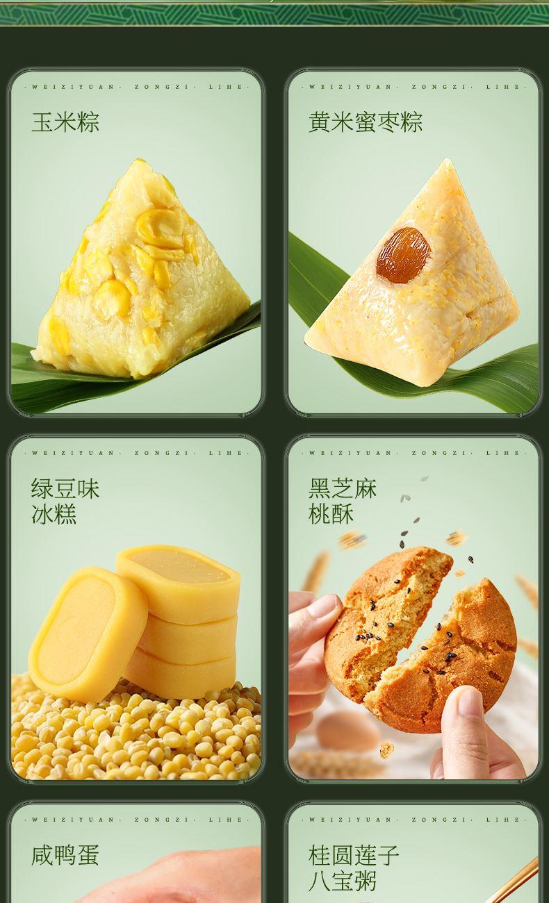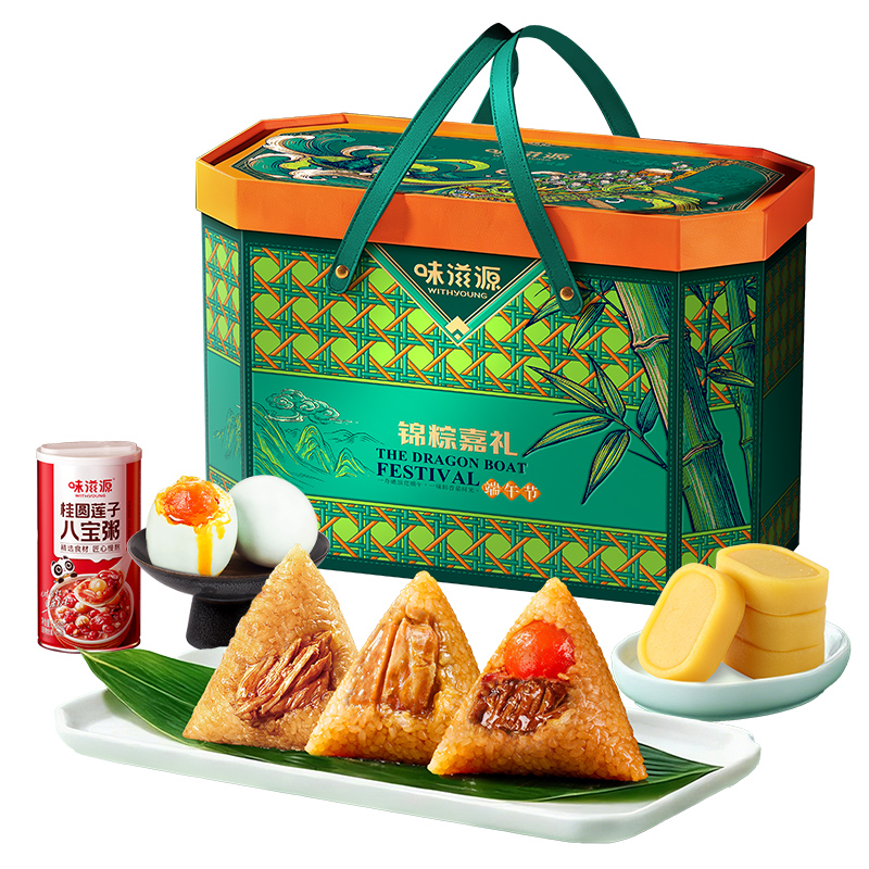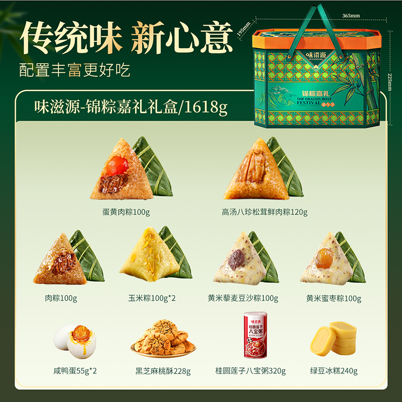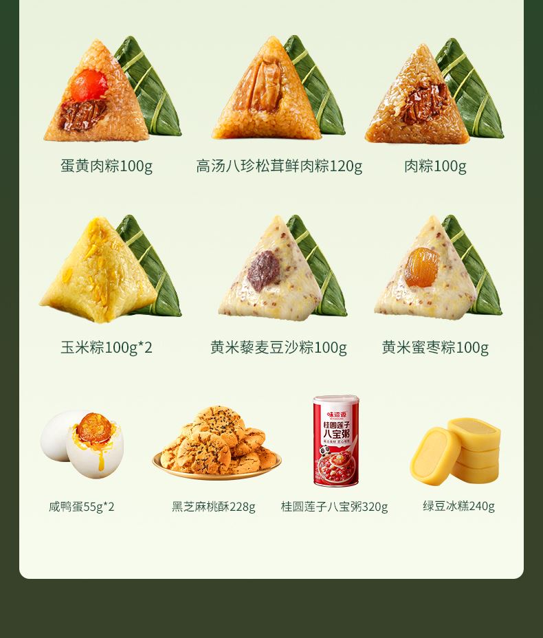 味滋源 高汤八珍松茸鲜肉粽120g 味滋源 蛋黄肉粽100g 味滋源 鲜肉粽单枚100g 味滋源 黄米藜麦豆沙粽100g 味滋源 黄米蜜枣粽100g 味滋源 玉米粽100g*2 味滋源 咸鸭蛋55g*2 味滋源 绿豆冰糕240g 味滋源 桂圆莲子八宝粥320g 味滋源 芝麻桃酥228g