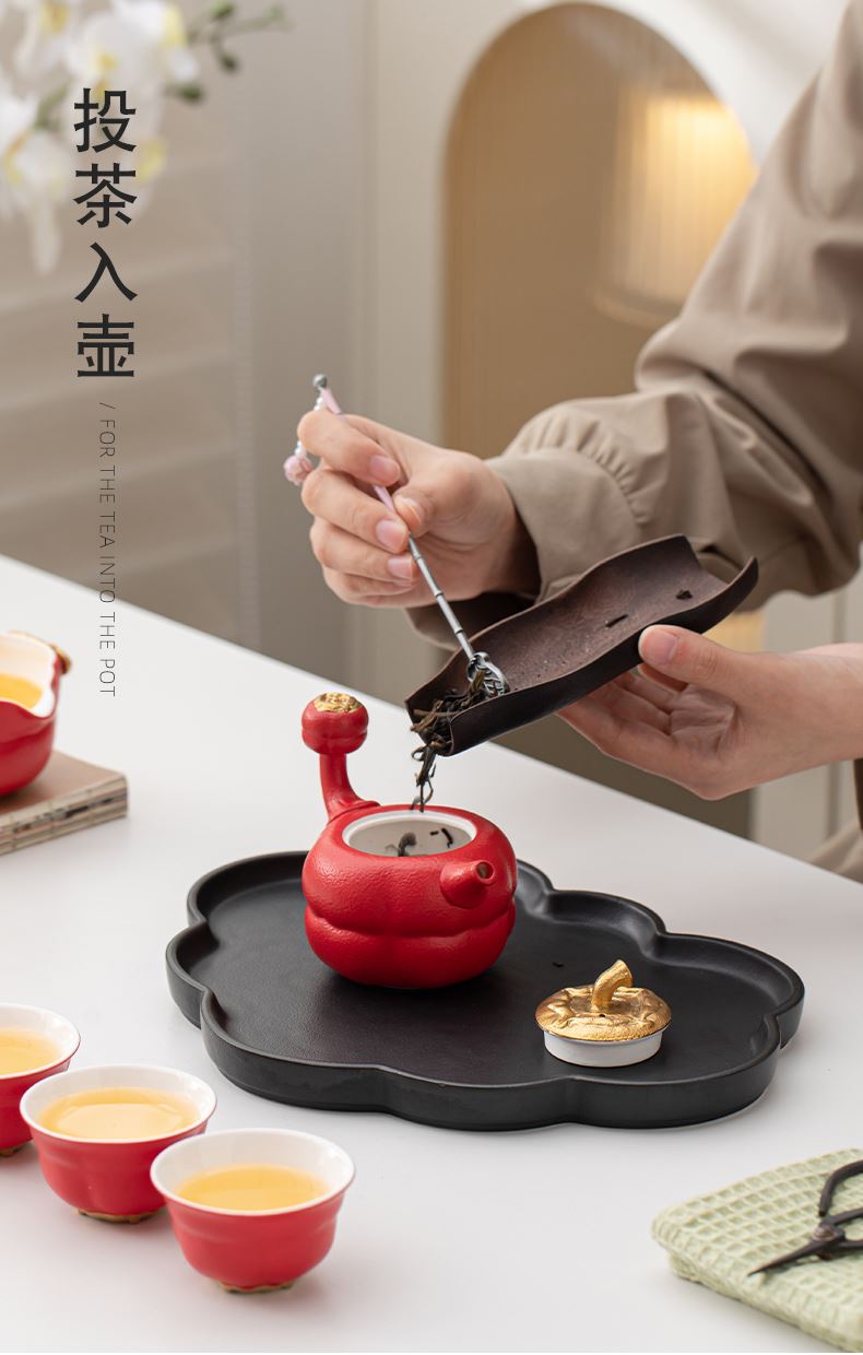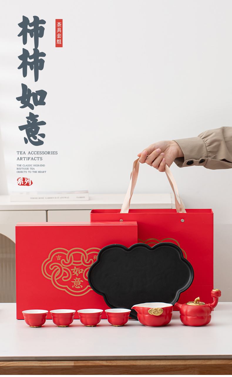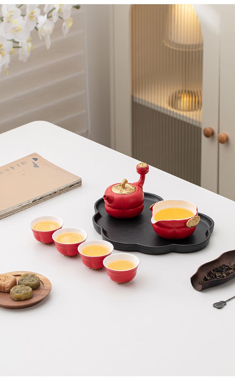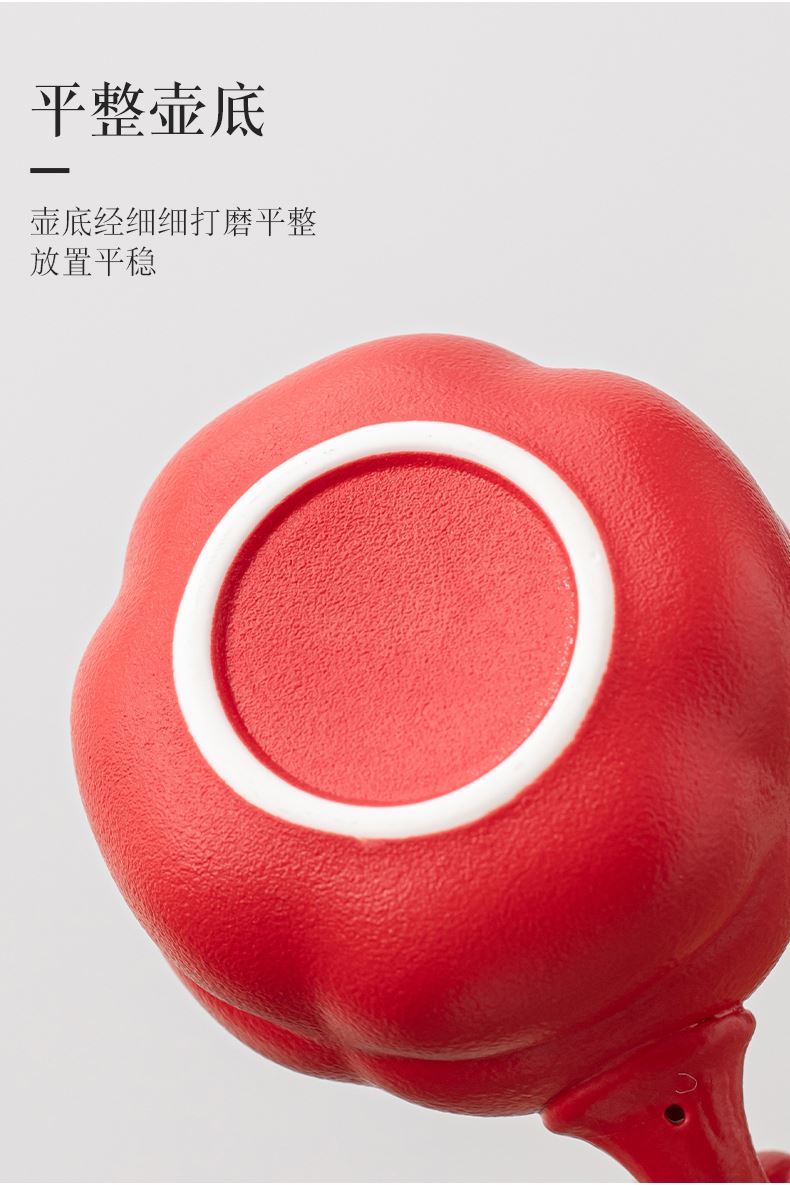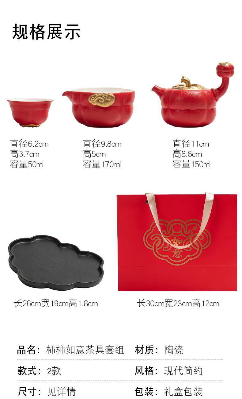壶:11*8.6厘米150ml 茶海:9.8*5厘米170ml 品茗杯:6.2*4厘米50ml 茶盘:25*19*1.8厘米 礼盒:30*23*12厘米 造型形象生动,寓意美好,天然矿物釉,高温烧制无铅镉 ,瓷胎密实不吸茶香,久用更显韵味 。