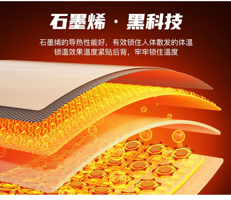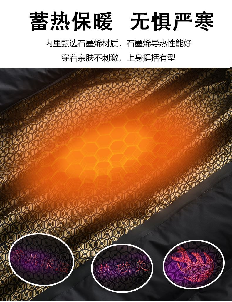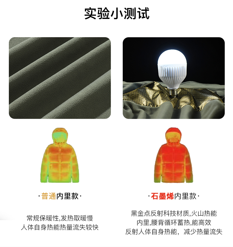 》面料:石墨烯科技面料 》功能:抗静电 》面料成分:聚酯纤维 》里料成分:聚酯纤维 》内胆成分:聚酯纤维 》产品优点: 黑金石墨烯 循环导热 蓄温保暖快速导热提温 无惧严寒科技御寒 牢牢锁温 持续保温适合日常通勤 登山露营