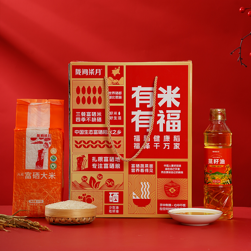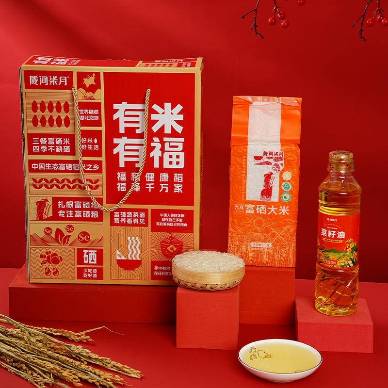 有米有福A2·米油礼盒1kg+418ml 产品配置:六月富硒大米1kg、暮秋坊菜籽油418ml 尺 寸:250×70×320mm 产品特色 1、硒有助于维持免疫系统的正常生理功能; 2、富硒大米富含有机硒,更易被人体利用吸收; 3、菜籽油油品透亮、香味浓郁,富硒西红柿面爽口细腻,入口顺滑。