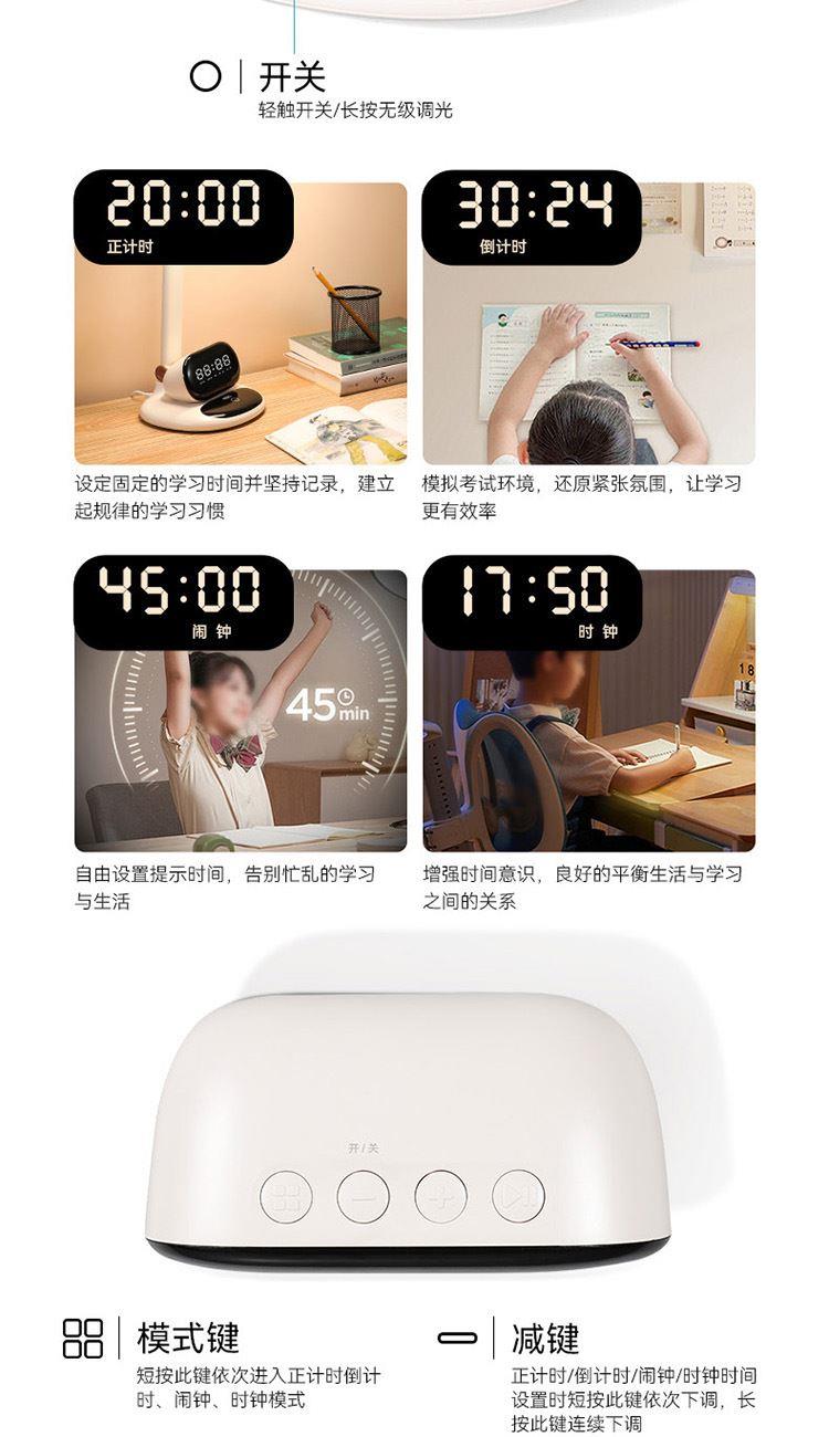 额定功率:15W 产品尺寸:366X441X258mm 充电时间:4小时(时钟) 使用时间:50小时/1200毫安(时钟) 色温:3800-4200K 1、横弧双灯头,国AA照度认证 2、全光谱灯珠,护眼用光 3、时间管理器(时钟/闹钟/计时) 4、双轴结构,调节多样 5、无级调光,反应灵敏 6、分离式结构 7、type-C接口充电 8、用光记忆 9、黑色镜面显示,更显质感 10.国标V0防火等级要求
