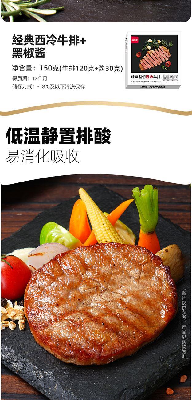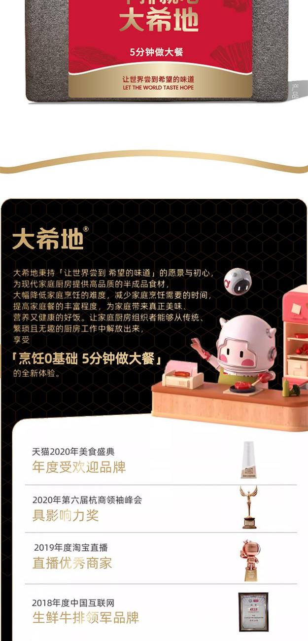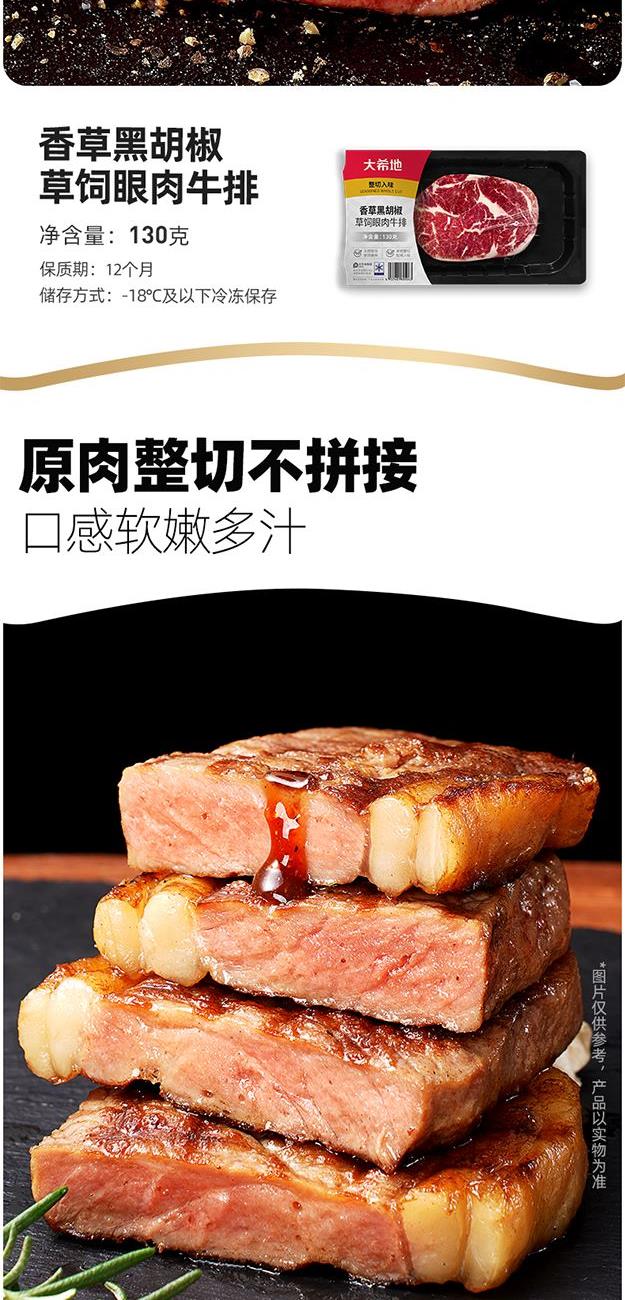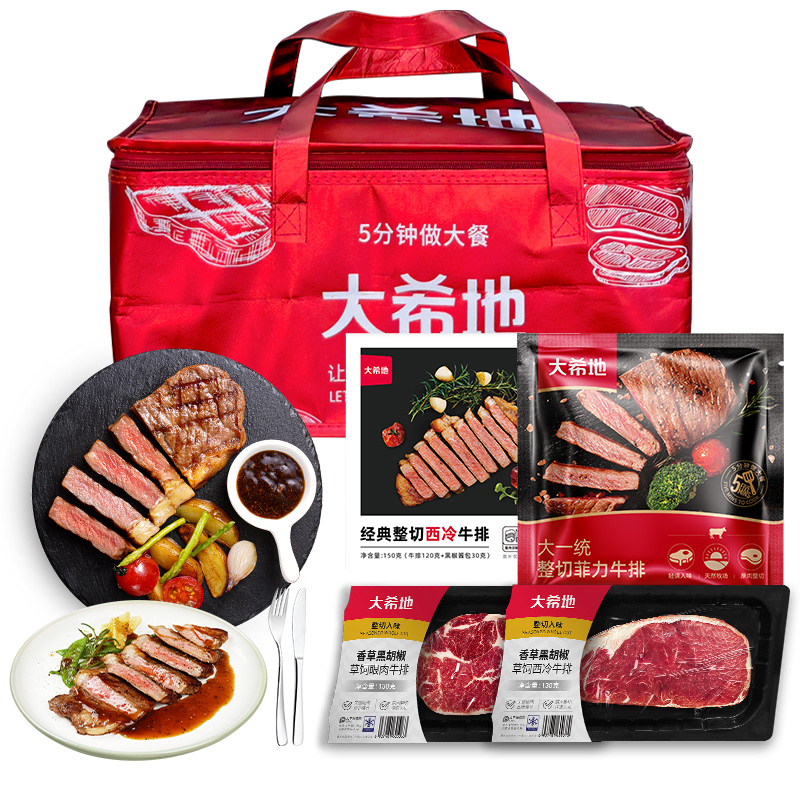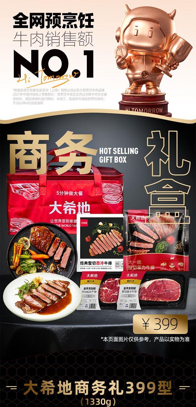 DXDSW-01 大希地商务礼399型 大希地 香草黑胡椒草饲西冷牛排130g(贴肤装)*2 大希地经典西冷牛排120g+黑椒酱30g(盒装)*1 大希地 香草黑胡椒草饲眼肉牛排130g(贴肤装)*2 大一统整切菲力牛排130g(2片袋装)*2 大希地牛仔骨200g*2 精美刀叉一副"