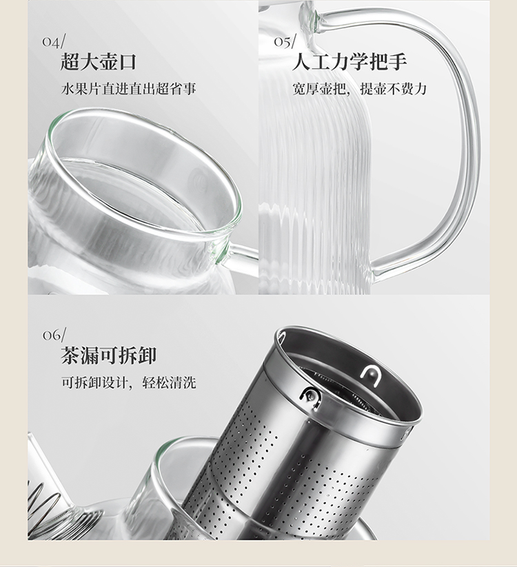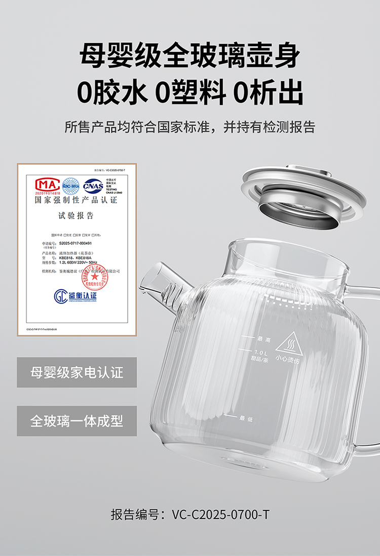 母婴级全玻璃壶身,0胶水 0塑料 0析出,加厚高硼硅玻璃材质,使用安全更放心