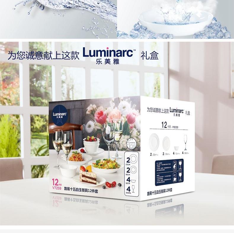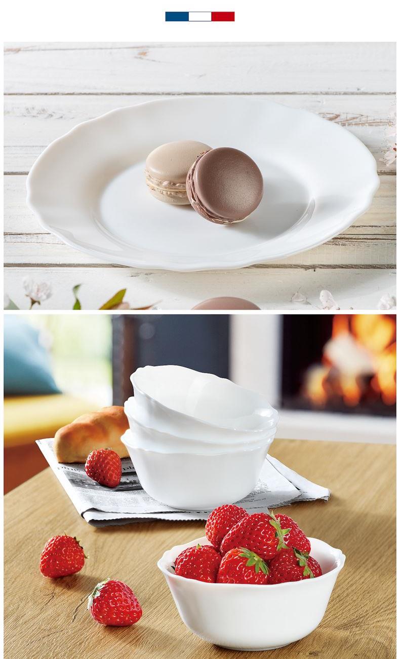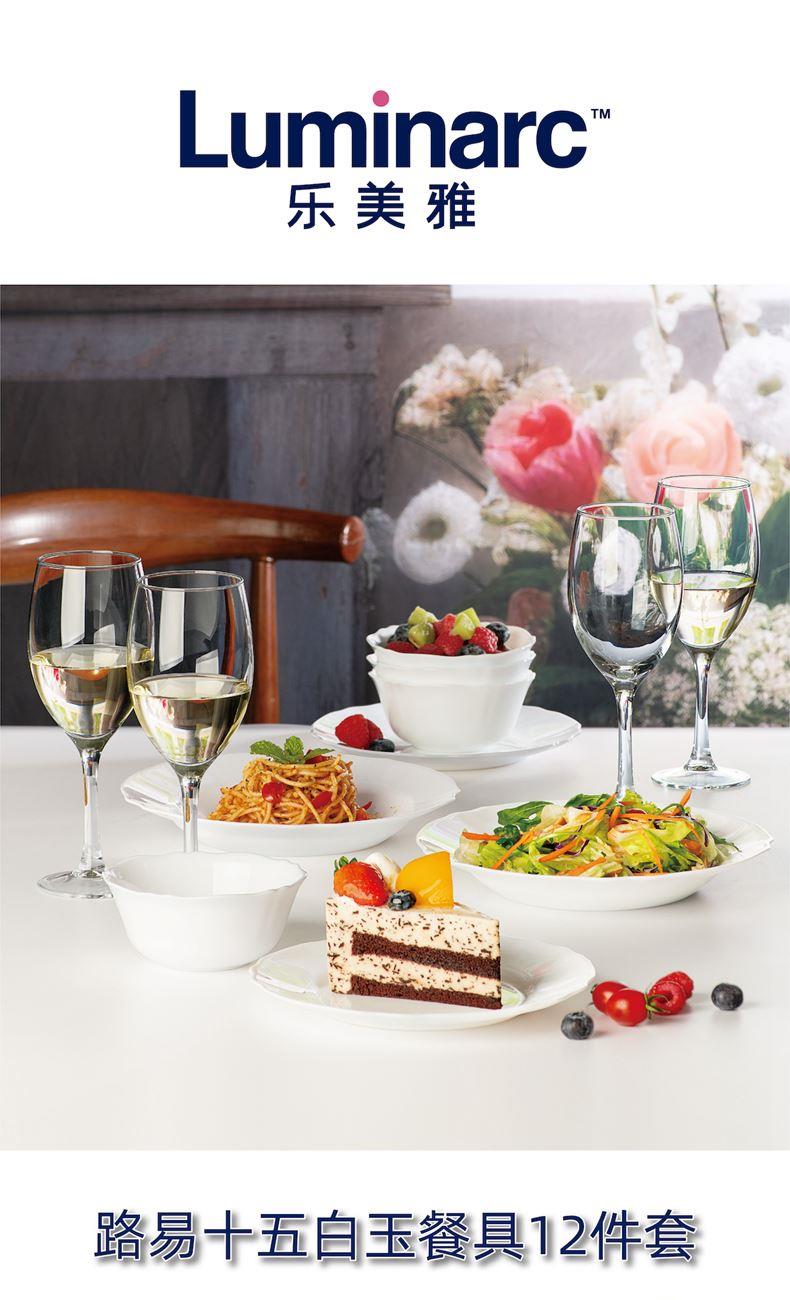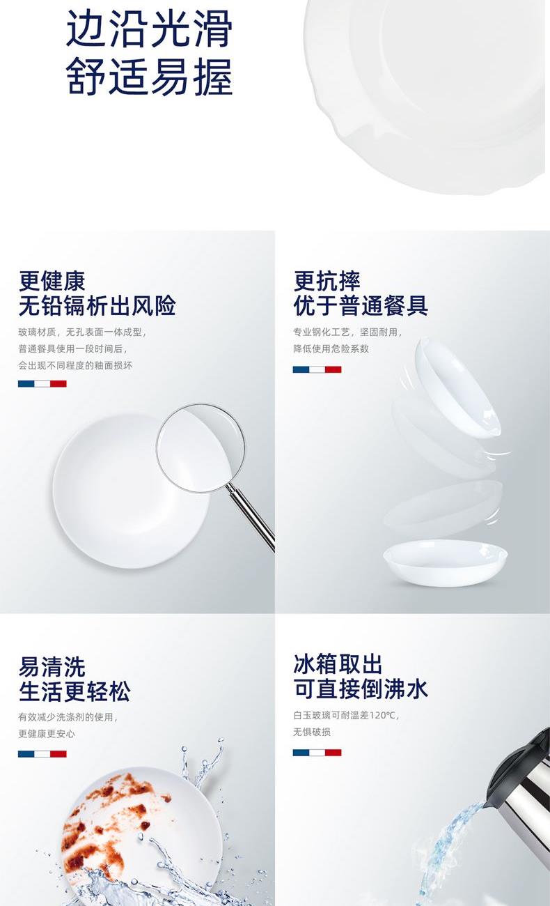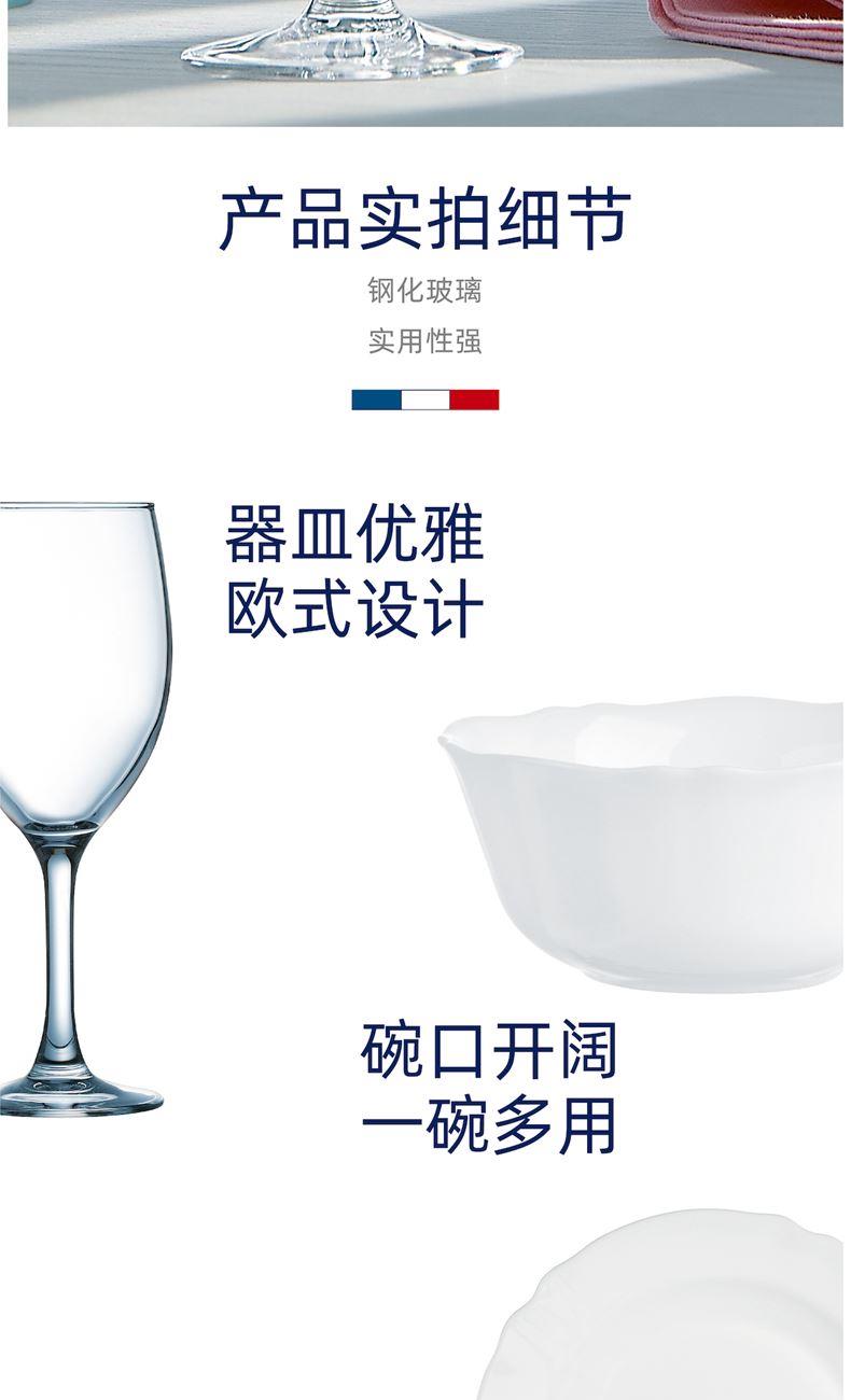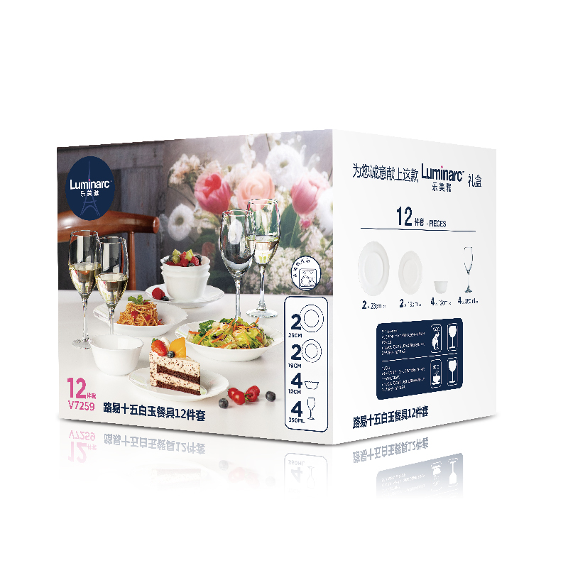 套件组成: 饭碗12cm*4+深盘23cm*2+平盘19cm*2+晨露高脚杯350ml*4 材质:碗,盘--白玉玻璃,钢化工艺 高脚杯--钠钙玻璃 包装:彩盒 外箱尺寸:512*301*274mm 毛重:3.4kg/7.4kg 特点: 1.无铅玻璃材质,环保、健康 2.全钢化工艺,抗震耐刮擦,耐温差120°C,微波炉、洗碗机、皆适用 3.无孔表面,易冲无残留,减少细菌产生 4.法式设计, 质薄轻巧,方便收纳,节省空间