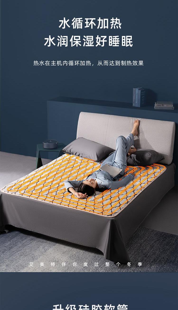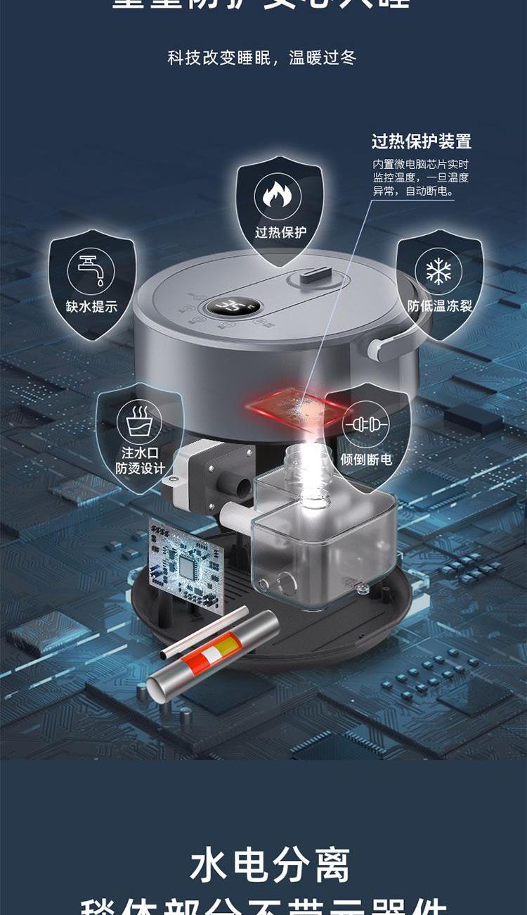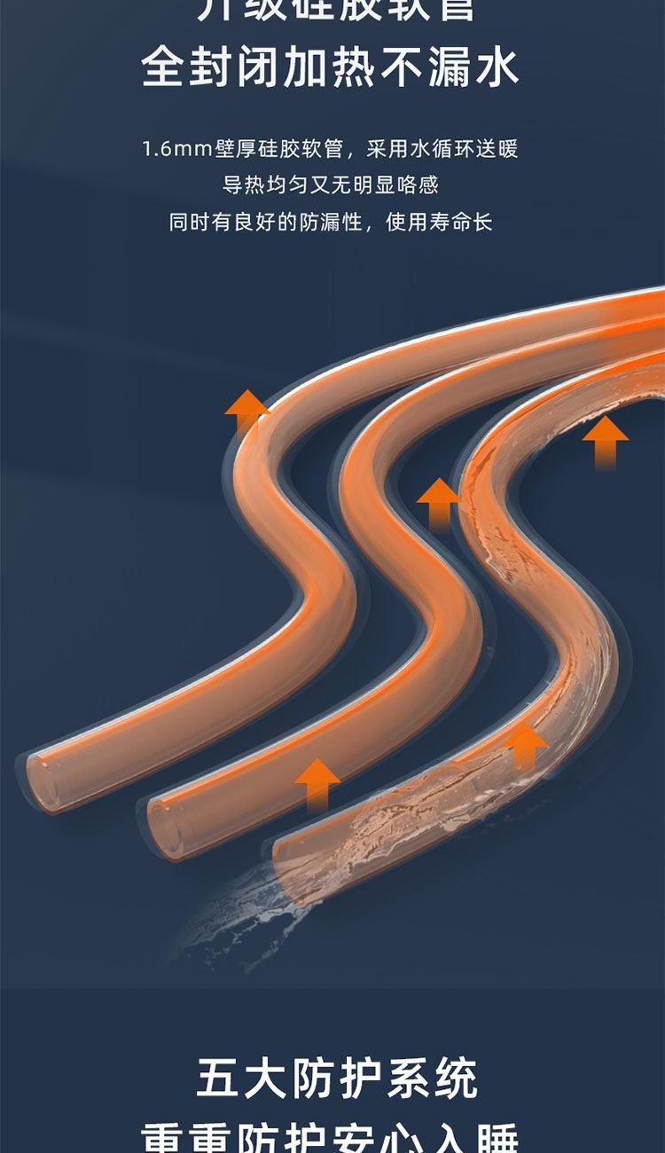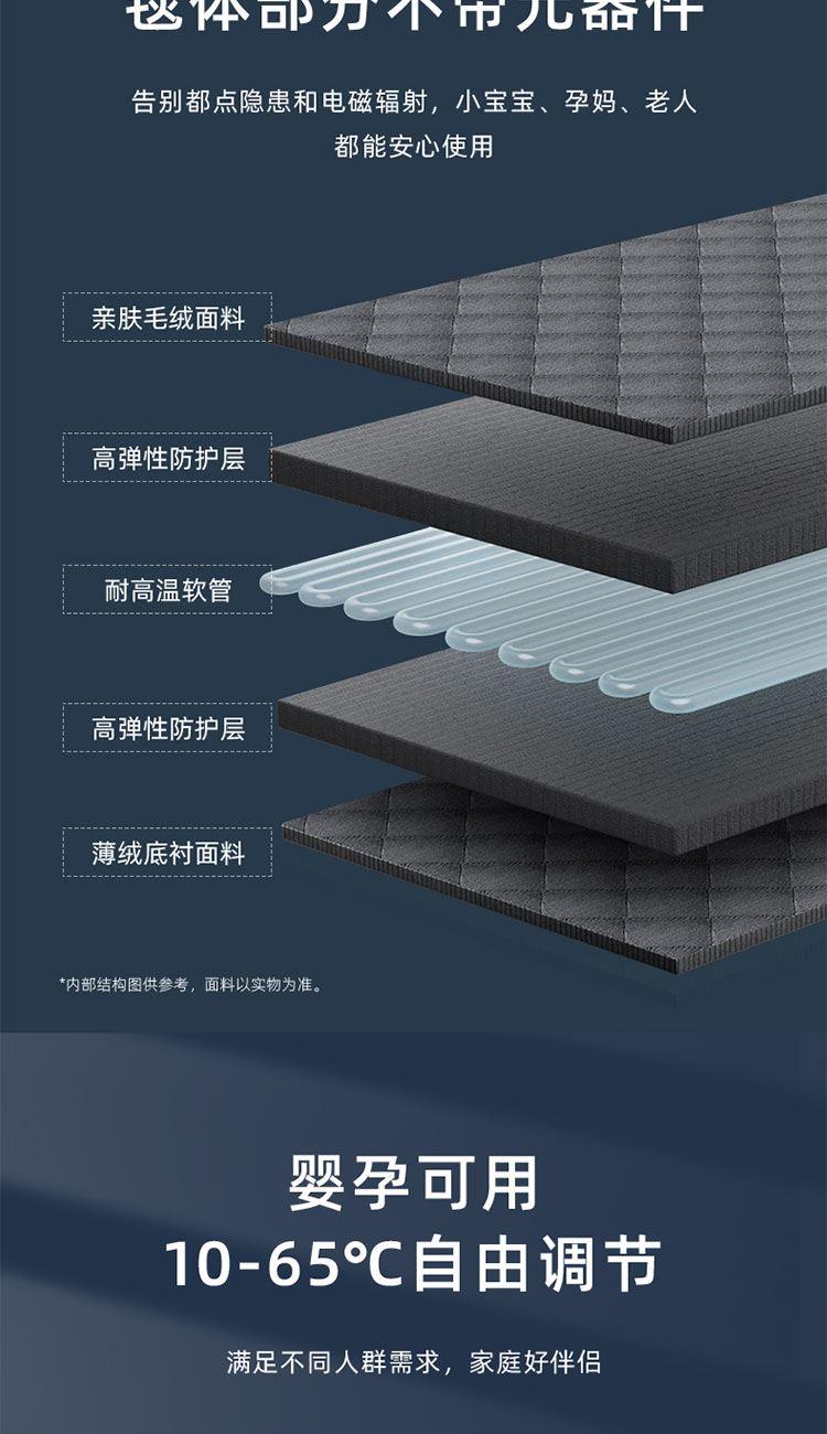 额定功率:250W 额定电压:220V 额定频率:50Hz 水箱容量:0.6L 档位温度:10~65℃ 净 重 :4.5Kg 毛 重 :4.8Kg 包装尺寸:505x255x405mm 1、温泉模式,恒温加热不干燥 2、水循环加热,水润保湿好睡眠 3、升级硅胶软管,全封闭加热不漏水 4、五大防护系统,重重防护安心入睡 5、水电分离,毯体部分不带元器件 6、婴孕可用,10-65°C自由调节 7、远距遥控,不用远离温暖被窝 8、温馨小夜灯,黑暗也有陪伴