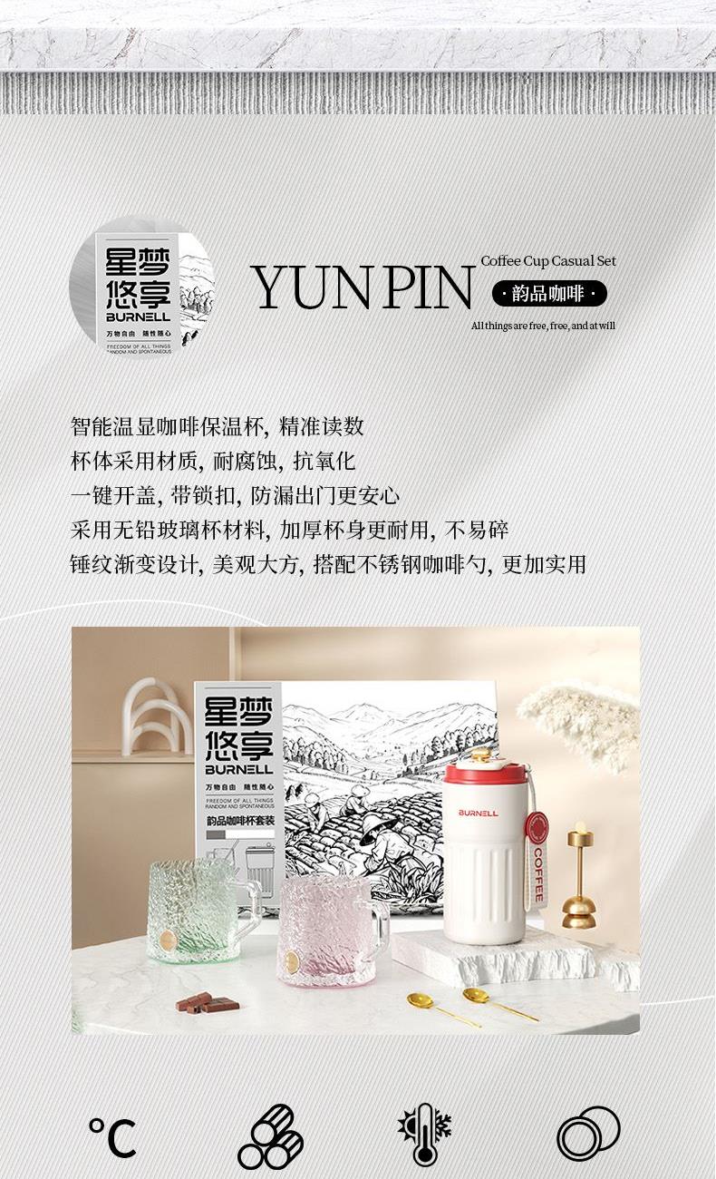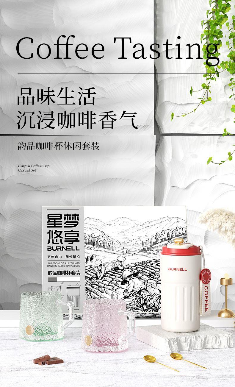 材 质:304不锈钢+无铅钠钙玻璃+PP 配 置:咖啡杯*1;玄冰玻璃杯*2;咖啡勺*2 规 格:咖啡杯450mL;玻璃杯400ml;咖啡勺15cm*3 装 箱 数:12pcs/箱 杯体采用304材质,耐腐蚀 一键开盖,带锁扣,防漏出门更安心。 玻璃杯采用无铅纳钙玻璃杯材料,加厚杯身,更耐用,不易碎。 锤纹渐变设计,美观大方,搭配304不锈钢咖啡勺,更加实 用,健康。 礼盒包装,彰显珍贵品质。
