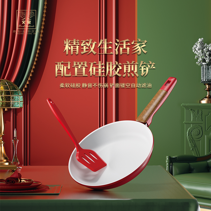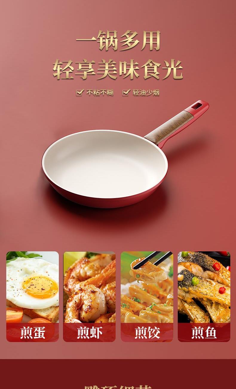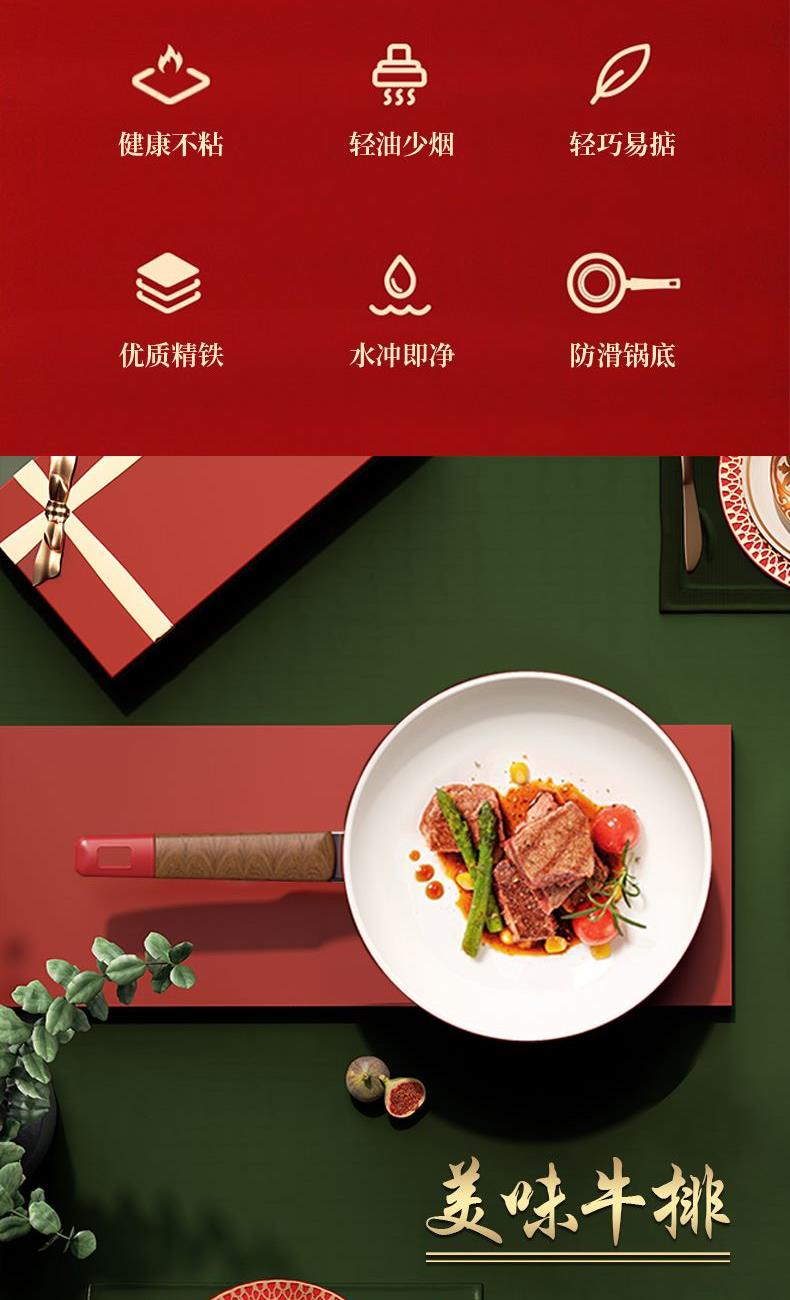 规 格:煎锅24cm 、煎铲 材 质:煎锅:优质精铁、煎铲:硅胶 颜 色:红色 彩 盒 尺 寸:29.5x7.3x46.3CM 外 箱 尺 寸:L68*W61*H47.8CM 1、采用加厚优质精铁打造锅身,耐高温陶晶不粘涂层。油烟少,不粘效果强。 2、煎牛排、煎蛋、煎鱼;煎炒两用,功能强大。 3、彩绘手柄设计,配置食品级硅胶煎铲,彰显高贵。 4、龙腾盛世主题彩盒包装,寓意国强民富,福运到来。
