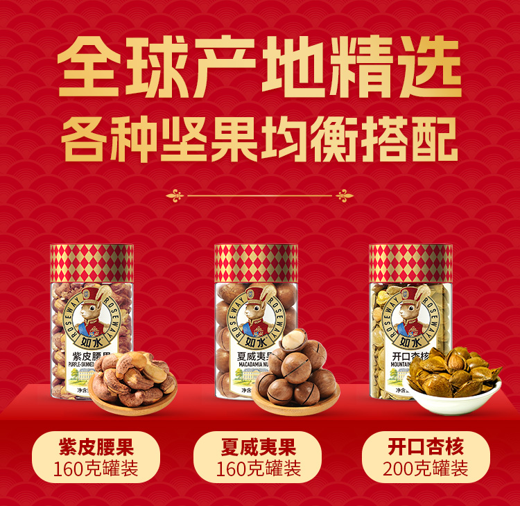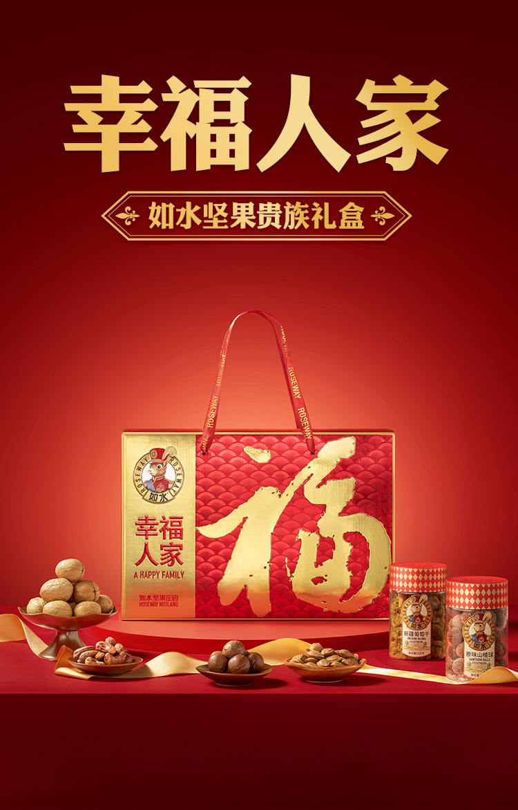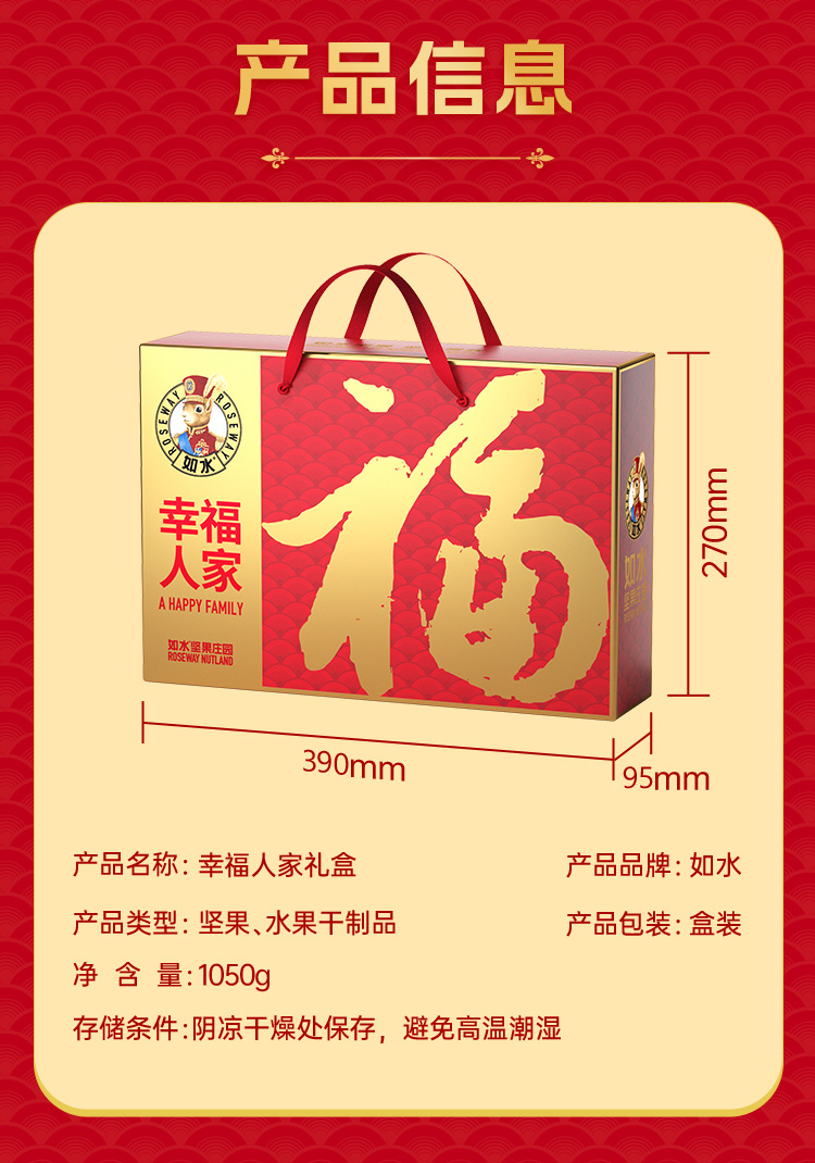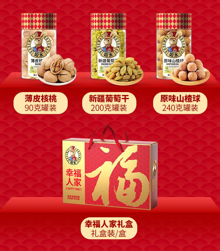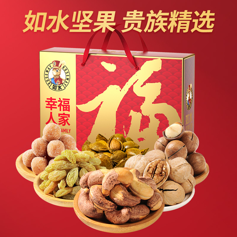 如水幸福人家礼盒 净含量:1050g 如水紫皮腰果160g 如水夏威夷果160g 如水开口杏核200g 如水薄皮核桃90g 如水新疆葡萄干200g 如水原味山楂球240g