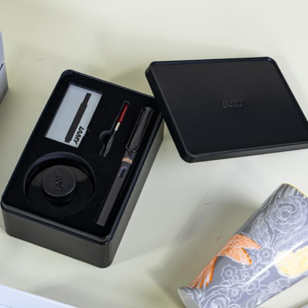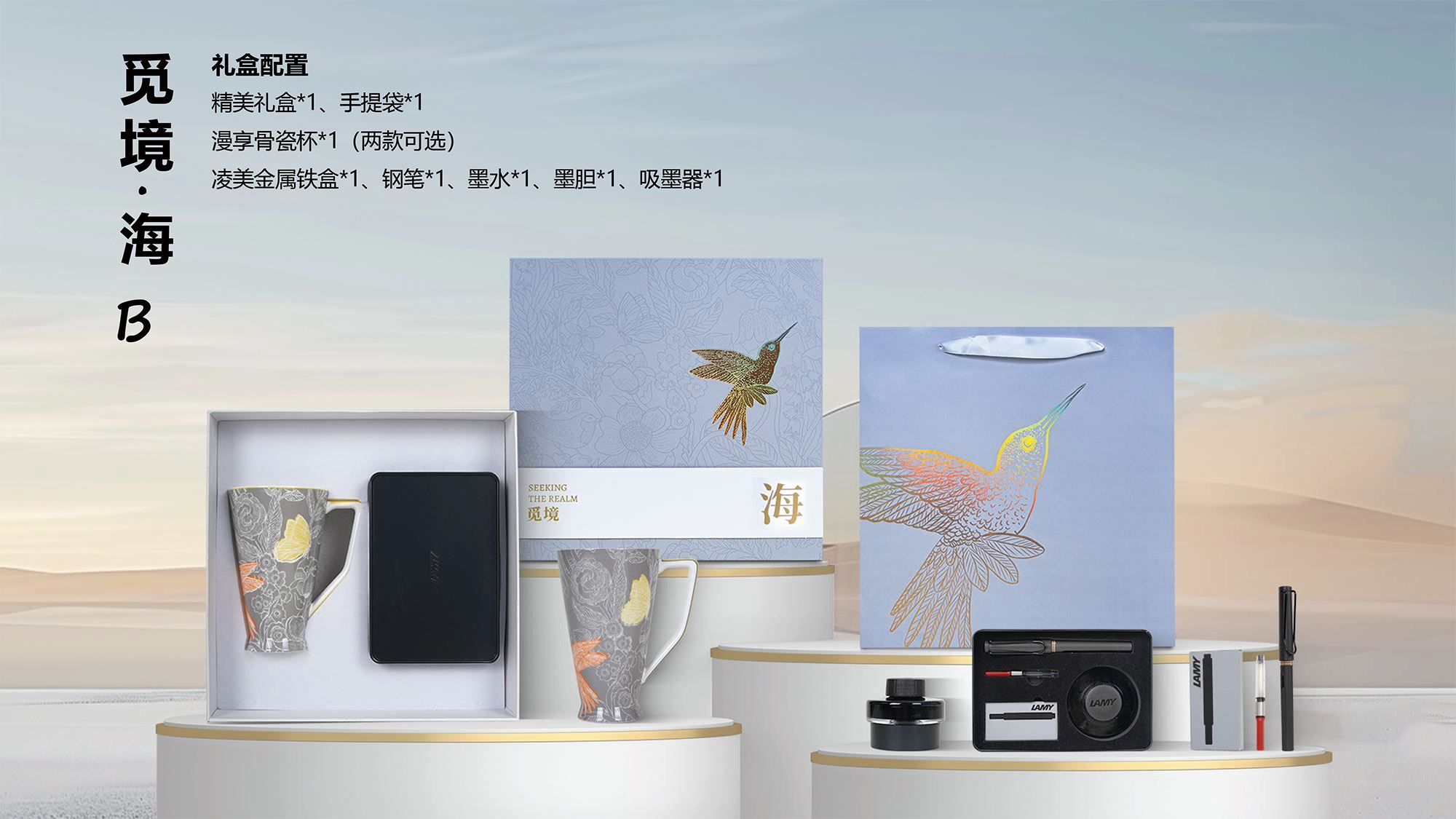 精美礼盒*1、手提袋*1 漫享骨瓷杯*1(两款可选) 凌美金属铁盒*1、钢笔*1、墨水*1、墨胆*1、吸墨器*1