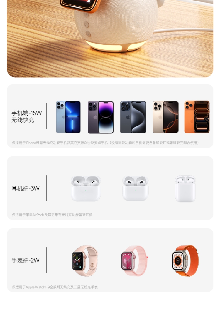 耳机端:5V1A(3W) 手表端:5V0.4A(2W)
