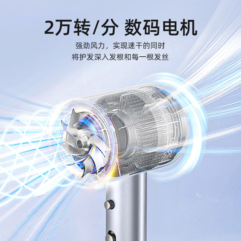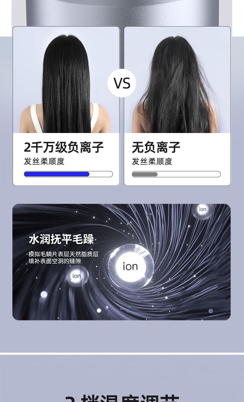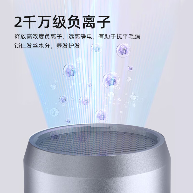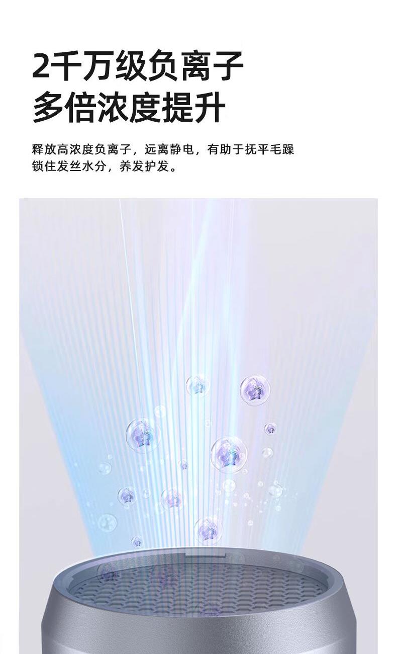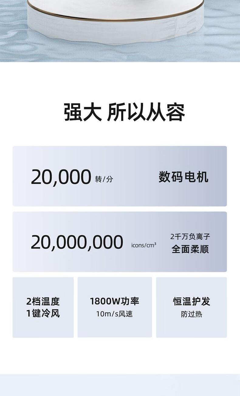 产品材质:阻燃PP 额定电压:220V~50Hz 额定功率:1800W 负离子:2千万 档位:三档 产品重量:500g 产品尺寸:273x206x87mm 商品条形码:6970539872468 创新无刷电机,1800W大功率; 20000转/分钟,气流强劲,速干无需久等; 释放高浓度2千万级负离子,远离静电,养发护发; 2档温度调节,1键冷风,灵活操控; 内置智能恒温温控器,实时监测风温,有效避免过热烫伤; 360°可旋转造型风嘴,多种造型轻松驾驭。