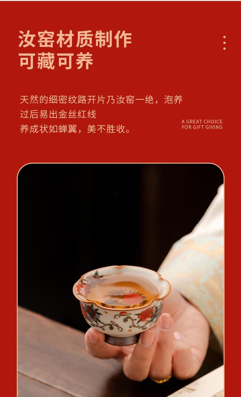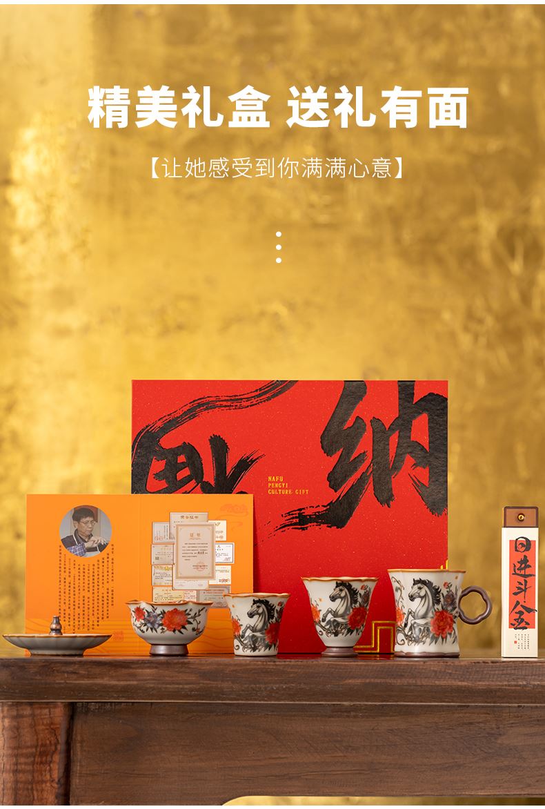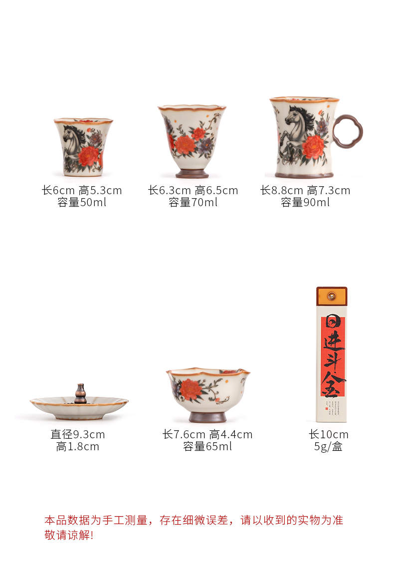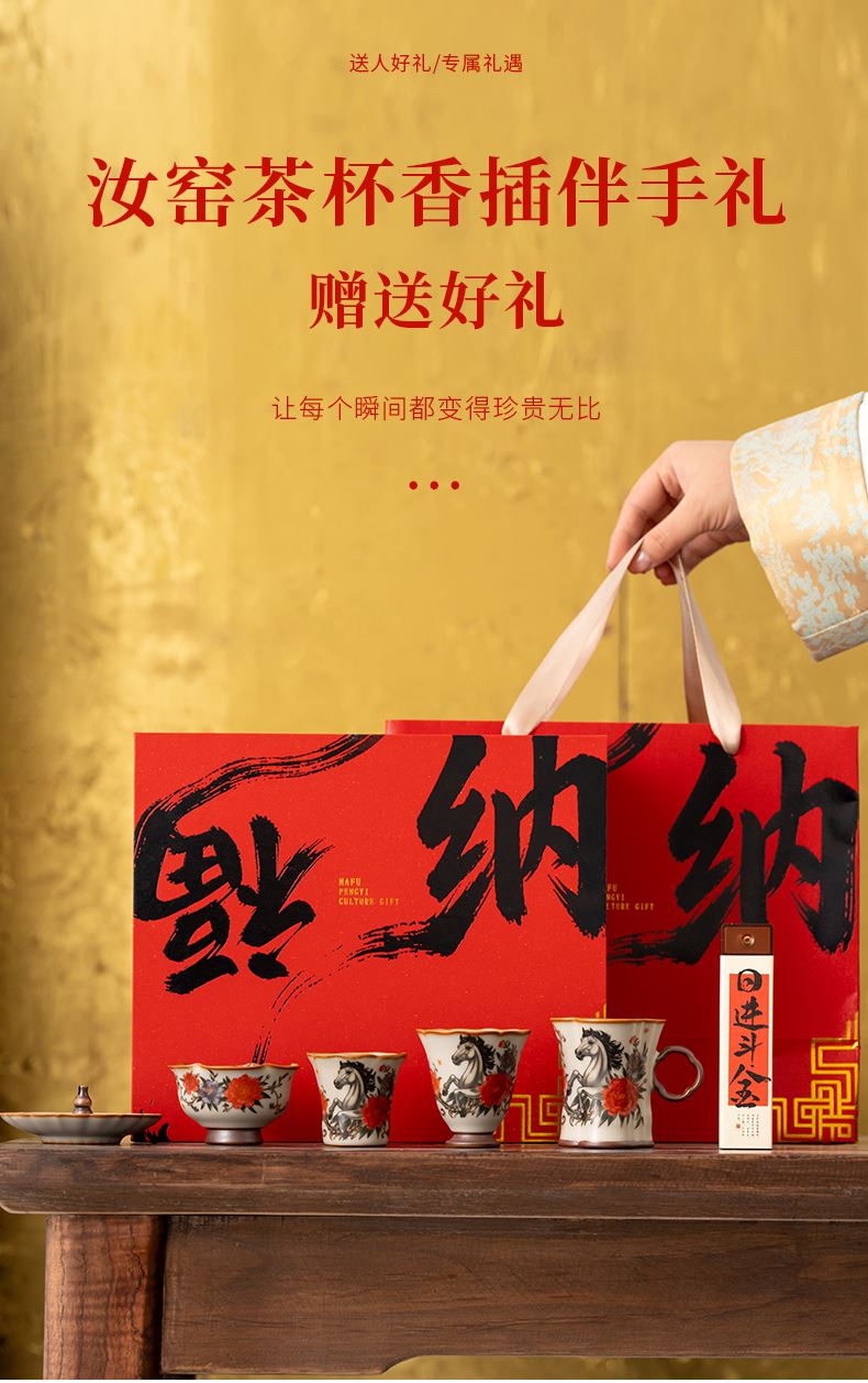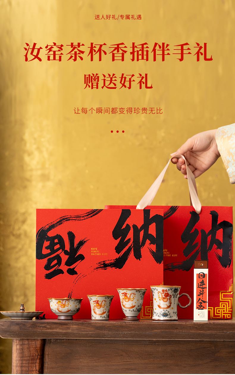 配 制:1手柄杯 1闻香杯 1小杯 1碗 1香盘 1线香 1收藏证书 1礼盒 手提袋 材质:汝黄瓷 檀香 规格:手柄杯 6*9cm 闻香杯6.5*6.3cm 小杯6*5.3cm 碗7.6*4.4cm 香盘9.3*1.8cm 容量:手柄杯70ml 推荐说明:马上有钱,马到成功杯子套装,配日进斗金线香,带香插莲花香盘。亚黄汝瓷,玛瑙入釉,蝉翼开片,内外皆有花面,家有千财万贯,不如汝窑一片。技术新品。画面堆料技术,富有立体浮雕质感,真实感强。杯身开片,可养瓷。