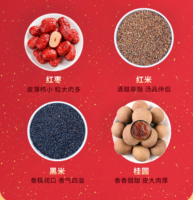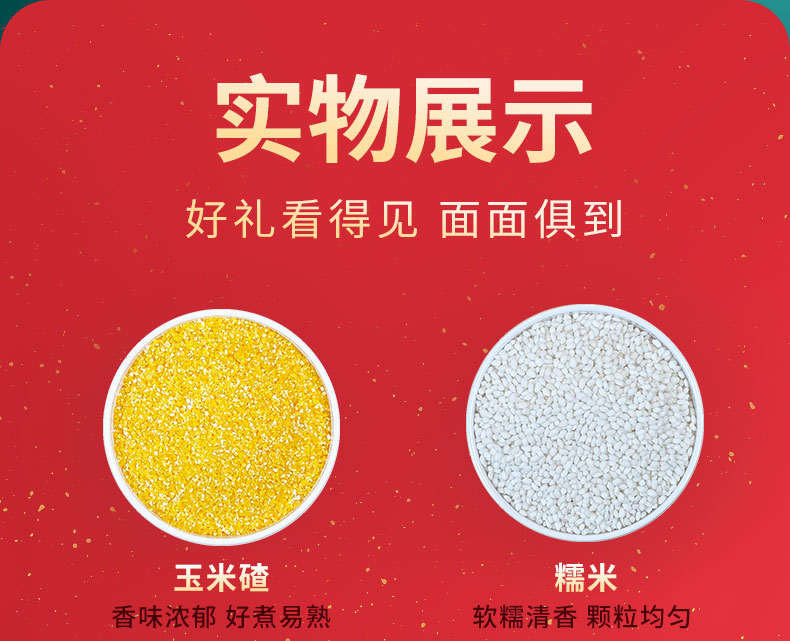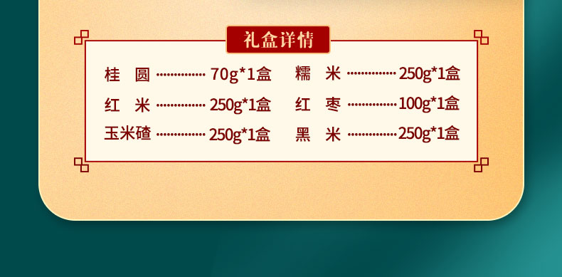 产品规格配置:糯米250g、红米250g、玉米碴250g黑米250g、红枣100g、桂圆70g 手尺寸:34*29.5*5 盒尺寸:32*4.7*28.5cm 箱重量:20.1kg 箱尺寸:50*39*39 箱体积:0.076方
