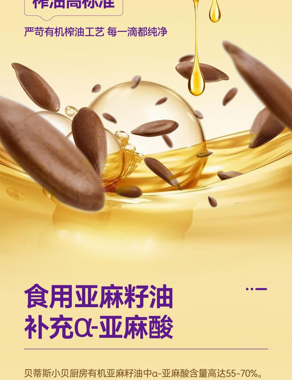 小贝厨房有机亚麻籽油 容量:500ml*2 甄选进口核心产区有机亚麻籽,从亚麻籽成长到出油,全链有机 中国、欧盟、美国的三重有机认证 α-亚麻酸>55% ,更高α-亚麻酸含量的有机亚麻籽油 采用0.5μm级过滤,高标准 去苦留香,口感更好 通过15项欧盟标准检测