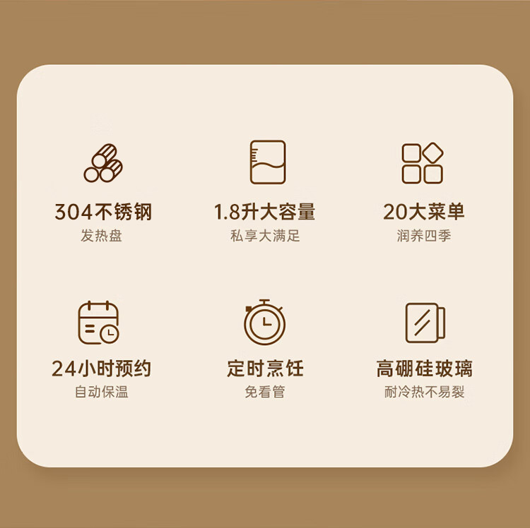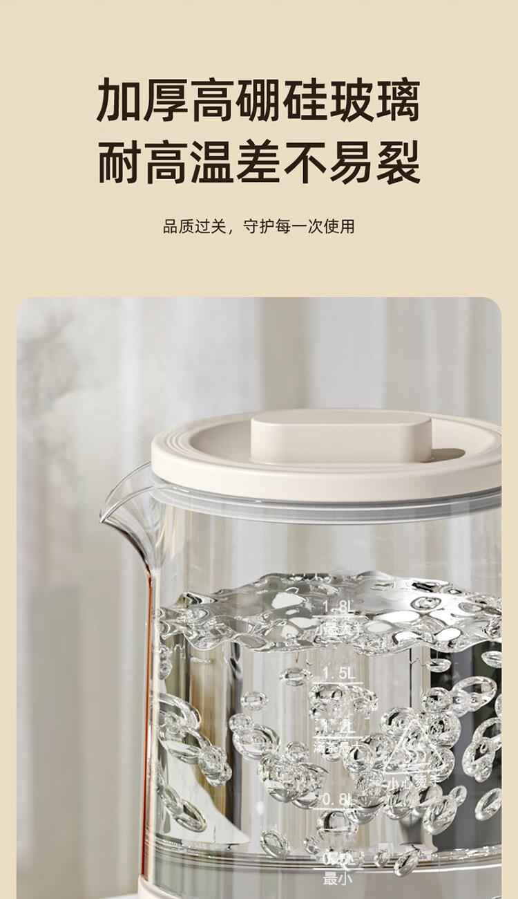 额定电压:220V~ 额定频率:50Hz 额定功率:800W 产品容量:1.8L 重 量:1.3kg 颜 色:米白色 包装尺寸:259*246*242mm 包装清单:壶体、底座、说明书 主要材质:高硼硅玻璃 1.24小时智能预约+保温 2.1.8L大容量,独享畅饮 3.20项功能菜单,美味不重样 4.800W大功率,煮食只需片刻 5.高硼硅玻璃耐高温,冷热交替不易裂