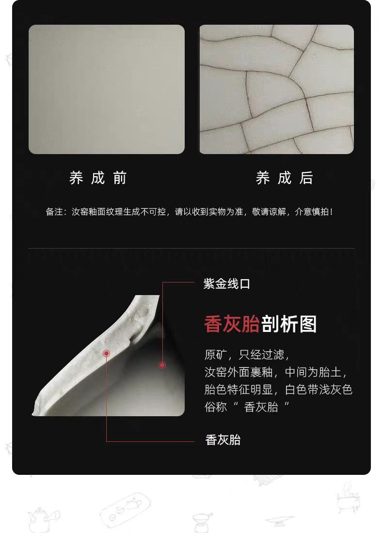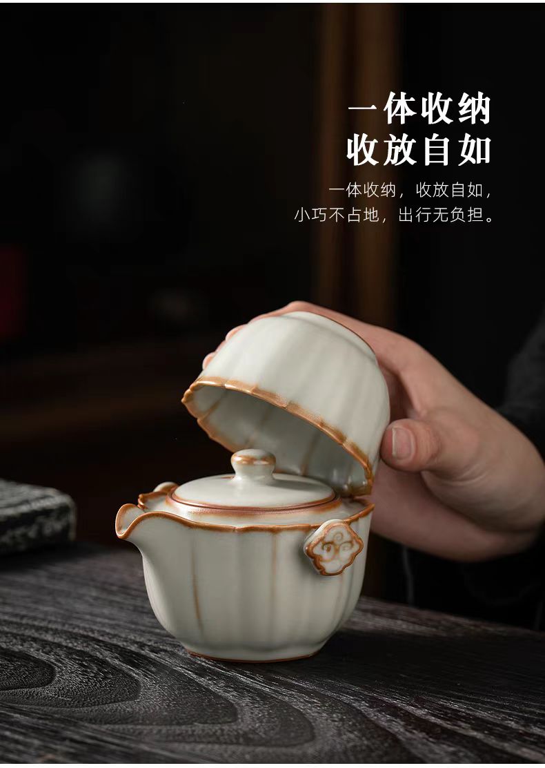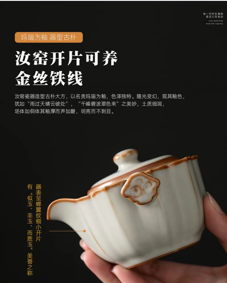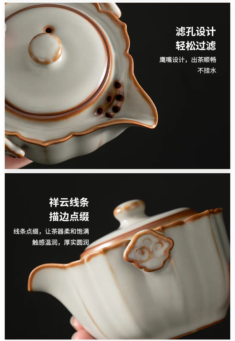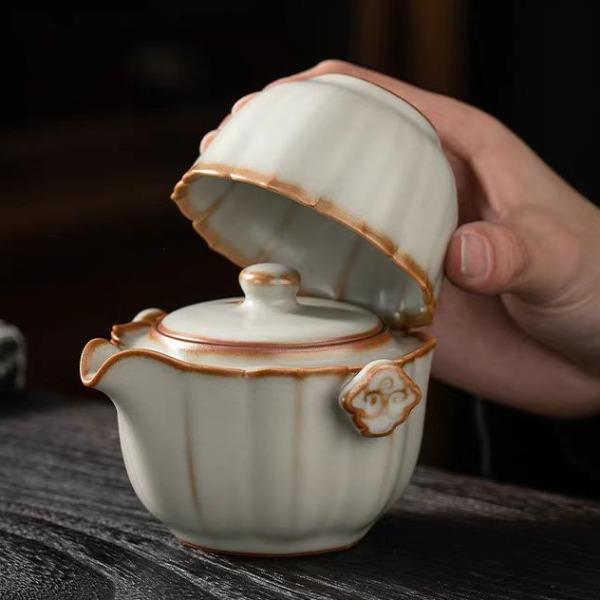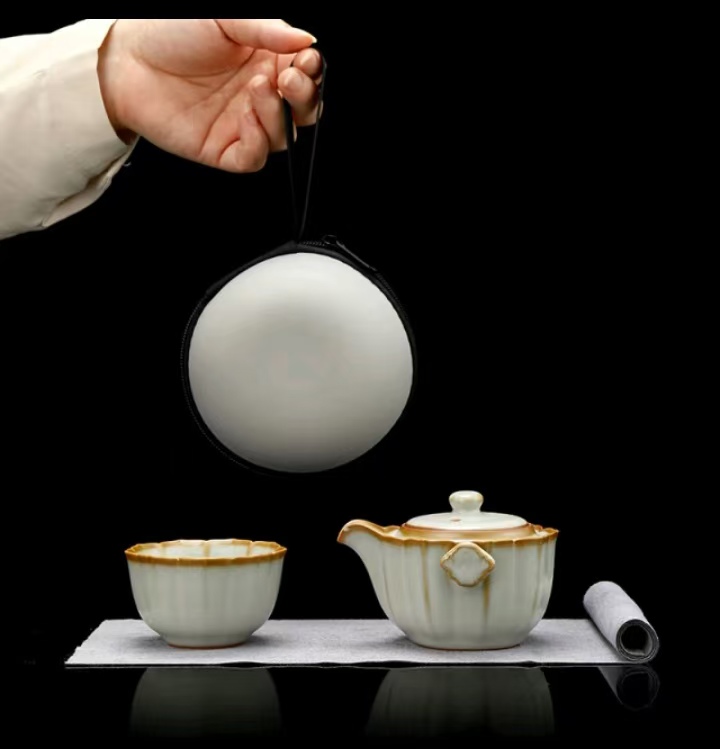 配 制: 1壶 1杯 1茶巾 1旅行包 规格:壶:10*6.9cm 杯 7.3*4.3cm 材质:黄汝瓷 浮雕 推荐说明:亚黄汝瓷,玛瑙入釉,蝉翼开片。技术新品,采用高价优质瓷土,紫口铁足,瓷质上乘,浮雕纹手抓壶。立体浮雕杯身。杯身开片,可养瓷。