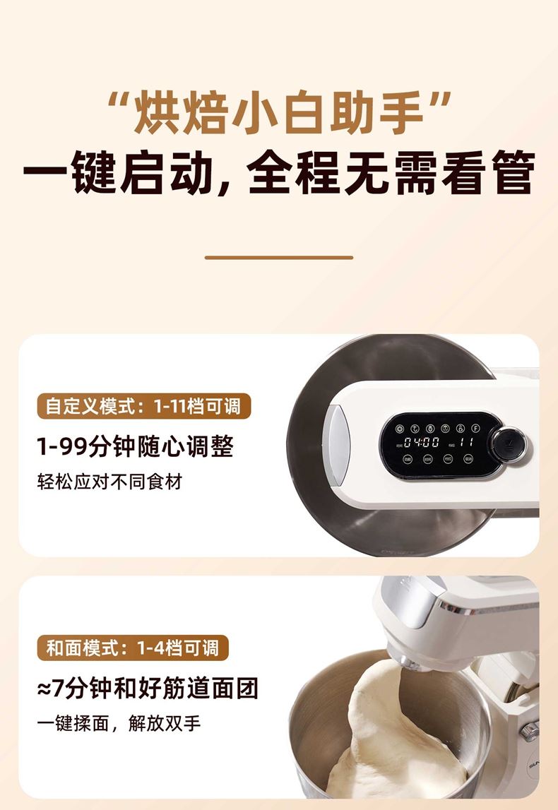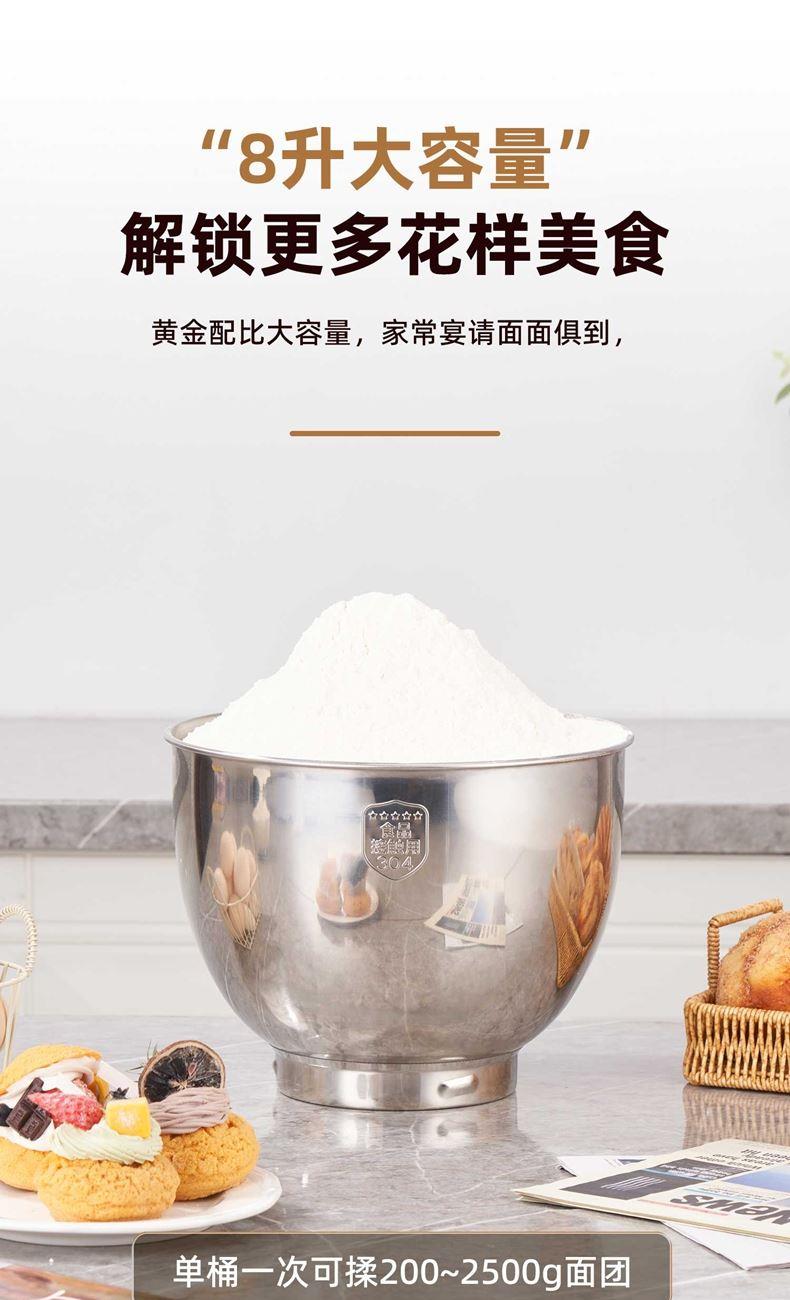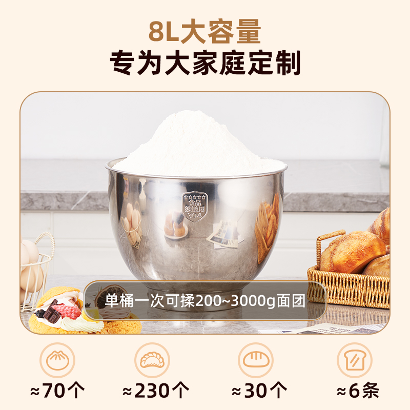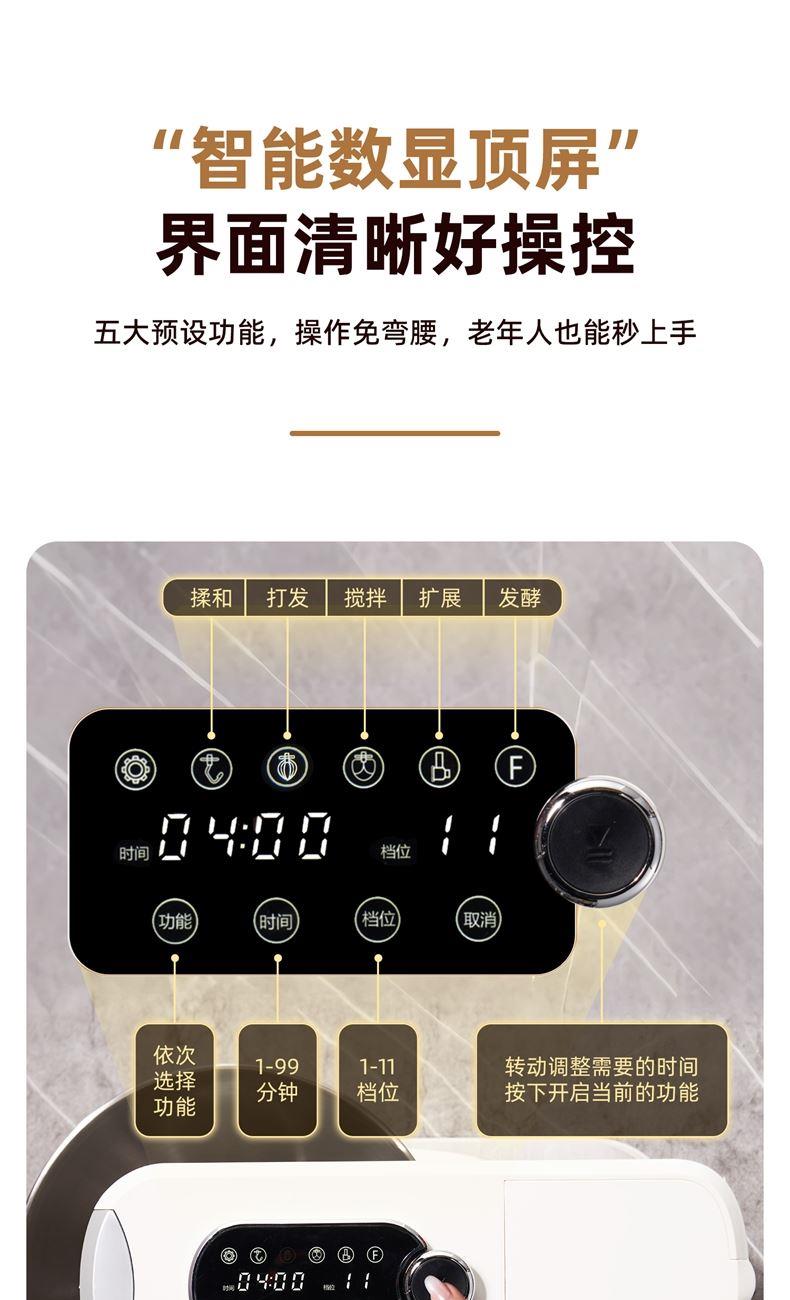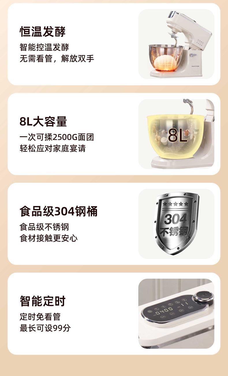 2000W大功率,动力足,快速揉好各种面团; 304 不锈钢材质,模拟专业手法; 11 档灵活调速,8L大容量,满足多口之家或私房烘焙需求; 顶部触控屏,定时恒温发酵,揉面发酵一体化; 底部 6 个吸盘,揉面时稳固机身,减少震动噪音; 可选配扩展配件,解锁更多面条玩法;