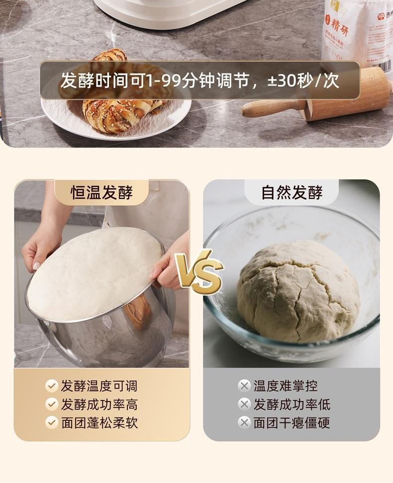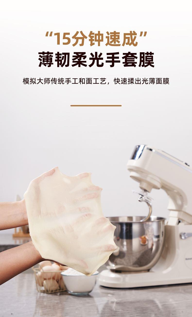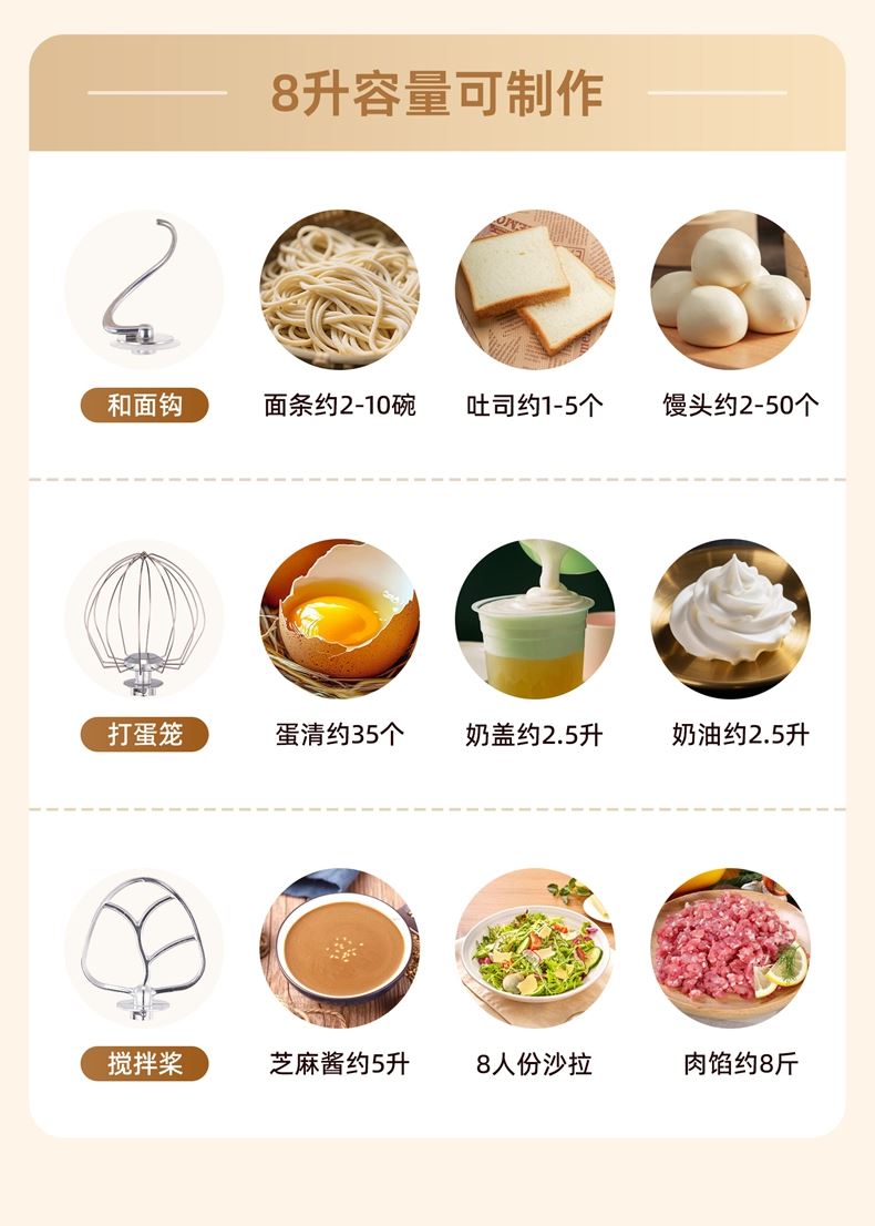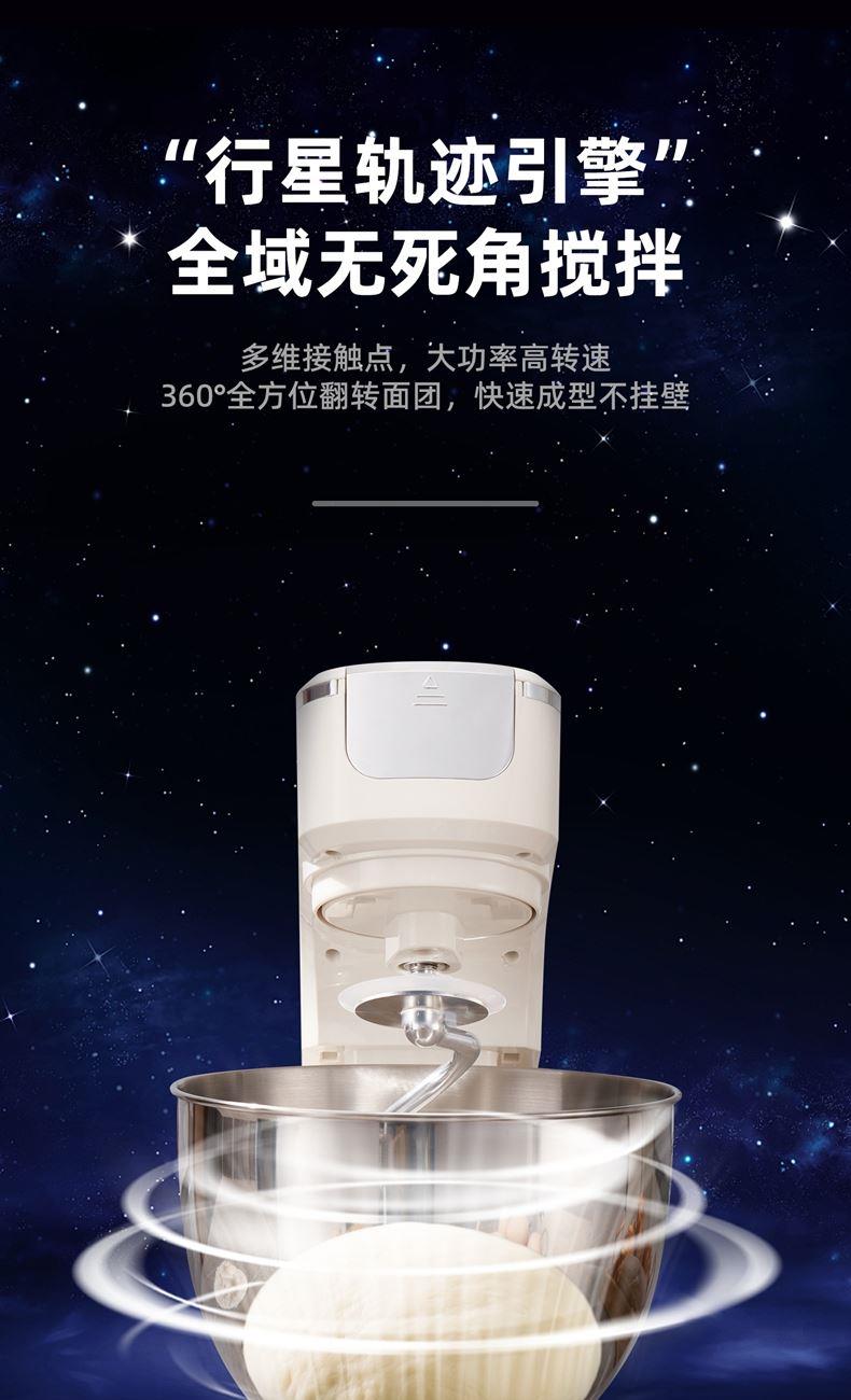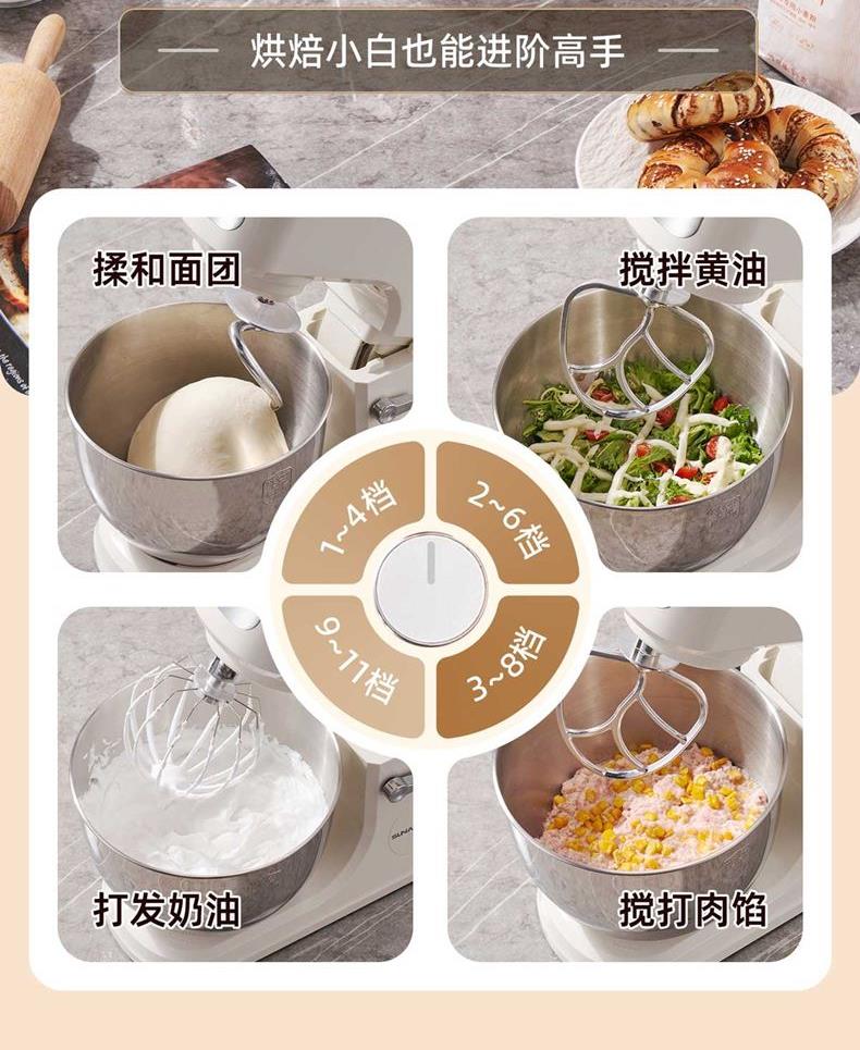 2000W大功率,动力足,快速揉好各种面团; 304 不锈钢材质,模拟专业手法; 11 档灵活调速,8L大容量,满足多口之家或私房烘焙需求; 顶部触控屏,定时恒温发酵,揉面发酵一体化; 底部 6 个吸盘,揉面时稳固机身,减少震动噪音; 可选配扩展配件,解锁更多面条玩法;