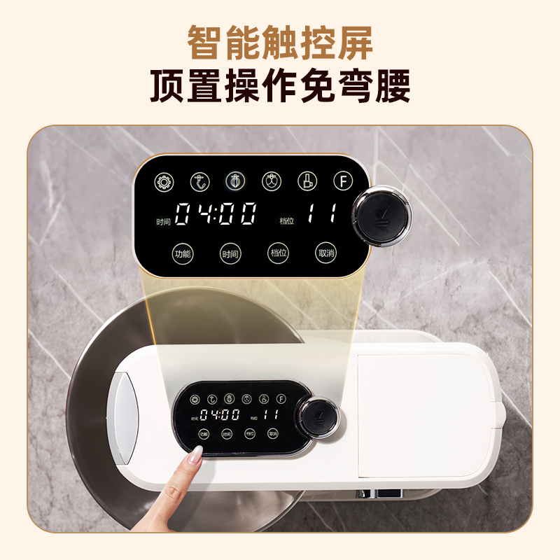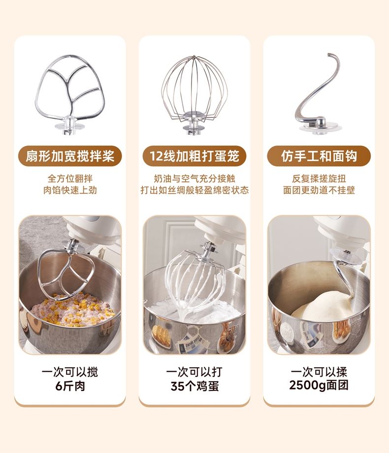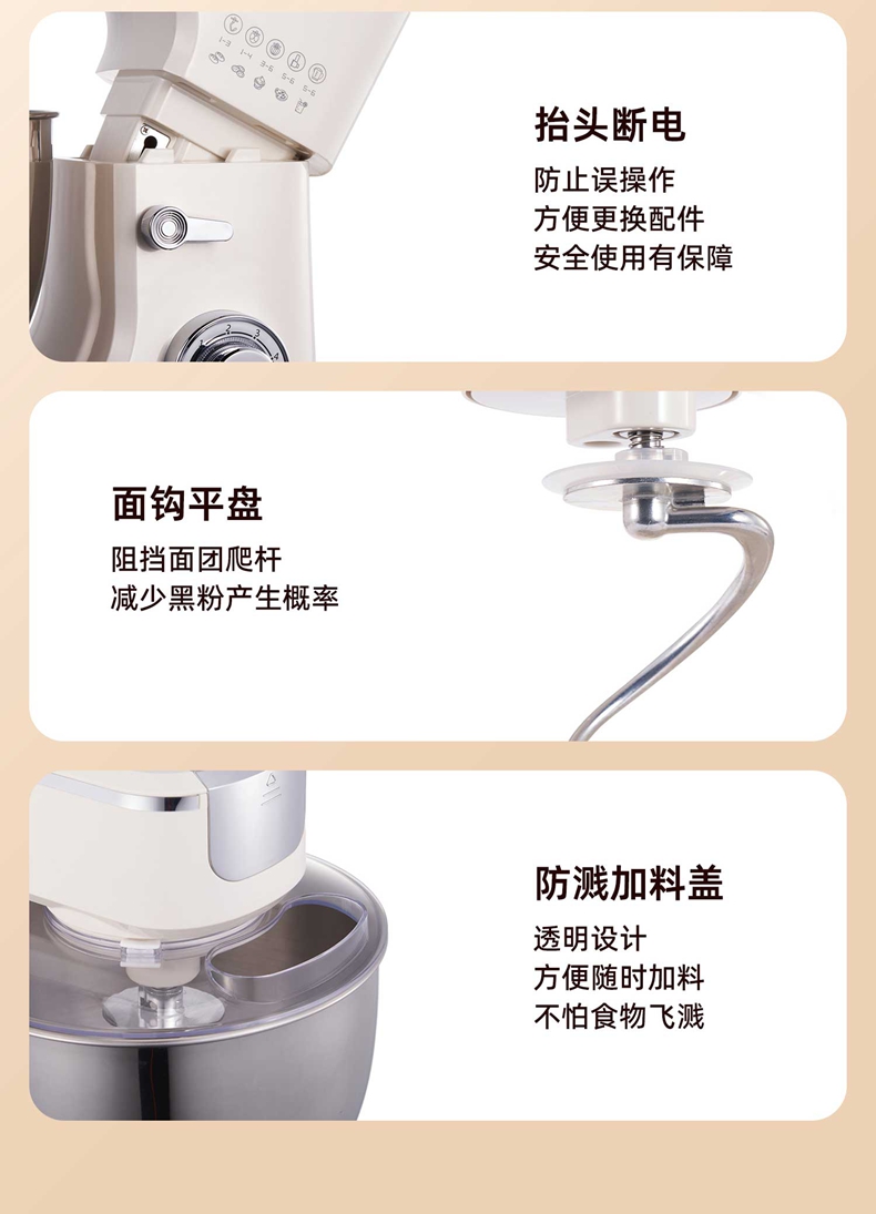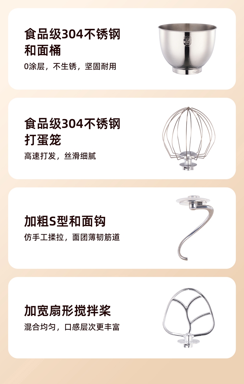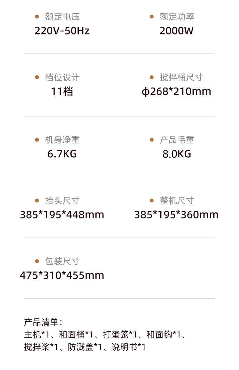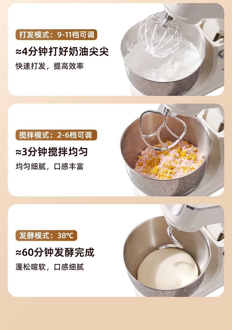2000W大功率,动力足,快速揉好各种面团; 304 不锈钢材质,模拟专业手法; 11 档灵活调速,8L大容量,满足多口之家或私房烘焙需求; 顶部触控屏,定时恒温发酵,揉面发酵一体化; 底部 6 个吸盘,揉面时稳固机身,减少震动噪音; 可选配扩展配件,解锁更多面条玩法;